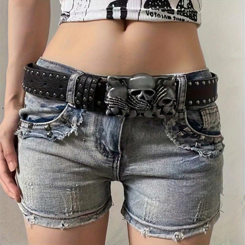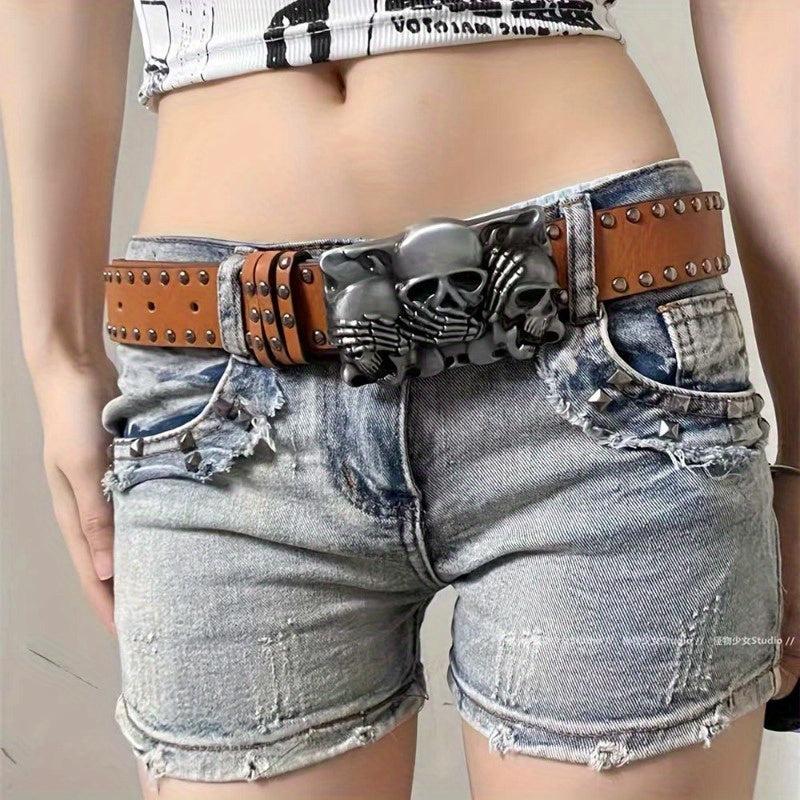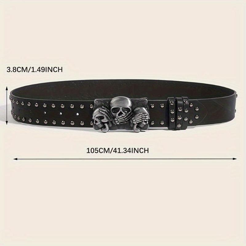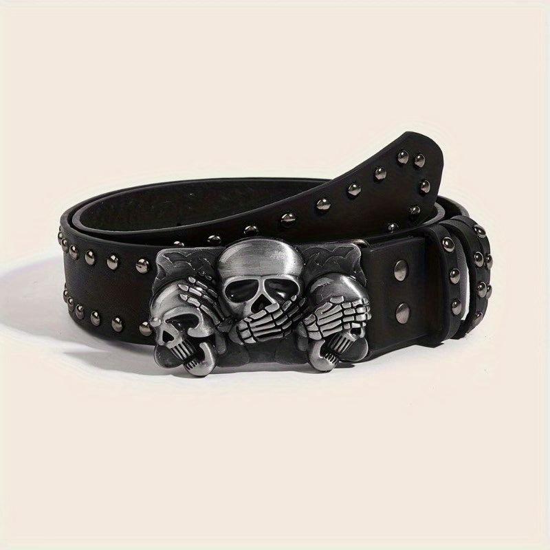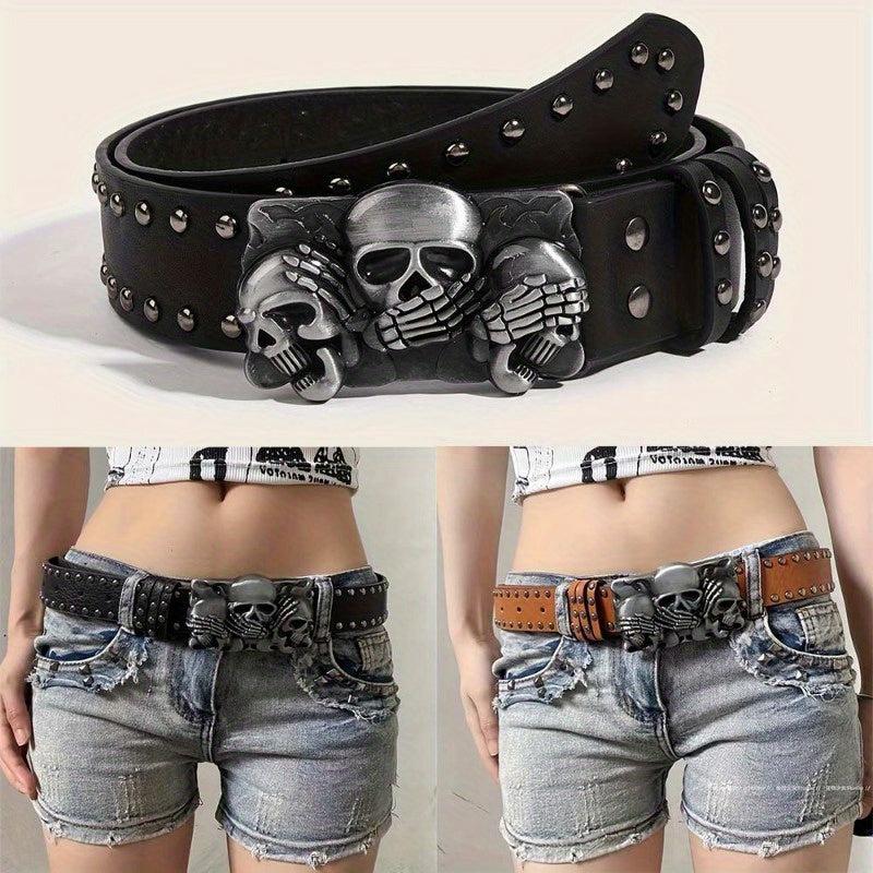 Add a touch of punk style to your outfit with this skull and skeleton hand belt. Perfect for Halloween or adding a gothic twist to your look.