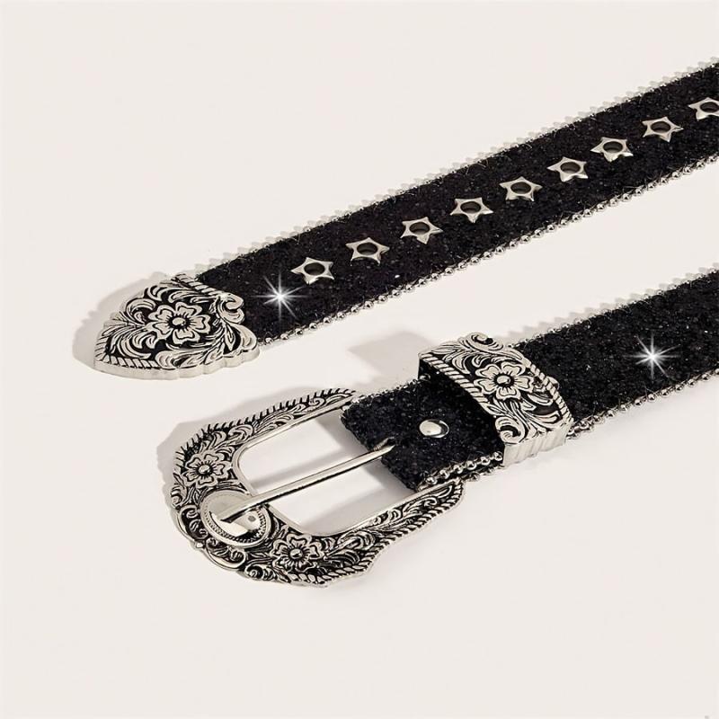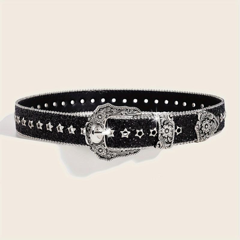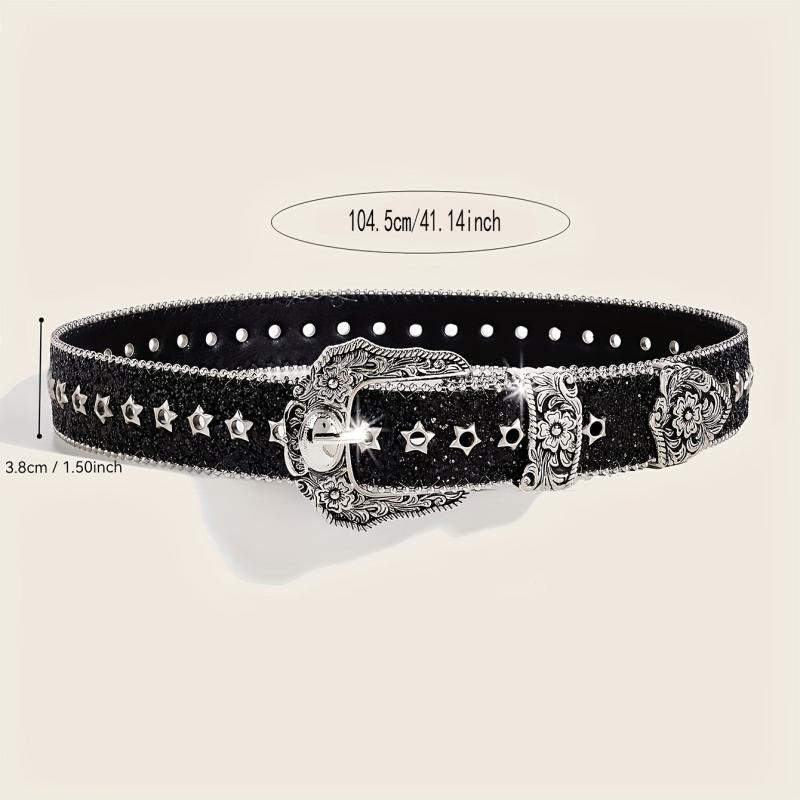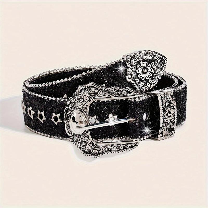 Elevate your style with this vintage inspired sequin belt featuring a unique carved buckle. Perfect for everyday wear or date nights.