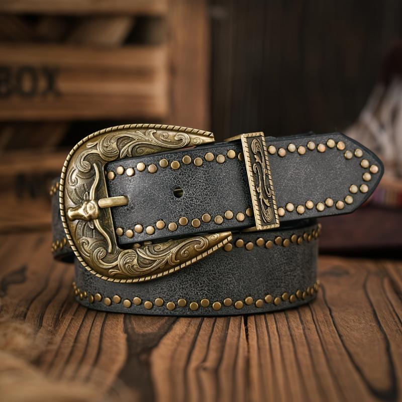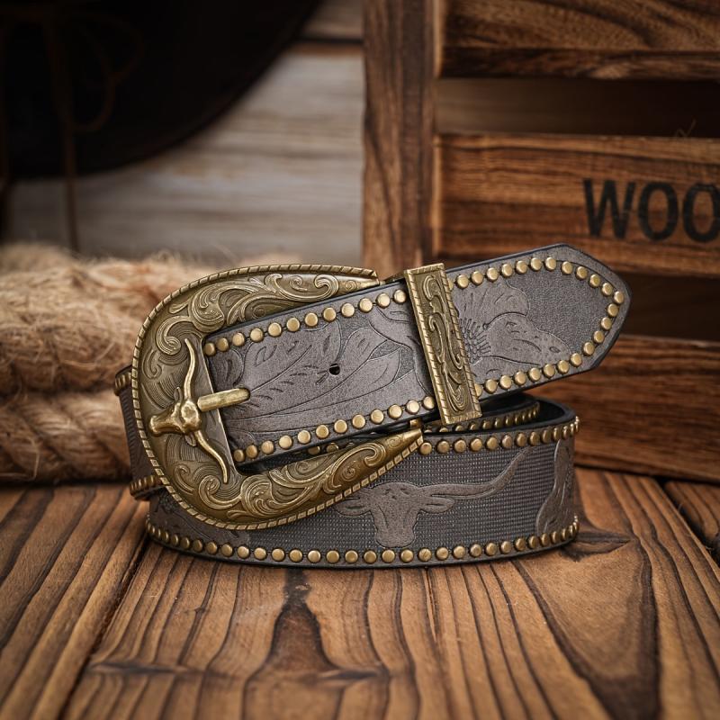 Add a touch of bohemian style to your outfit with this embossed bull head buckle belt. Made of vintage brown PU with rivet detail, this belt is suitable for men and women.