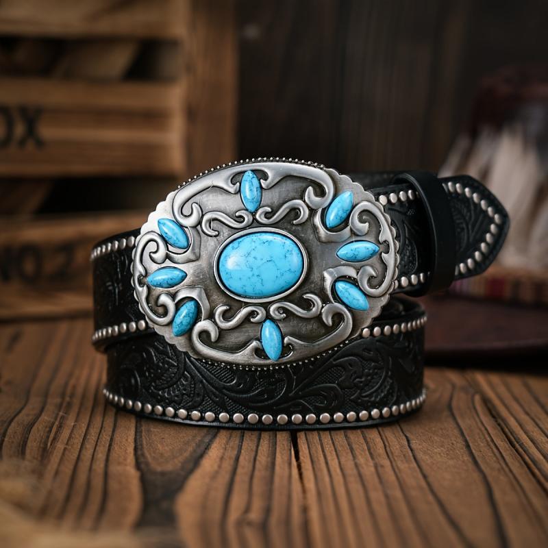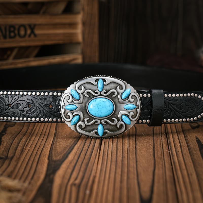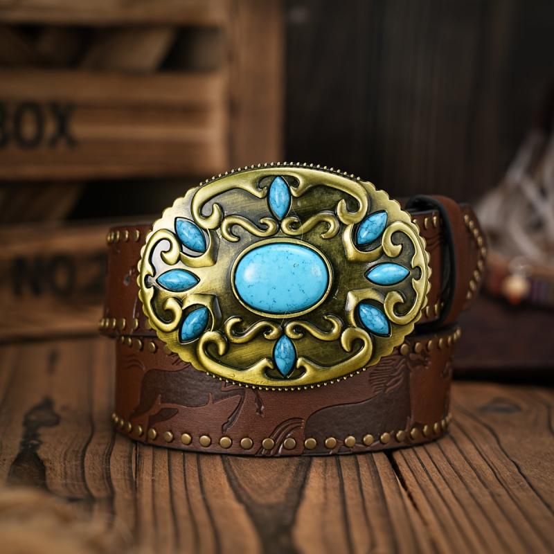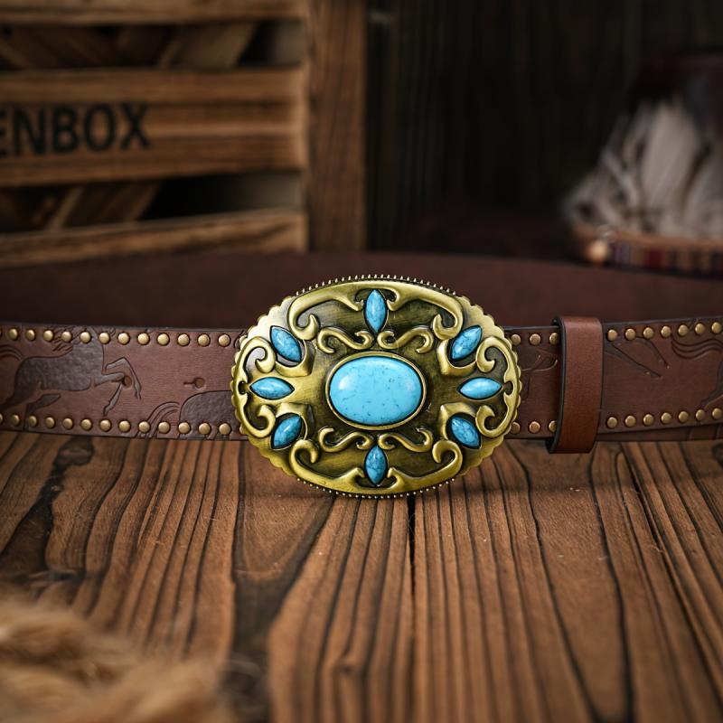 Embrace a timeless western look with this unisex casual belt. Featuring an embossed gemstone metal buckle, studded design, and brown PU leather for a vintage charm.