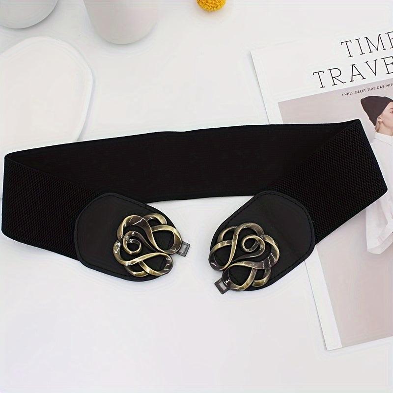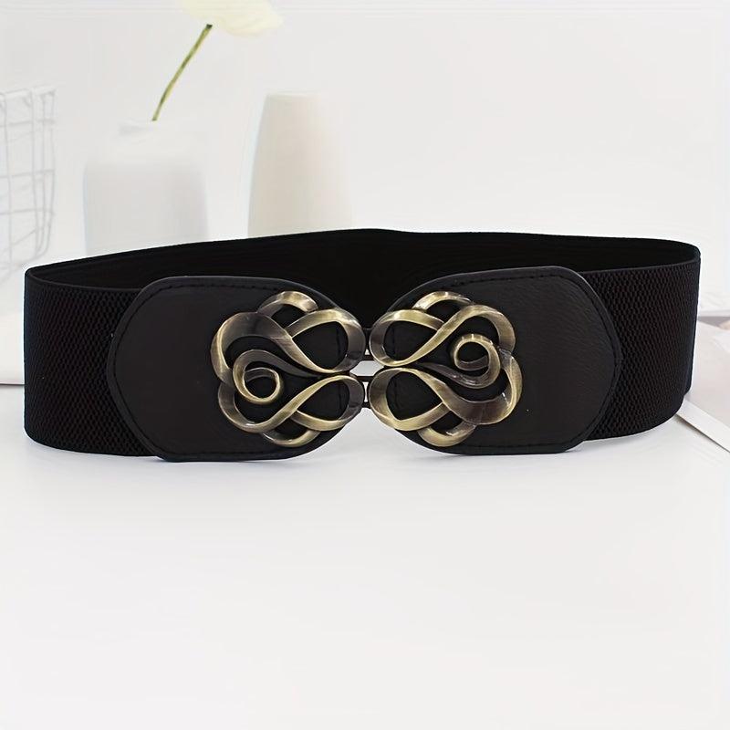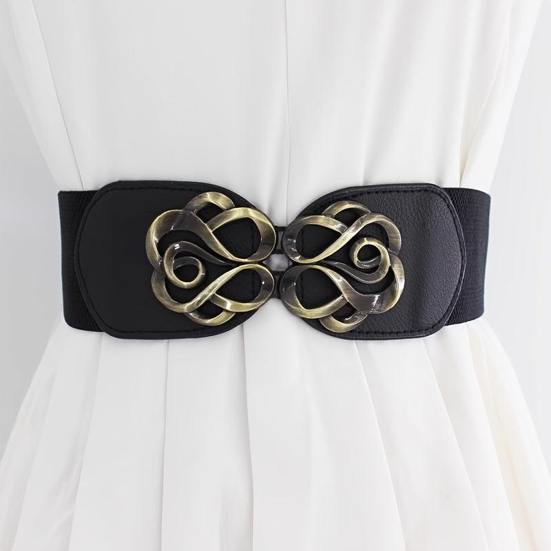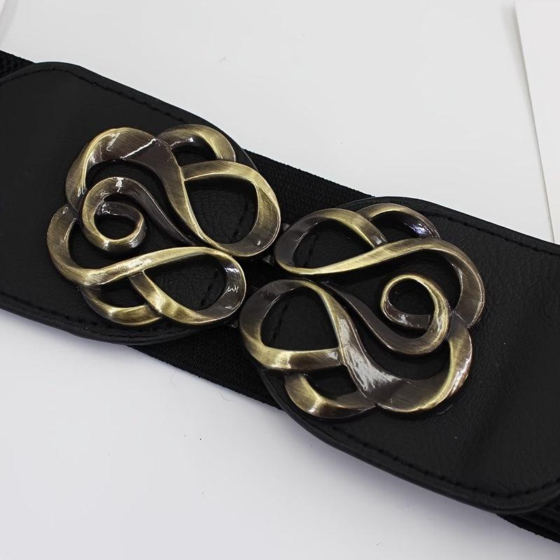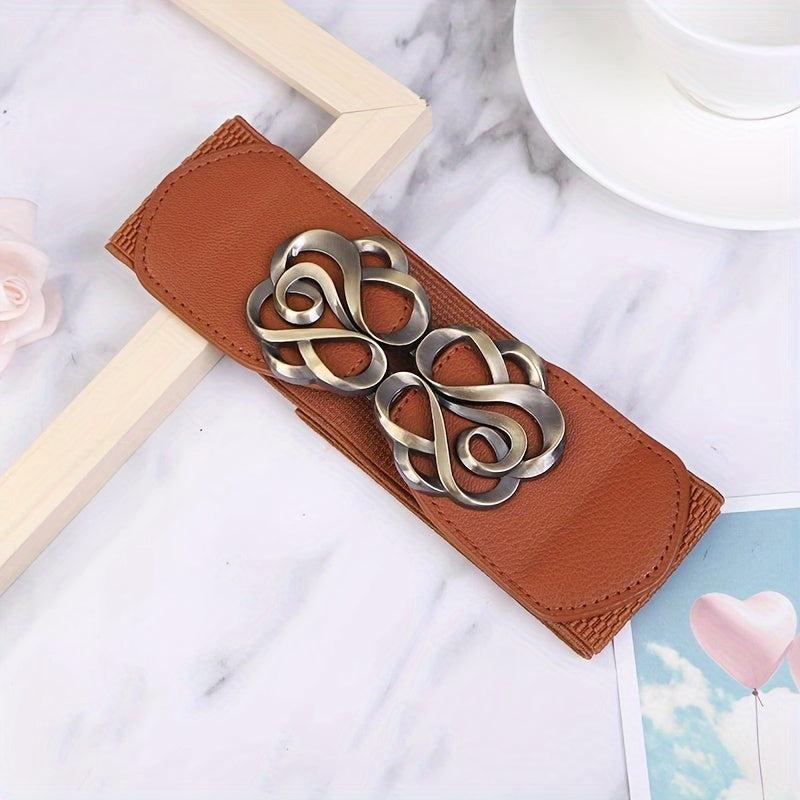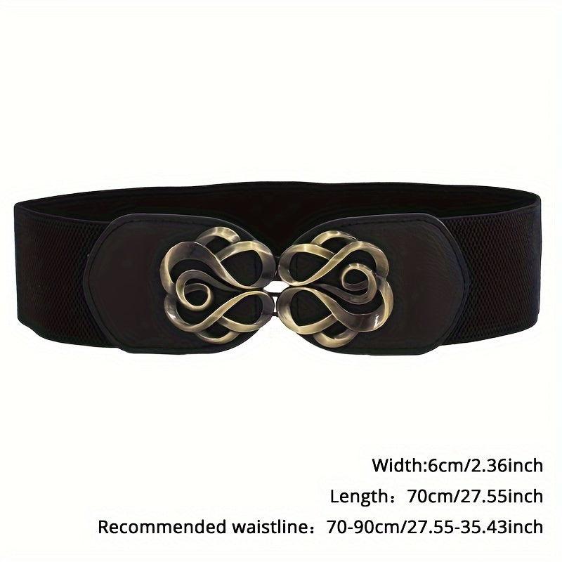 This Women's Vintage Elastic Wide Belt features a Camel Celtic Knot Buckle, perfect for Beach Party, Wedding, Casual Outings. Adjustable Belt with Celtic Knot design.