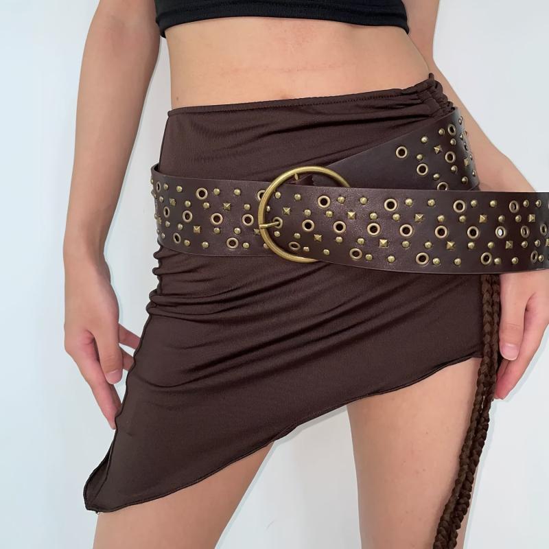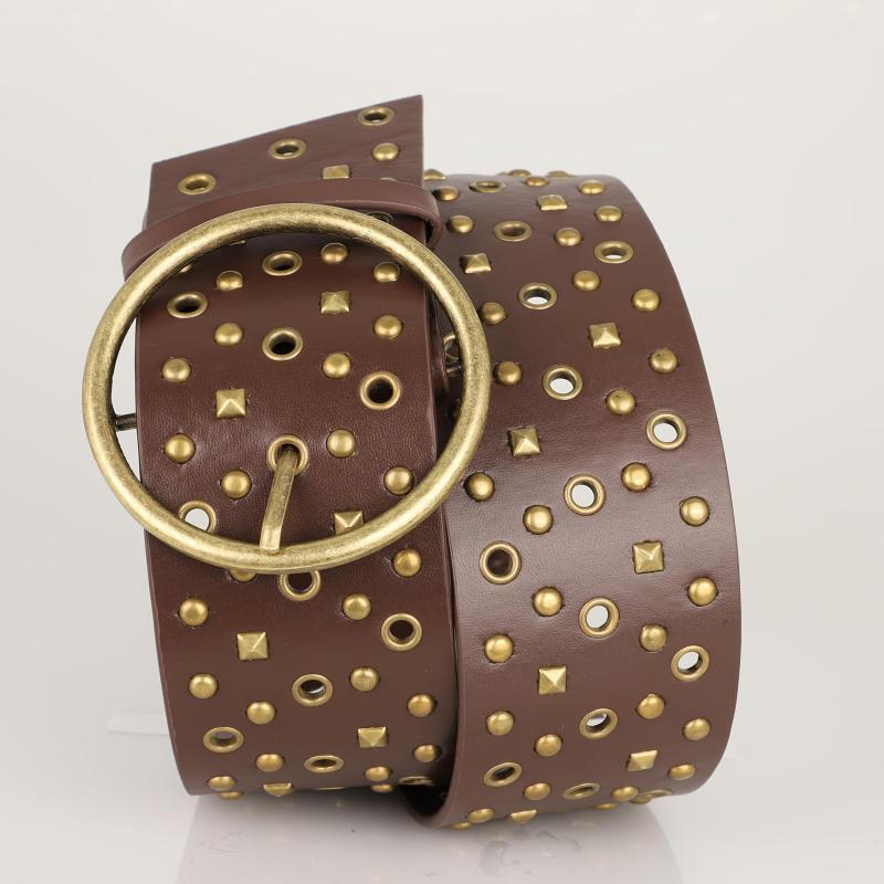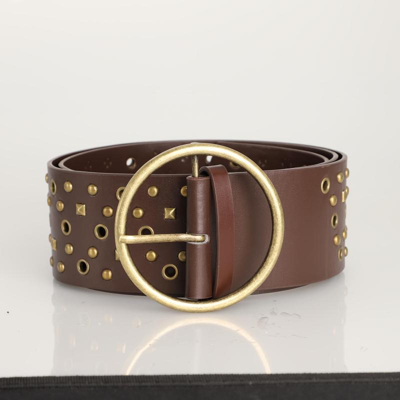Vintage Ethnic Style Wide Waist Belt w/ Golden Rivets & Round Buckle