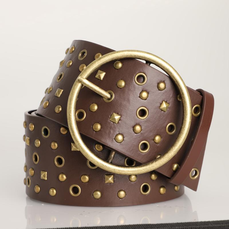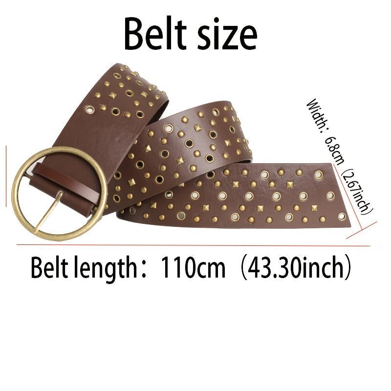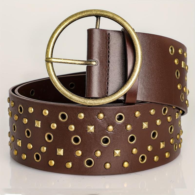 Elevate your casual daily wear with this vintage women's waist belt featuring an antique bronze round buckle and golden rivets. The ethnic style adds a touch of uniqueness to your outfit.