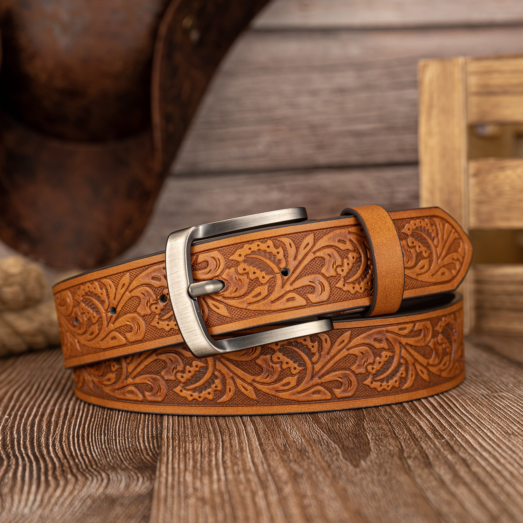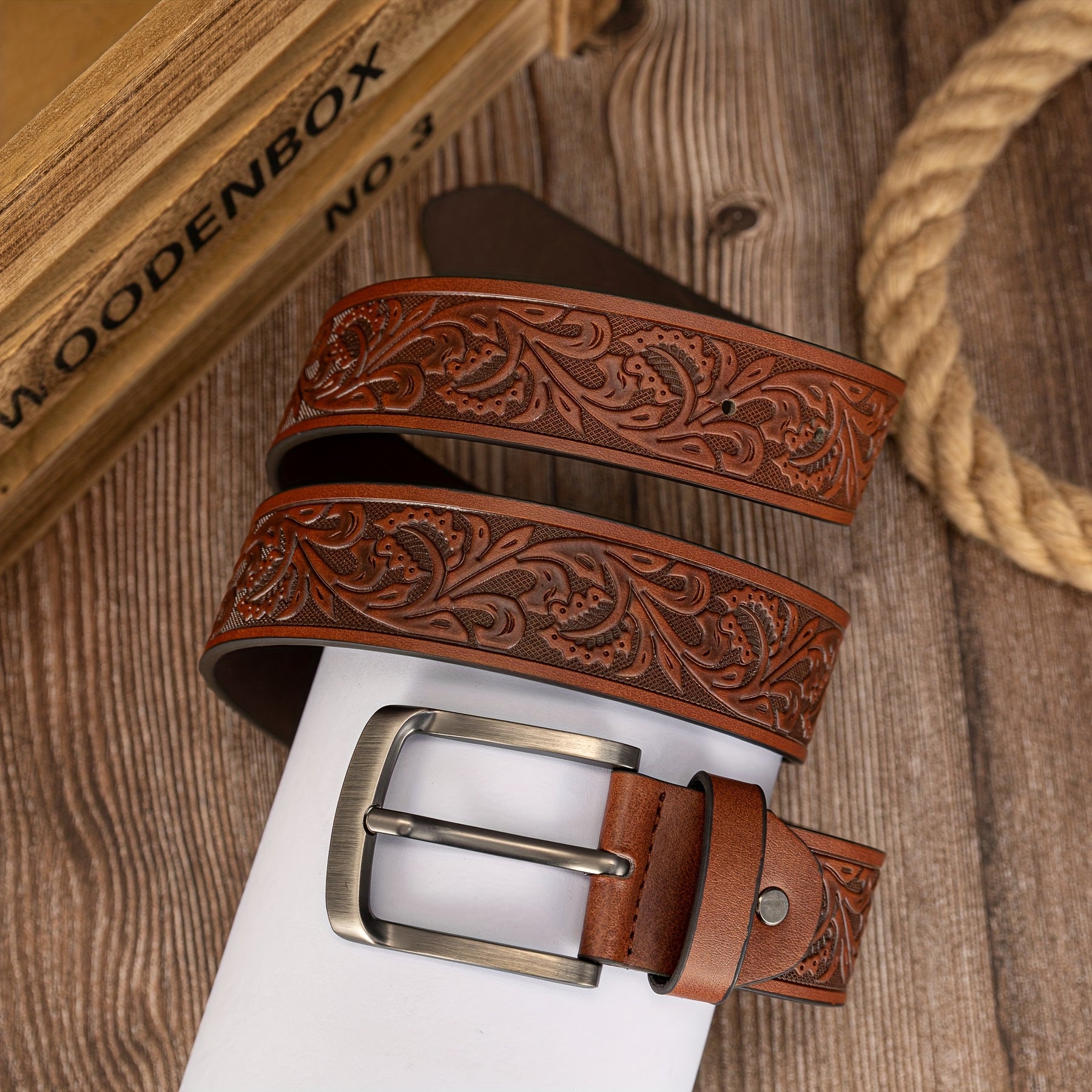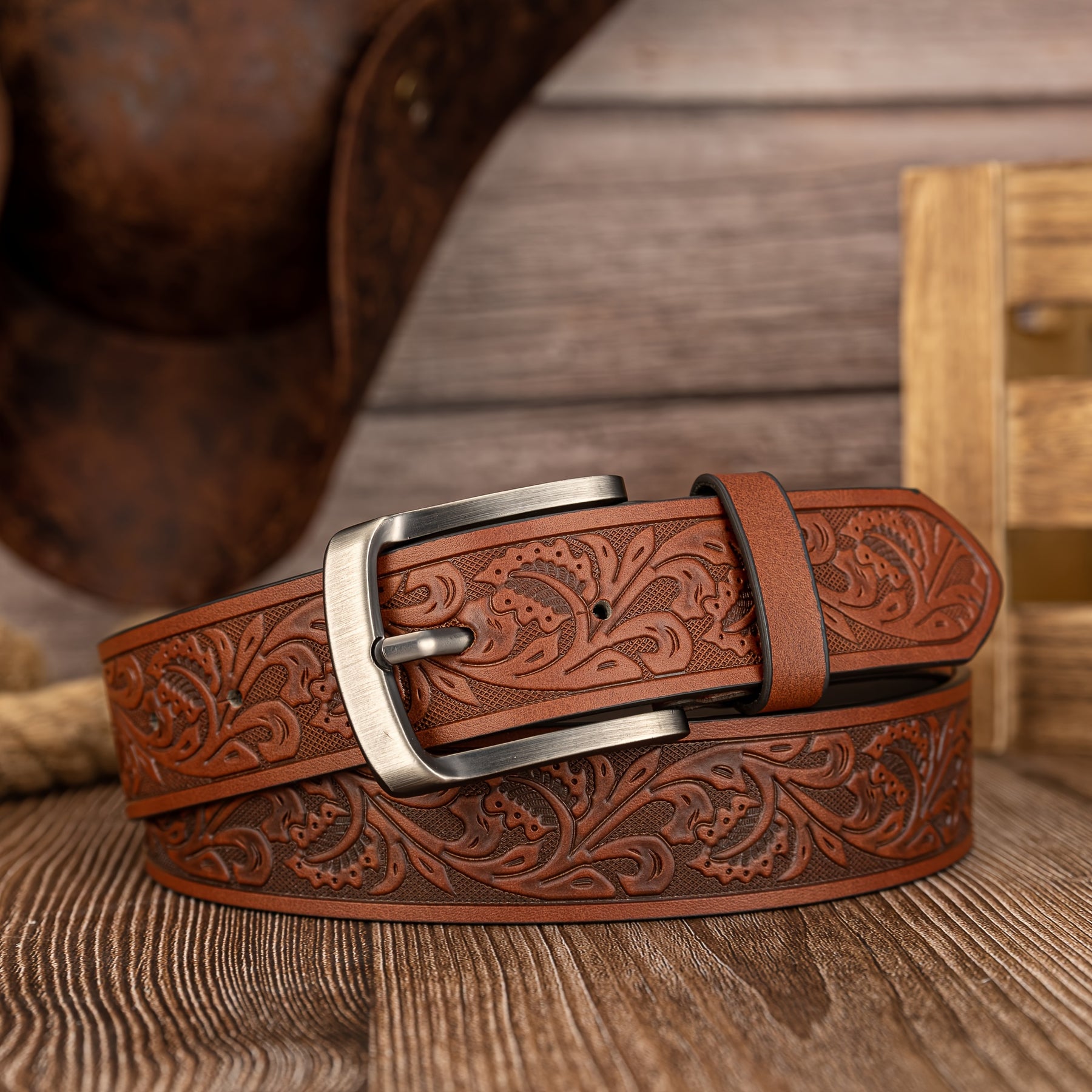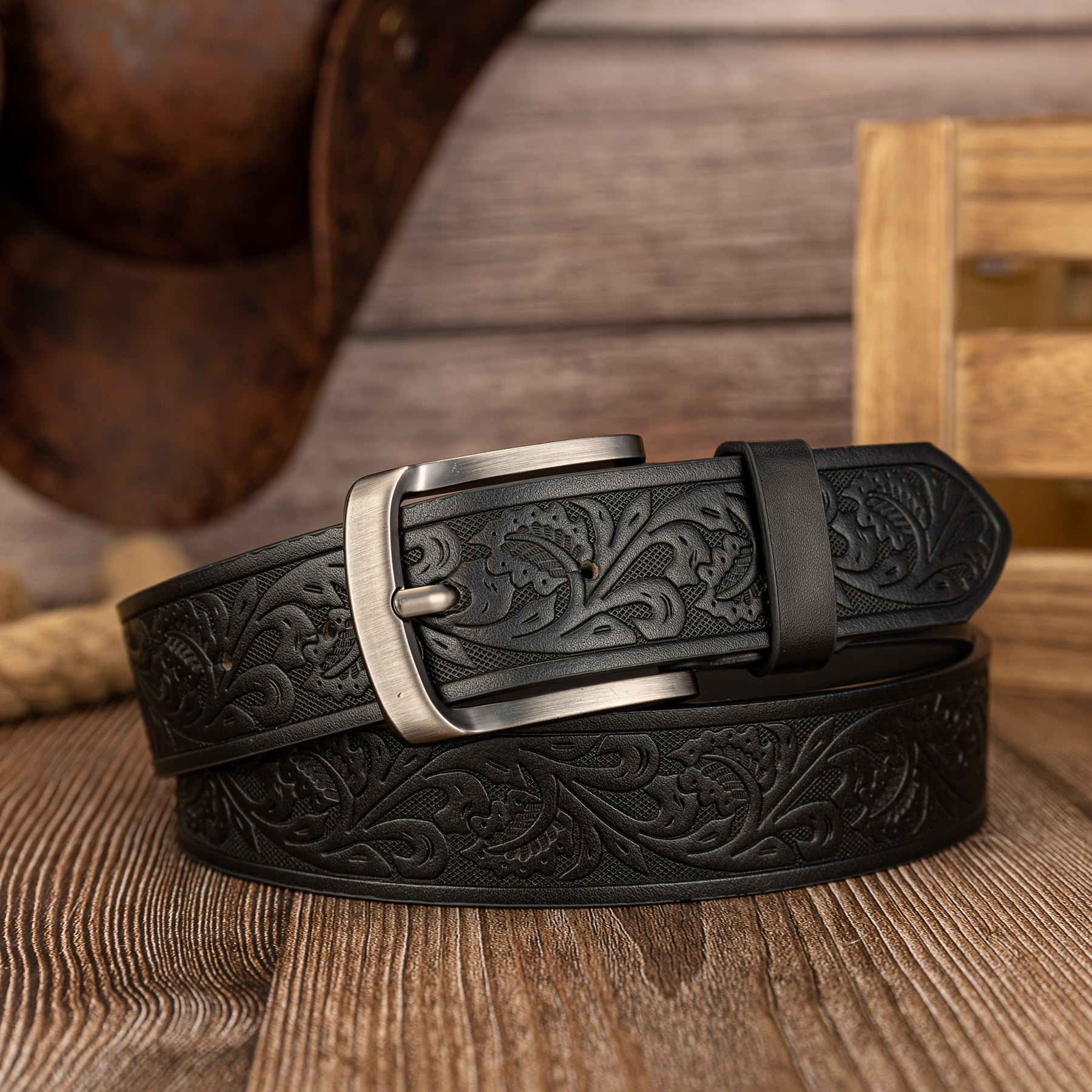 This men's belt features a vintage leaf pattern with embossed PU leather, and a stylish alloy shaped buckle for a preppy look.