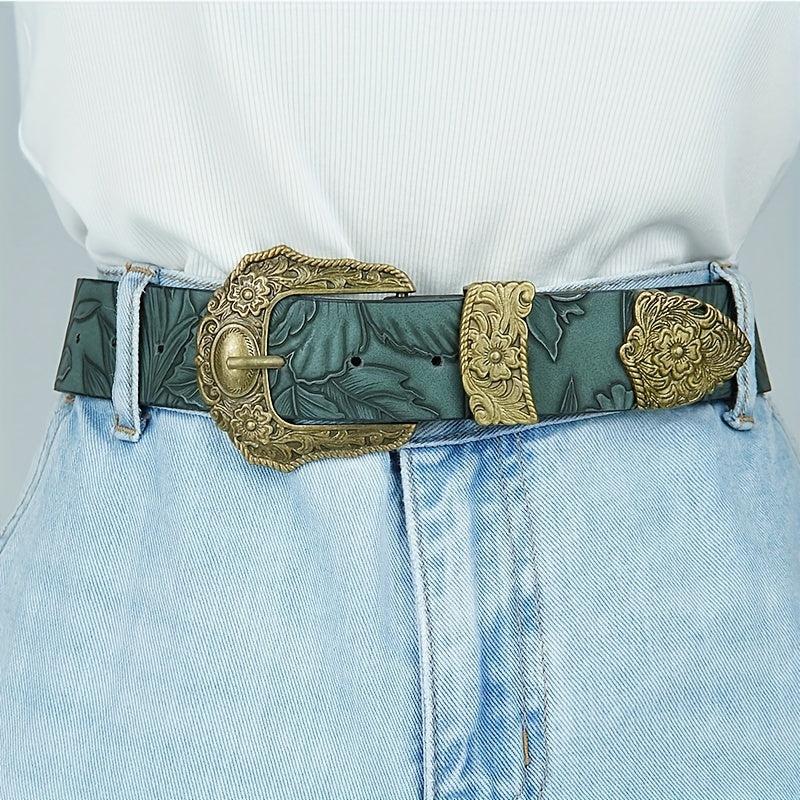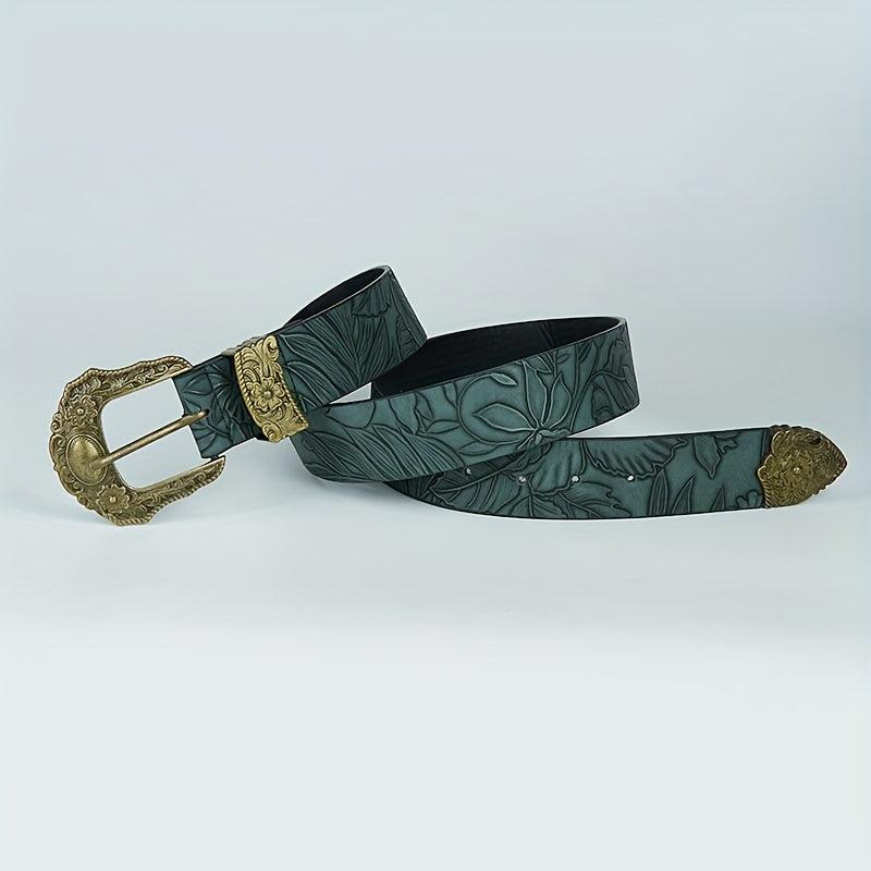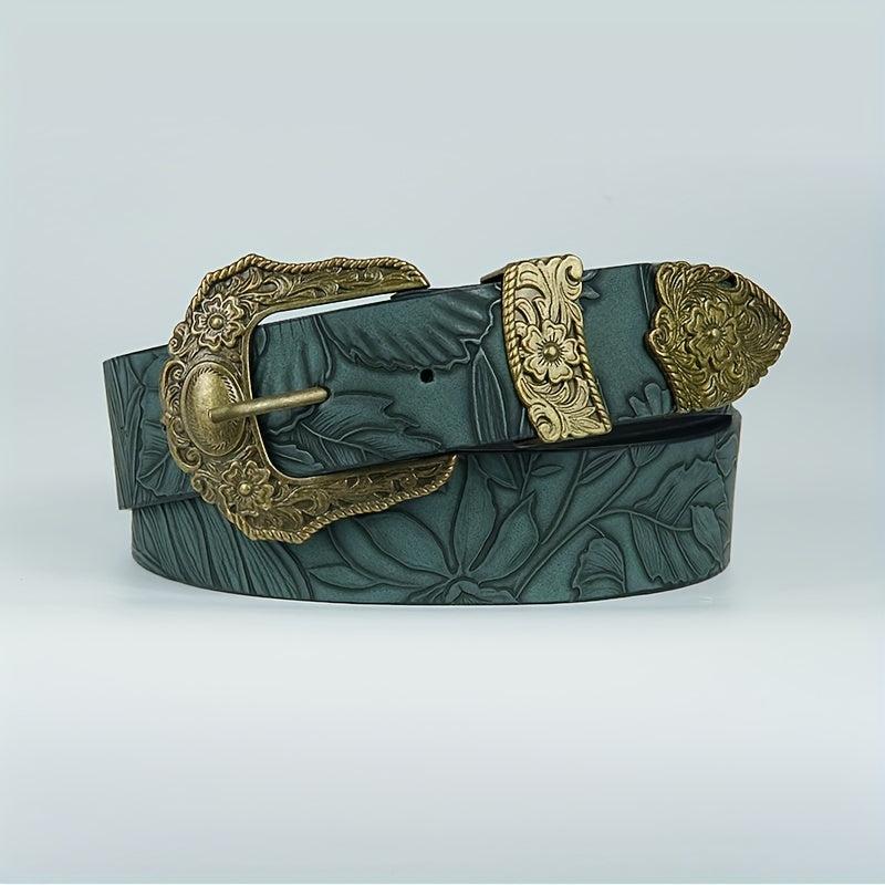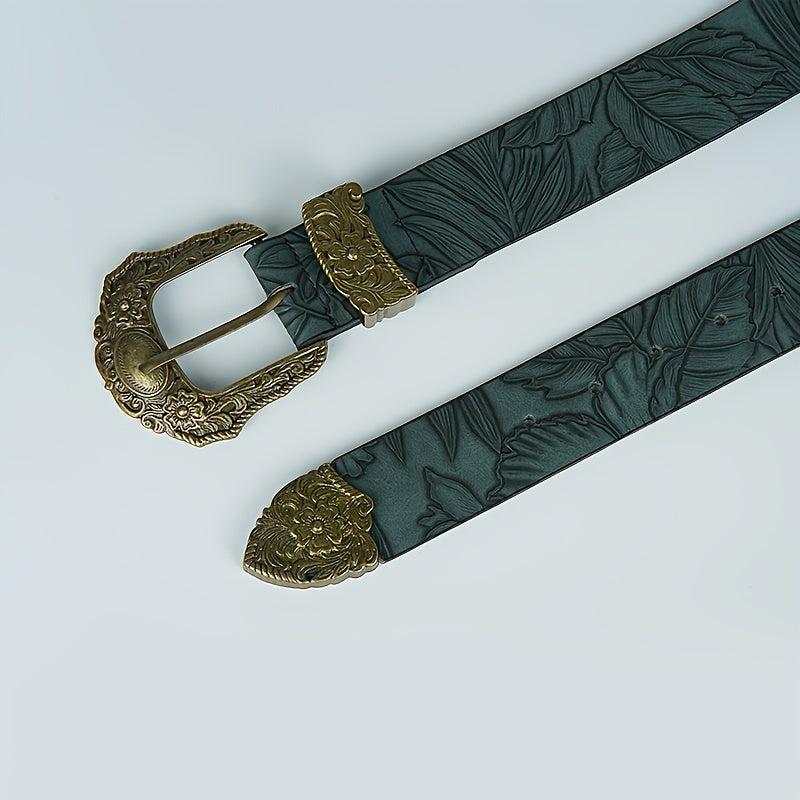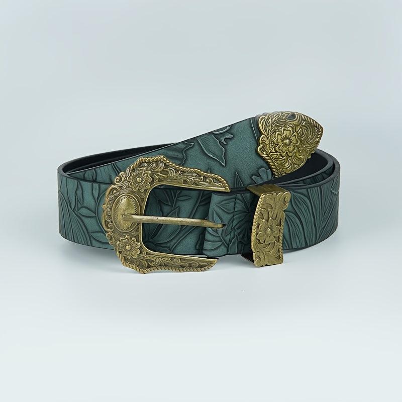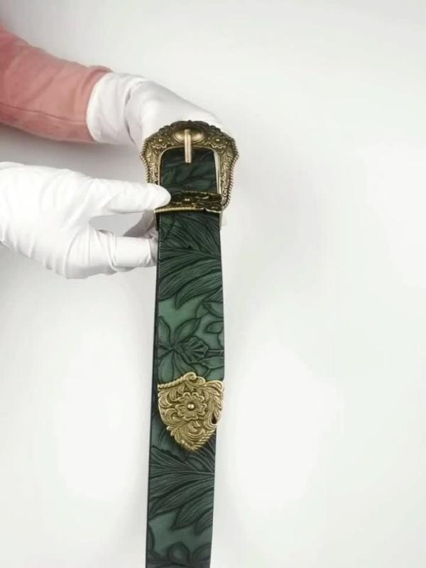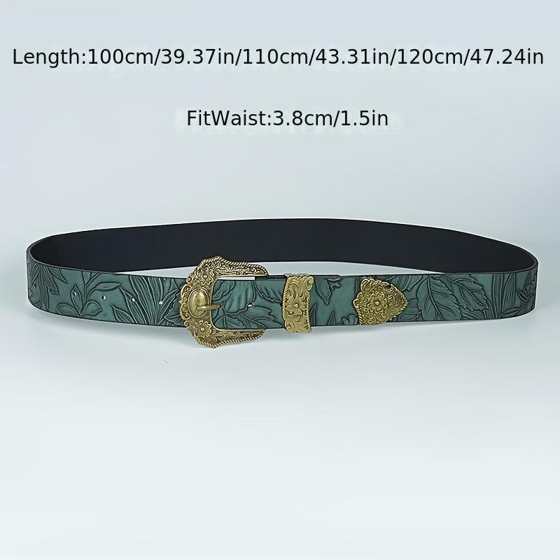 Add a touch of vintage preppy style to your outfit with this dark green belt featuring a carved bronze alloy buckle. Ideal for pairing with dresses, jeans, or shirts, this versatile accessory is perfect for daily wear or the weekend.