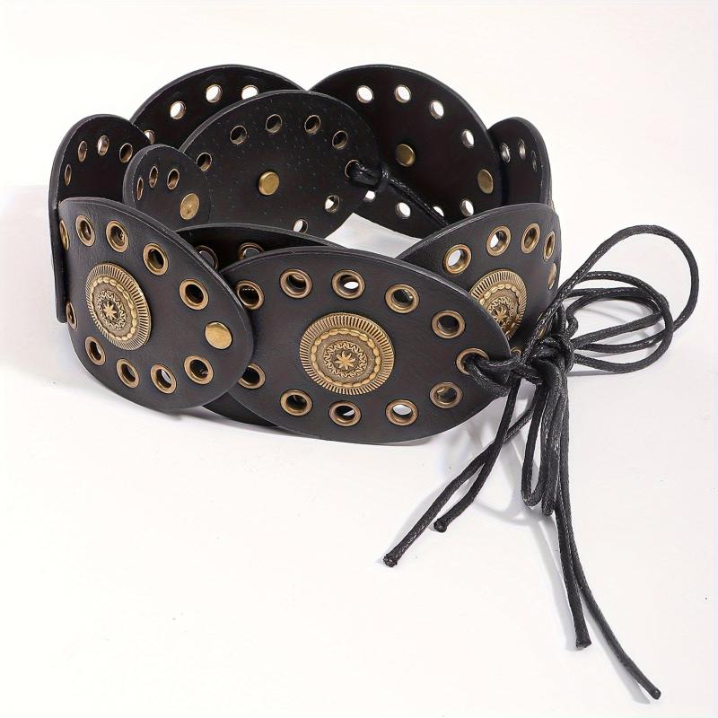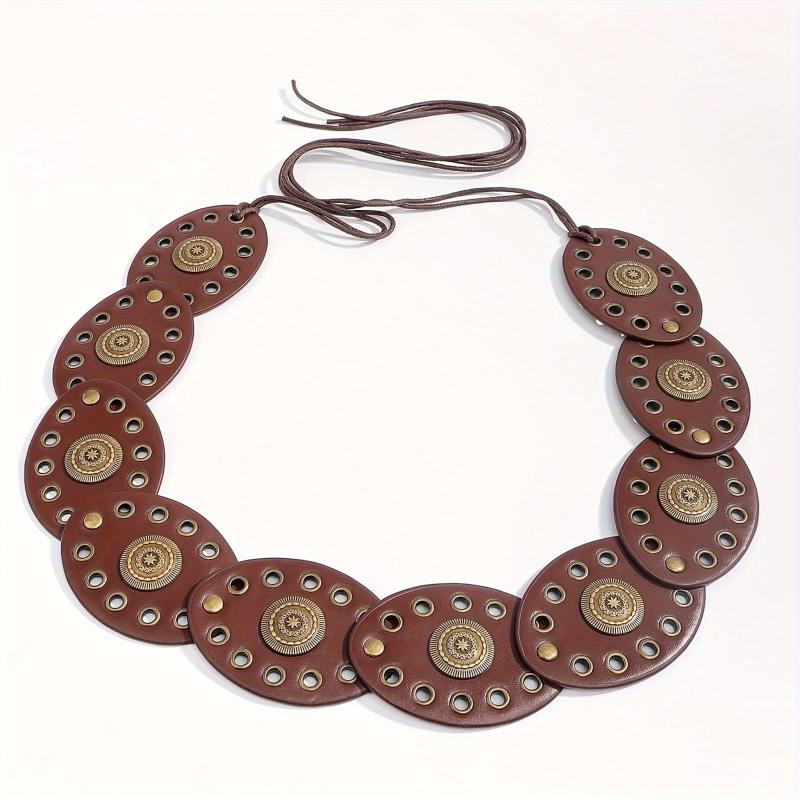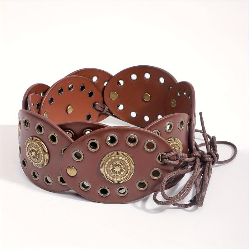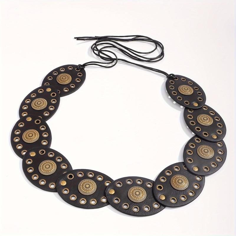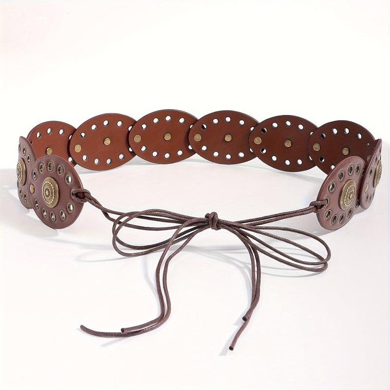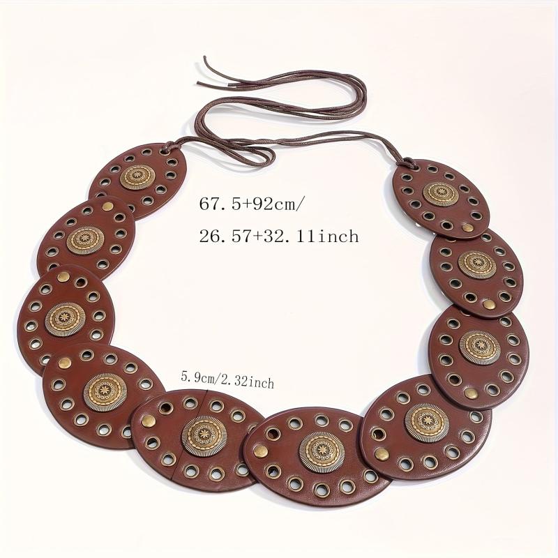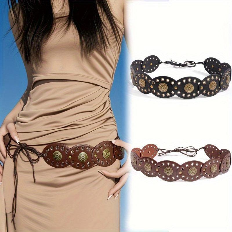 This elegant belt features a vintage Western style with golden tone metallic accents. It is perfect for casual beach outings and evening outfits. The adjustable drawstring waistband ensures a comfortable fit.