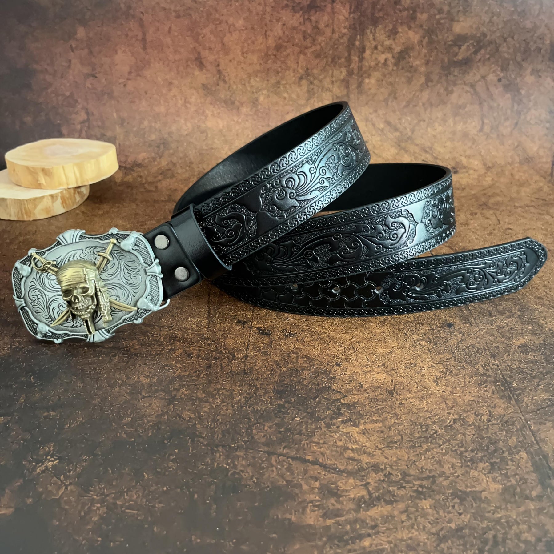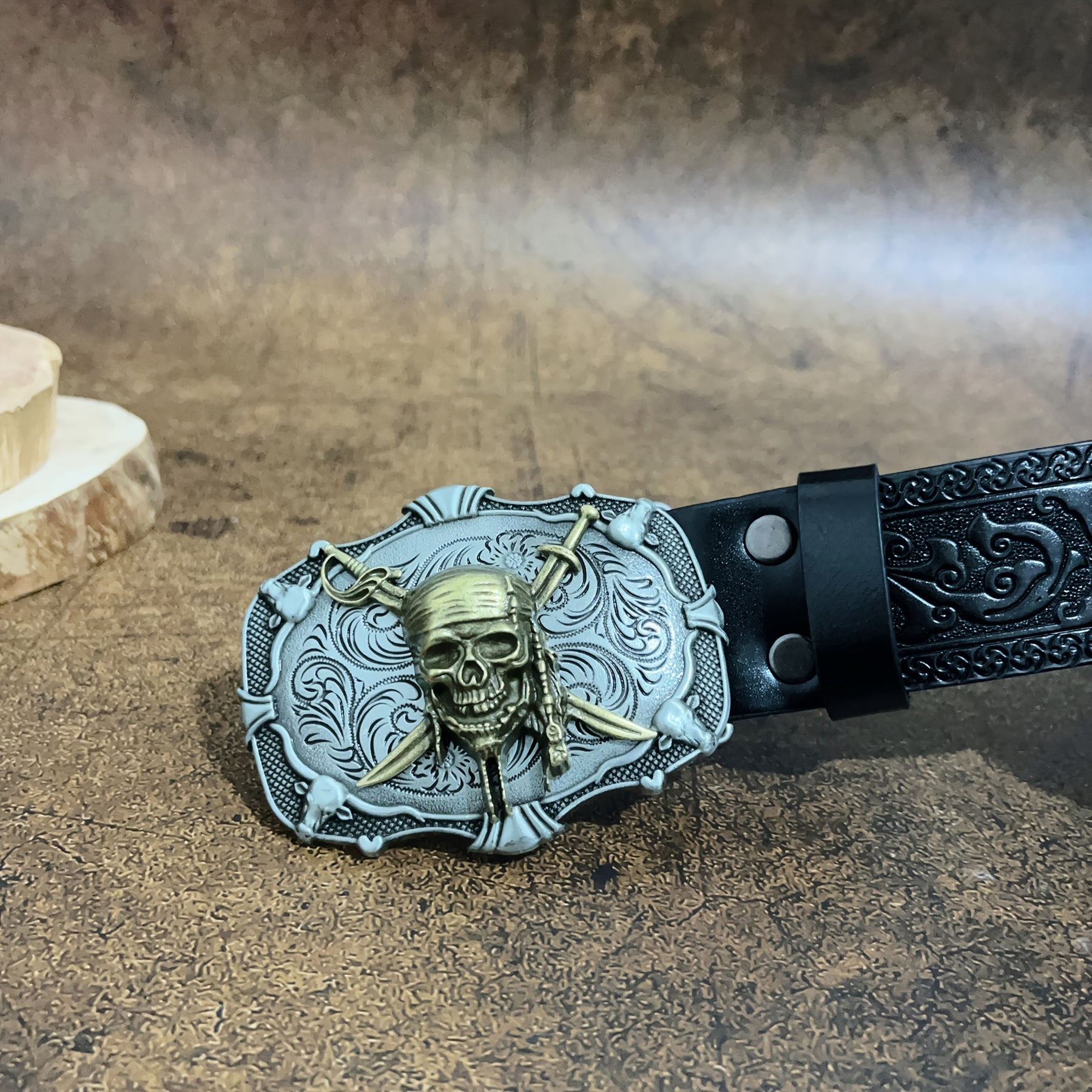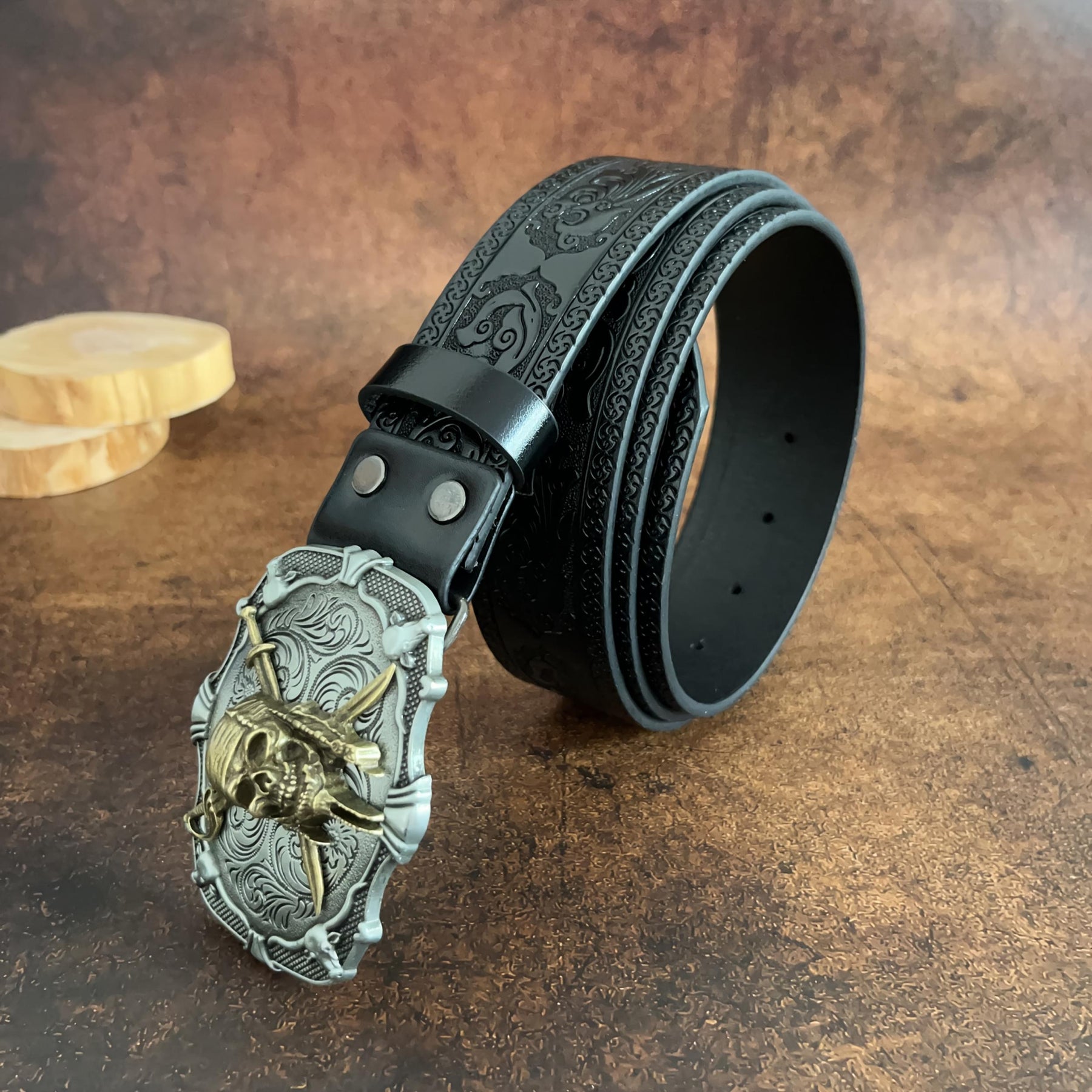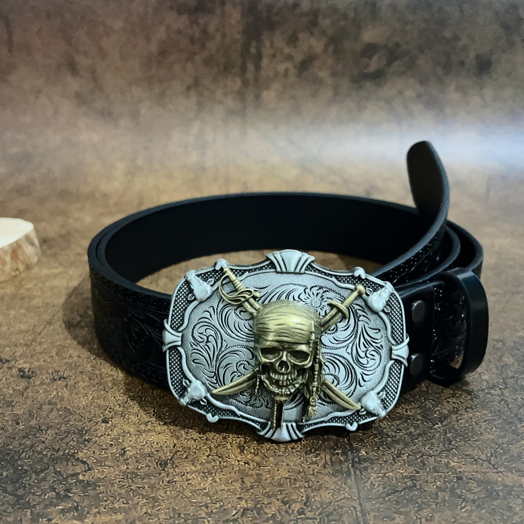 This stylish belt features pirate skeletons carved on the buckle, perfect for men and women who love punk style. Made of faux leather, it adds a touch of retro flair to any outfit.