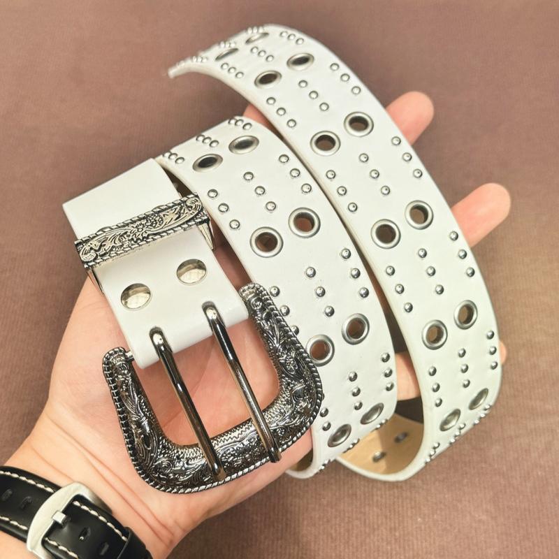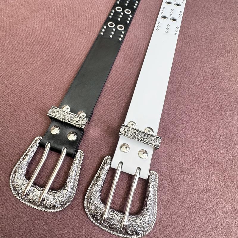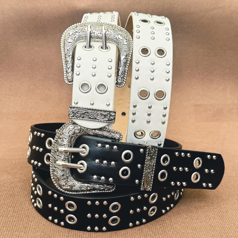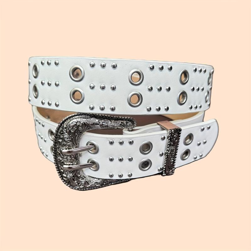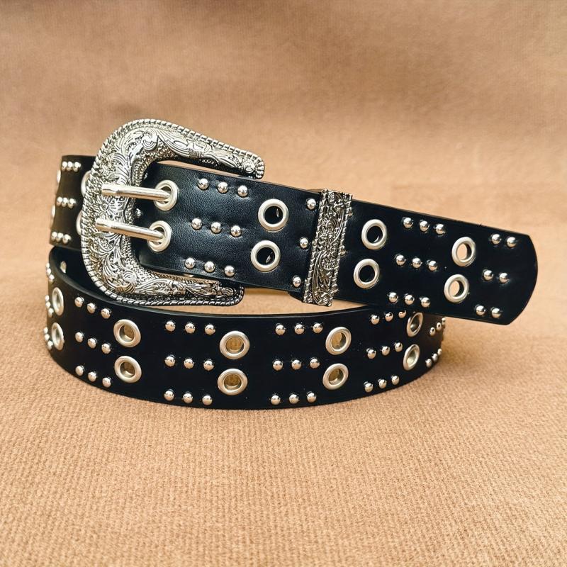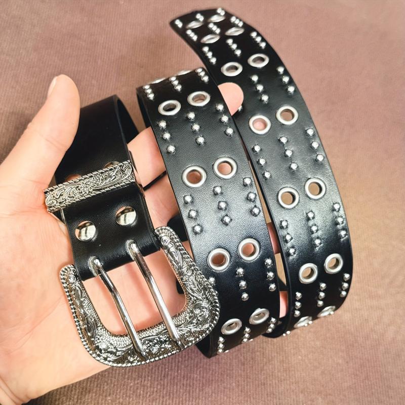 Upgrade your street style with this punk hip hop Y2K inspired belt. Featuring rhinestones and studs, this belt adds a touch of edginess to your outfit. Adjustable for a comfortable fit.