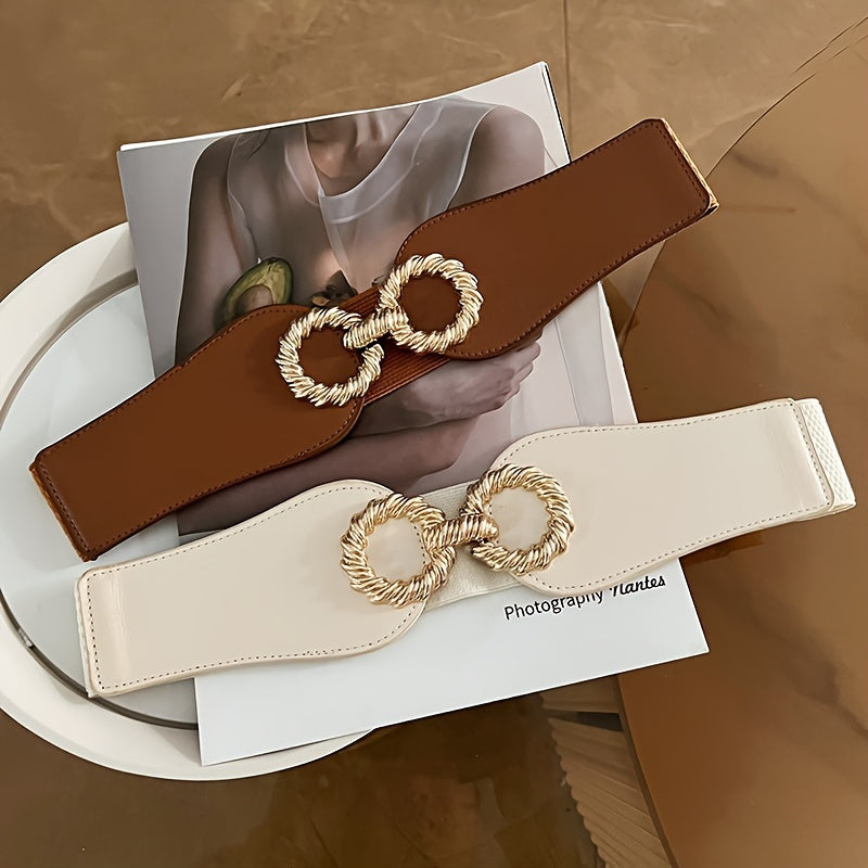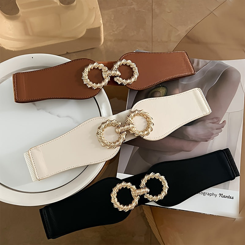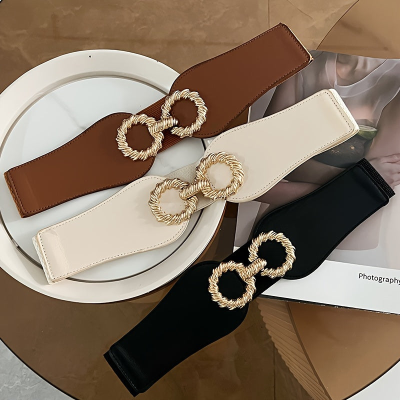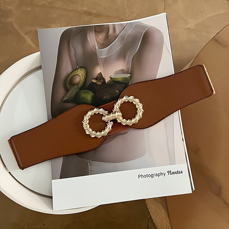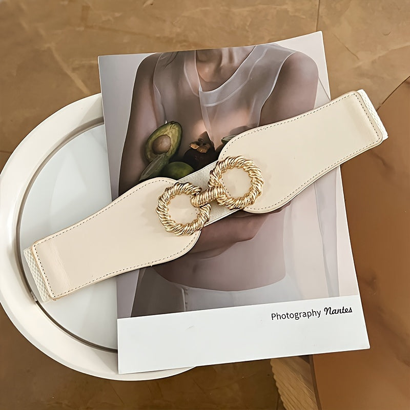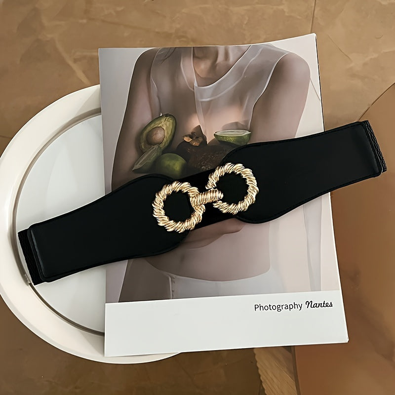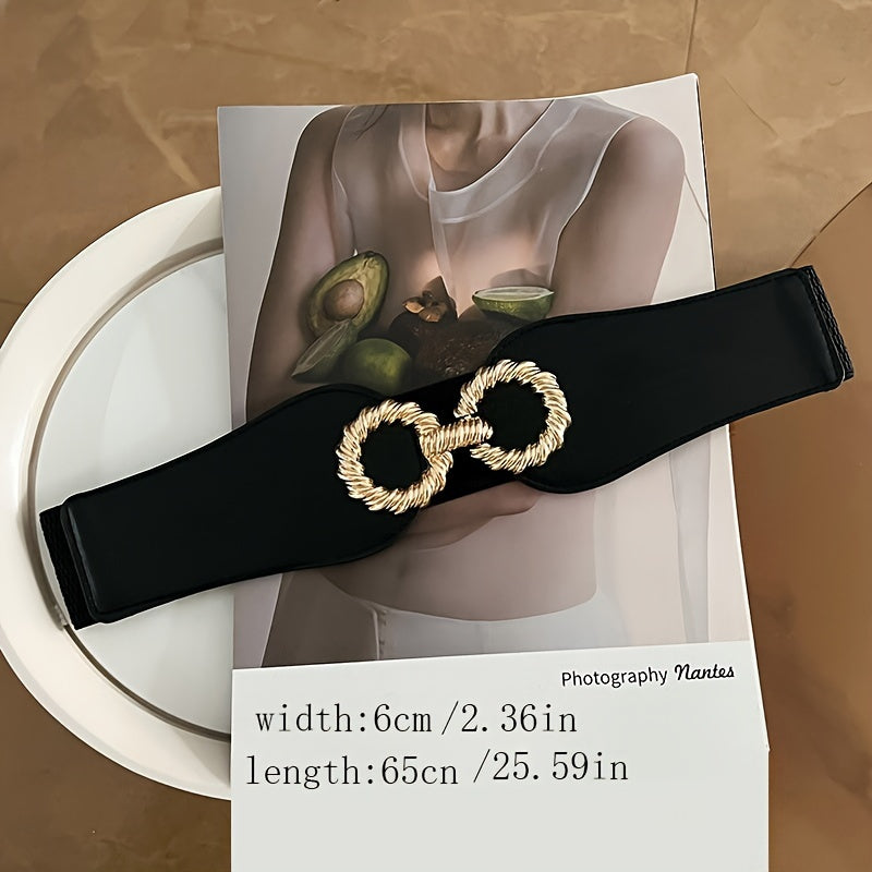This stylish wide waist belt is perfect for both casual and formal occasions. It features a fashionable golden tone buckle and is versatile enough to pair with a variety of outfits.