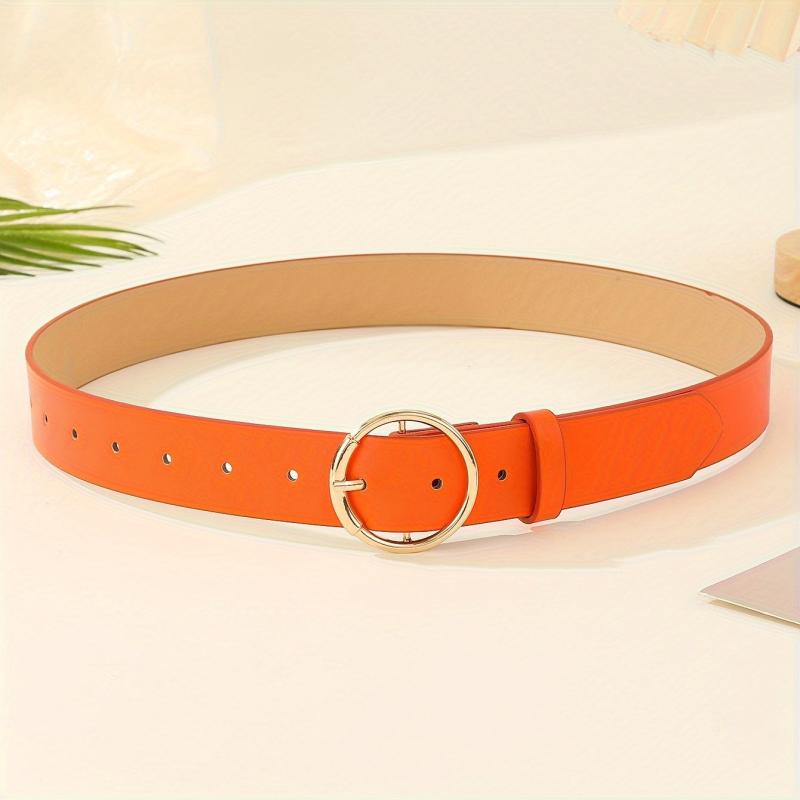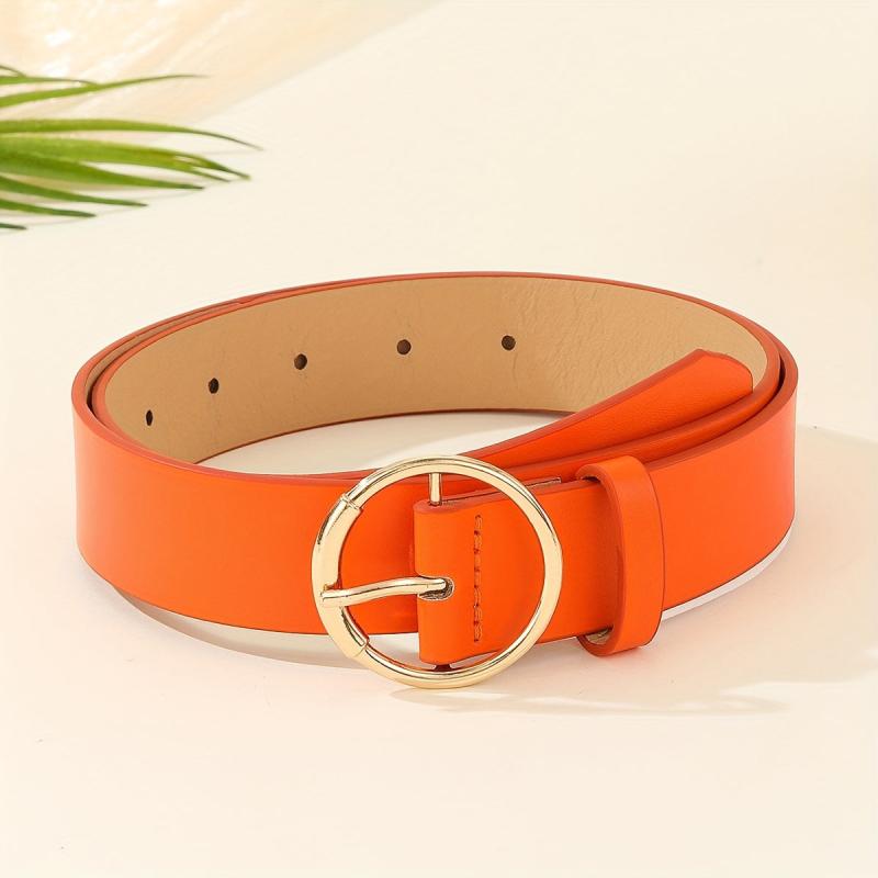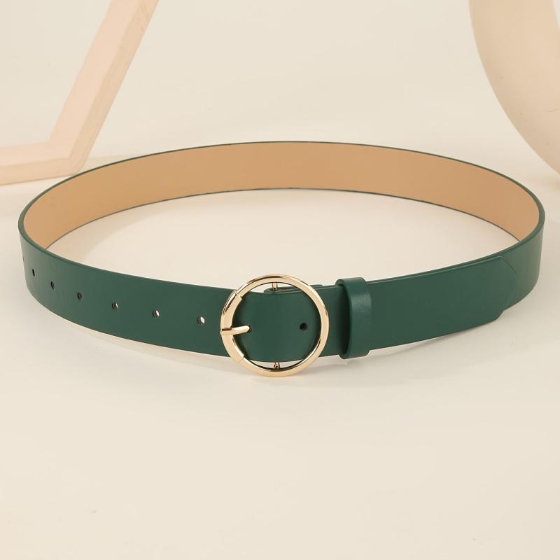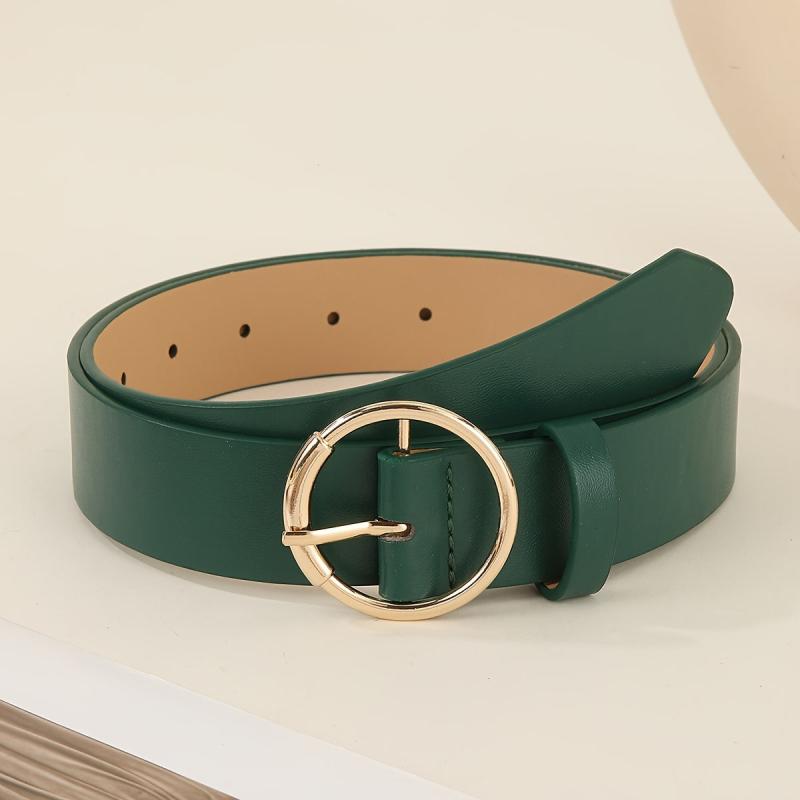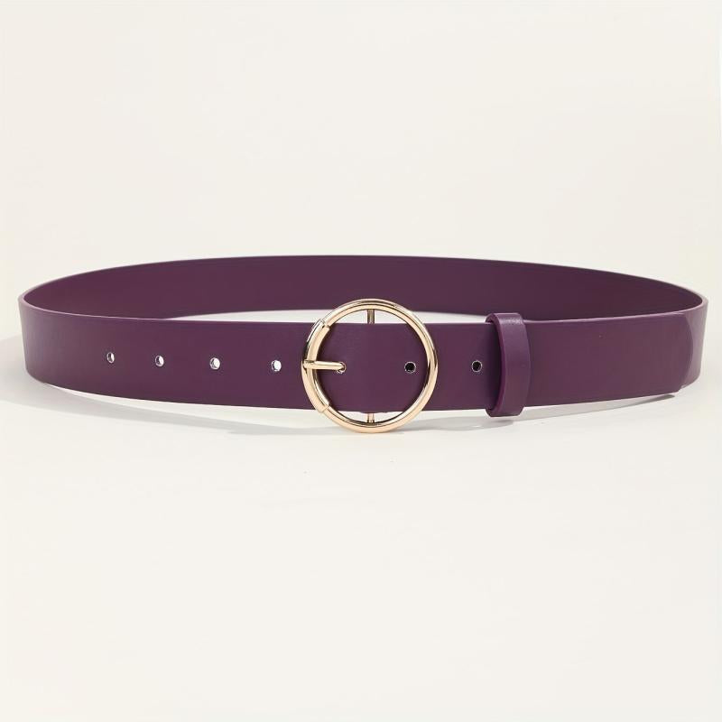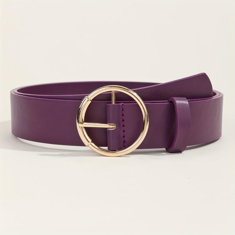 This women's belt features a faux leather material, suitable for both casual and business styles. It has a 3-inch width and a two-tone circular buckle for added detail.