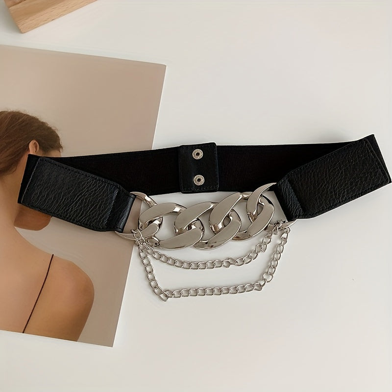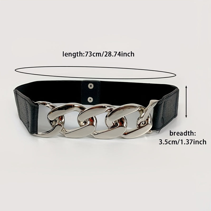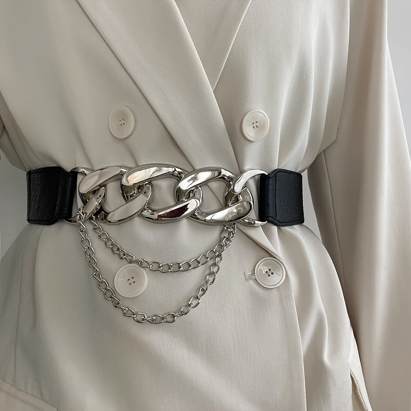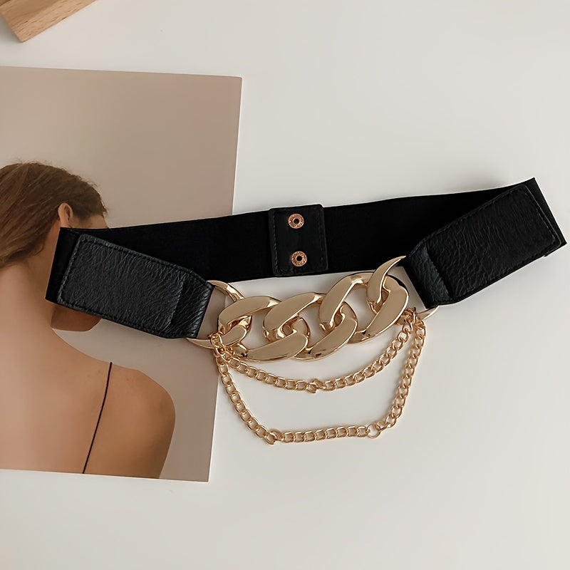 Add a touch of style to your outfit with this golden tone elastic metal chain belt that is perfect for suits and stylish attire.
