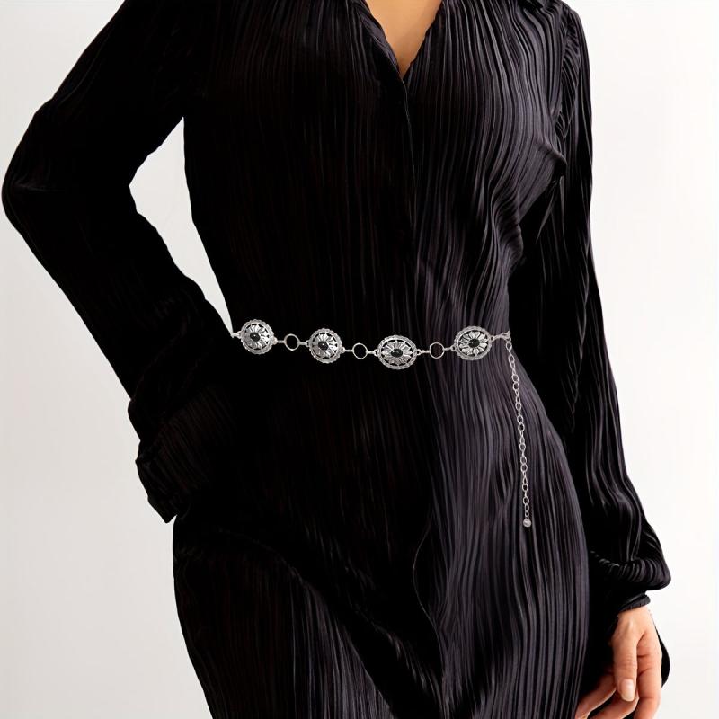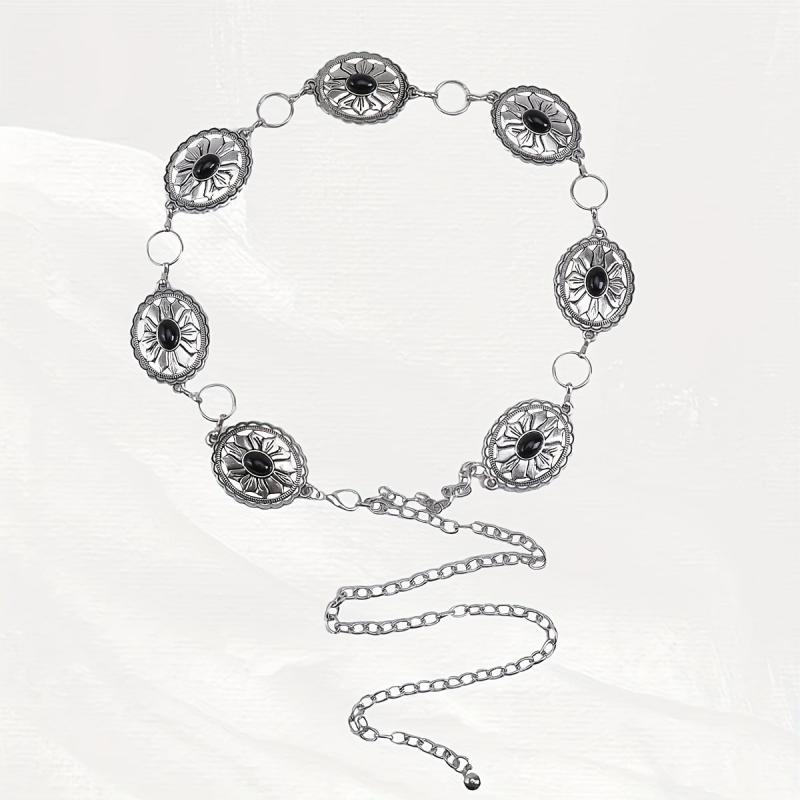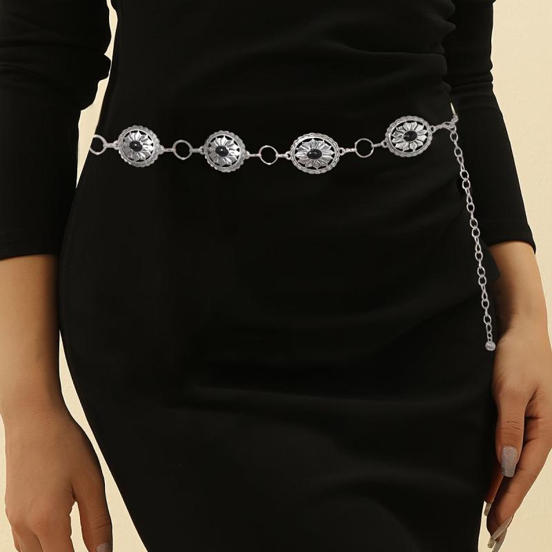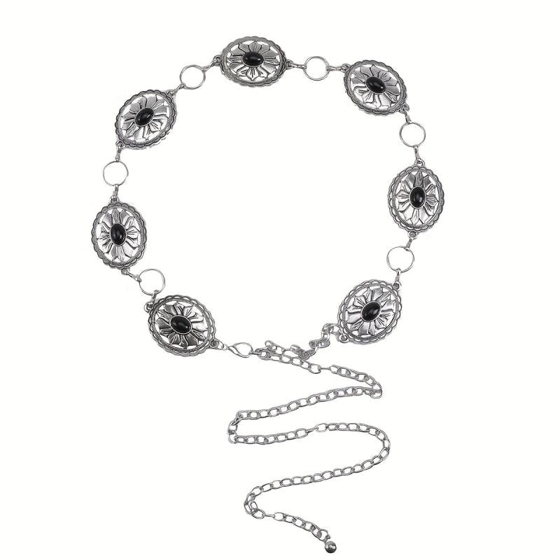 Elevate your summer parties and casual beachwear with this adjustable metal waist belt featuring stone floral gothic punk style. It's perfect for adding a touch of Y2K bohemian flair to your outfits.