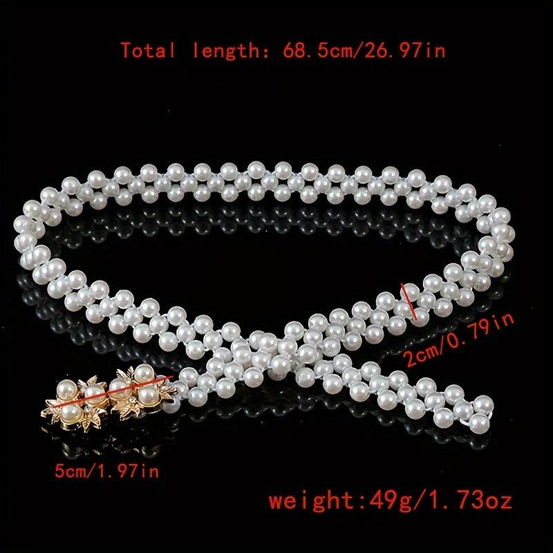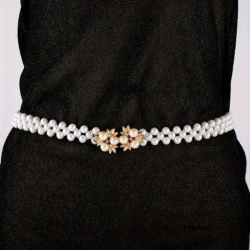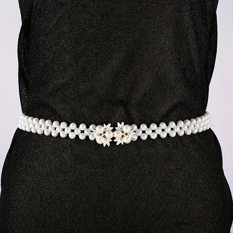 Elevate your outfit with this pearl belt chain featuring a decorative floral buckle. Ideal accessory for skirts in a minimalist style.