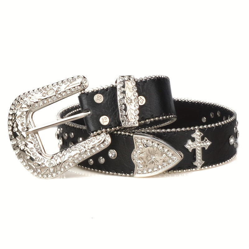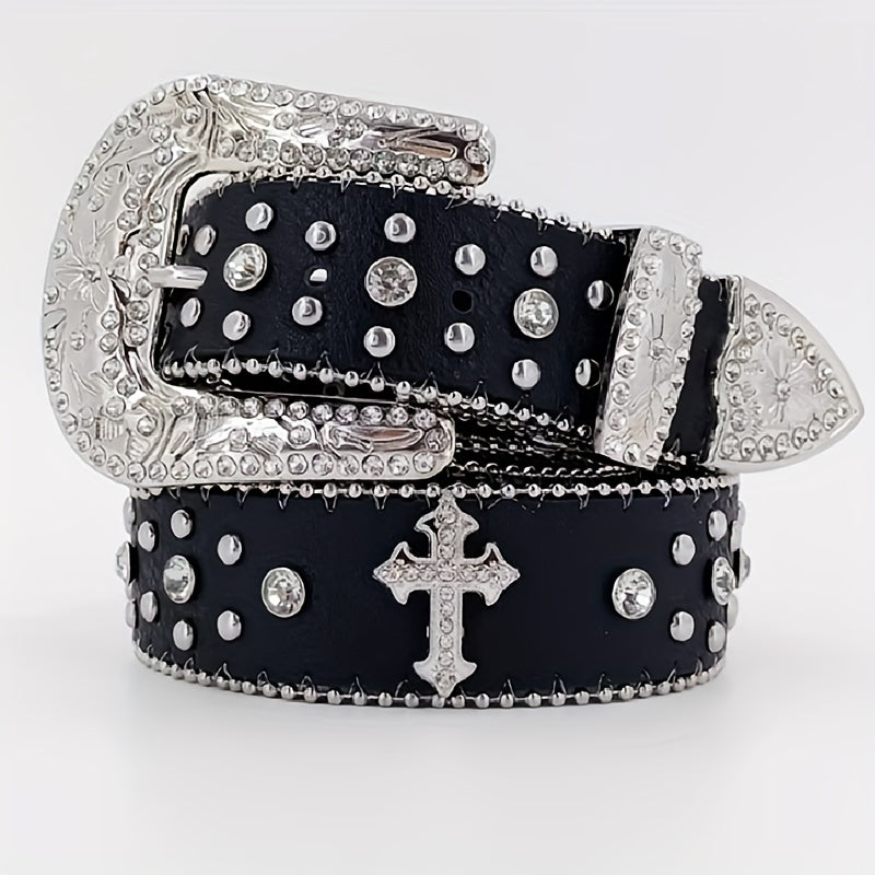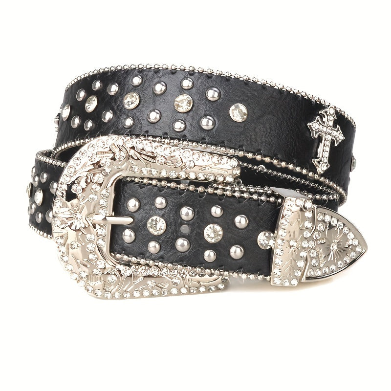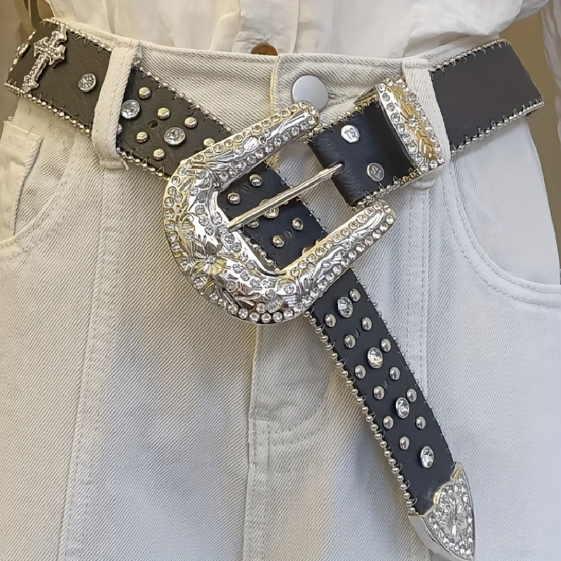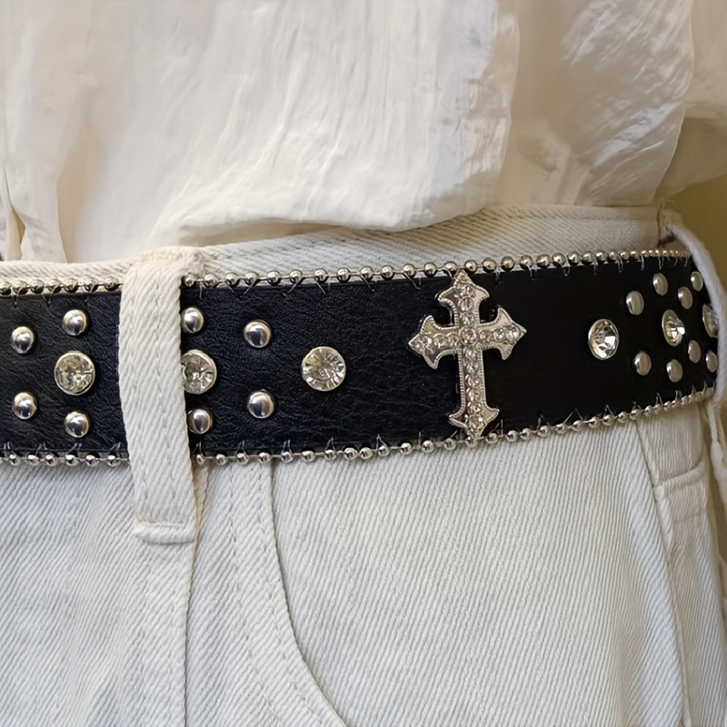 Add a touch of punk and hip hop style to your casual outfits and parties with this wide PU leather belt adorned with rhinestones. The decorative metallic buckle adds an edgy flair.
