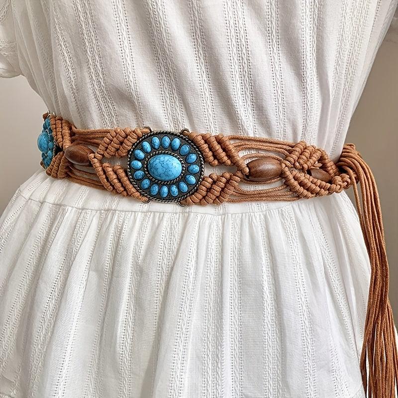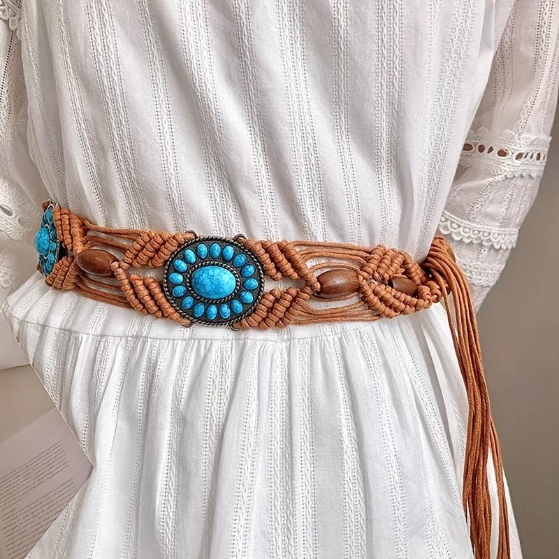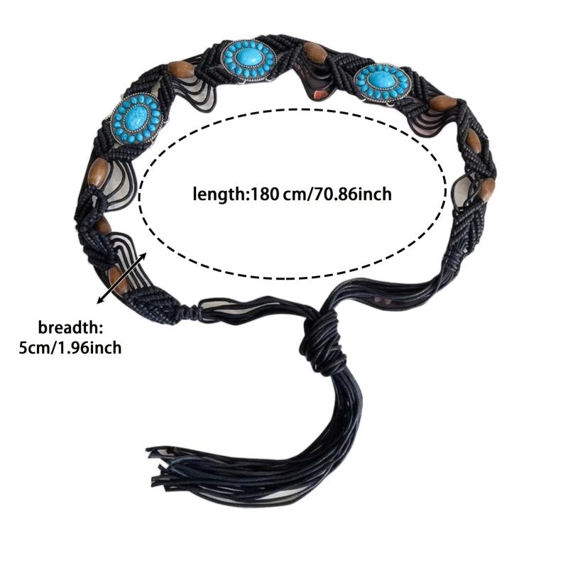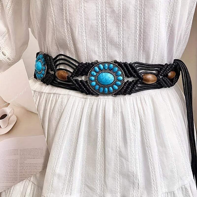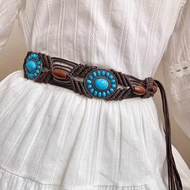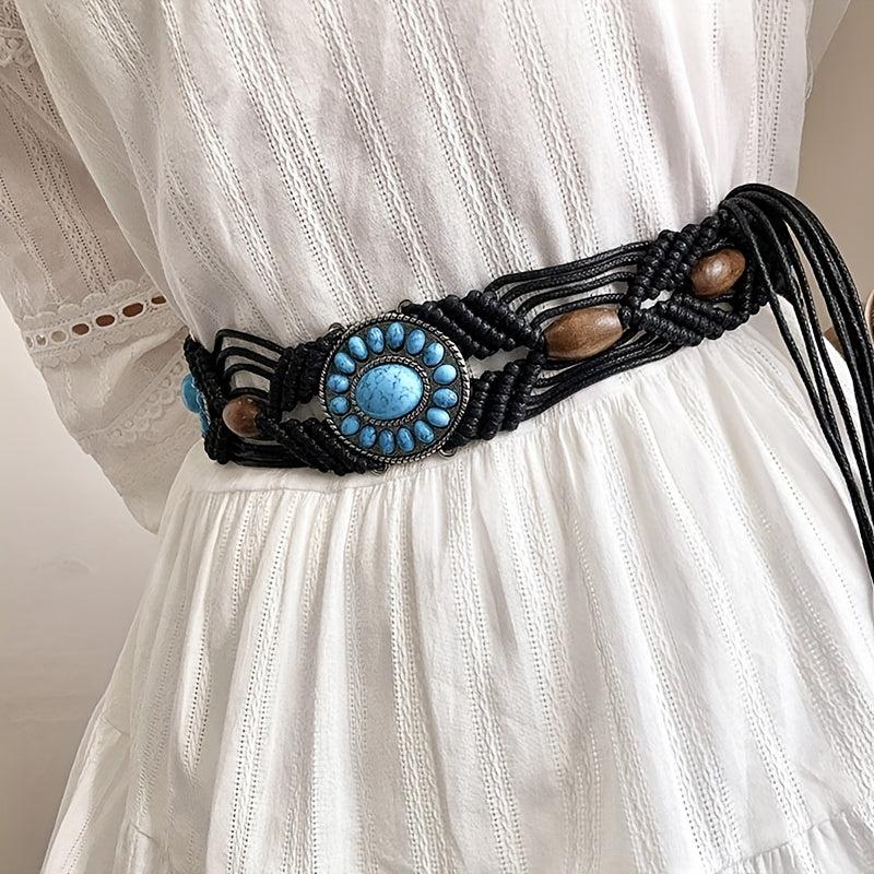 Add a touch of bohemian charm to your outfit with this unique woven belt featuring turquoise beads. Made with braided wax rope, this belt is perfect for adding a pop of color and texture to your look.