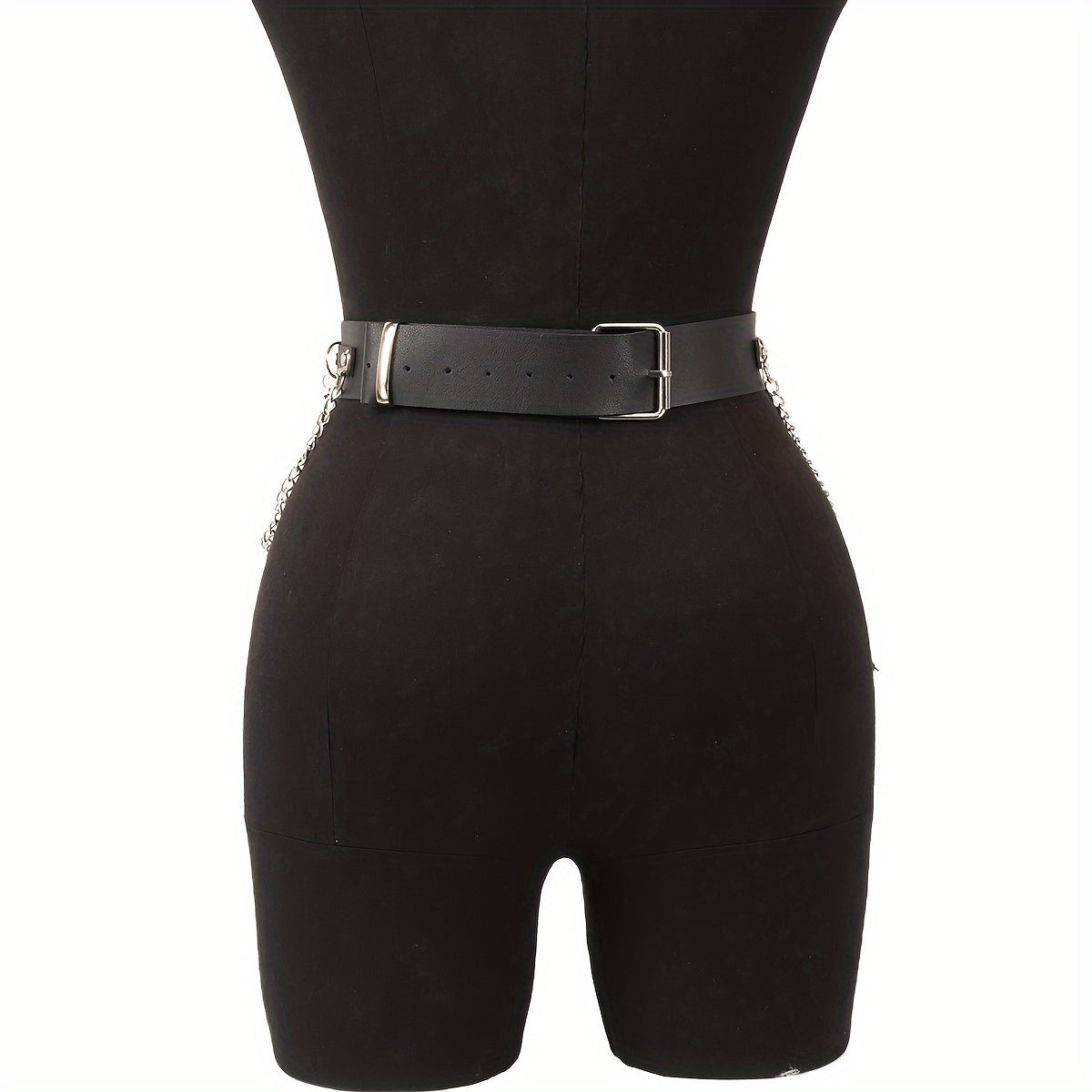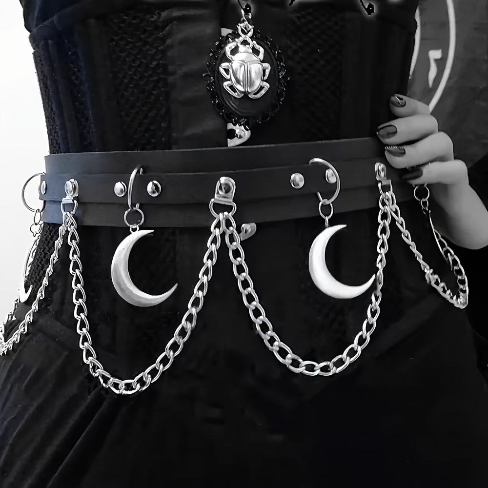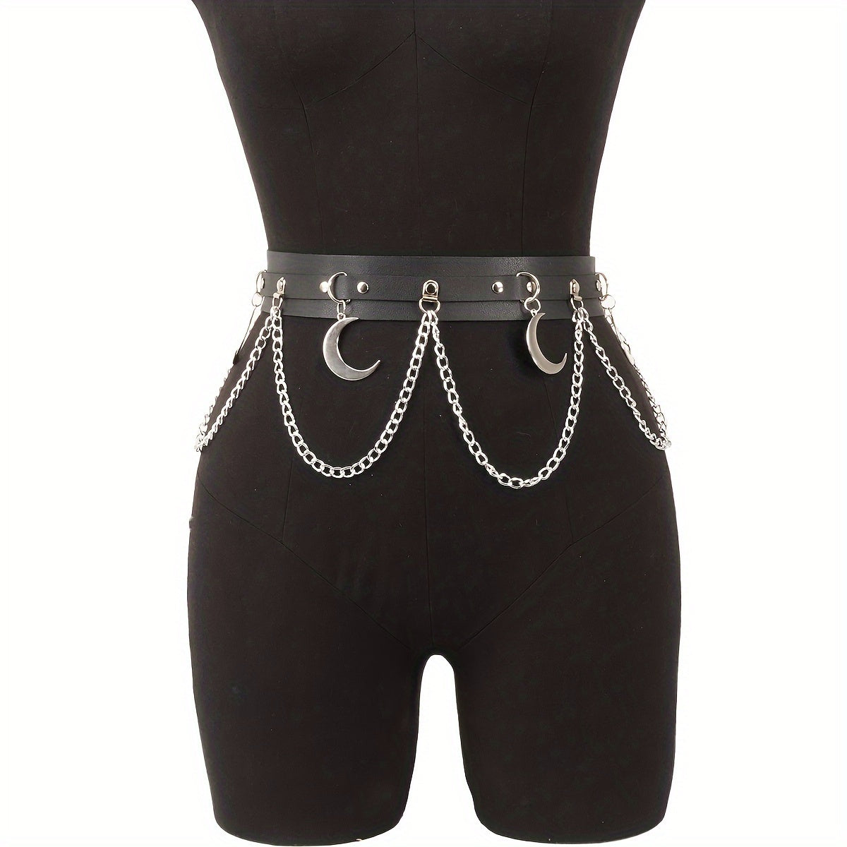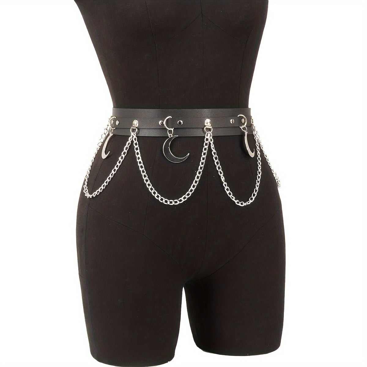 Faux leather belt with chain tassels and crescent moon charm, ideal for parties and casual wear.