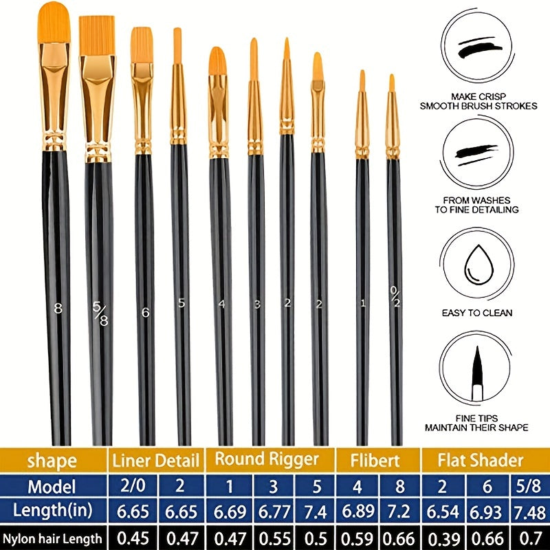 This pack includes 10 paint brushes suitable for oil painting, watercolor, acrylic, and more. Perfect for body, face, rock, canvas, and other art crafts. Ideal for kids and adults alike.