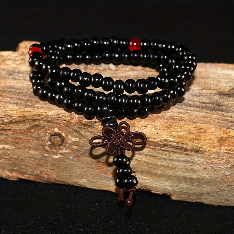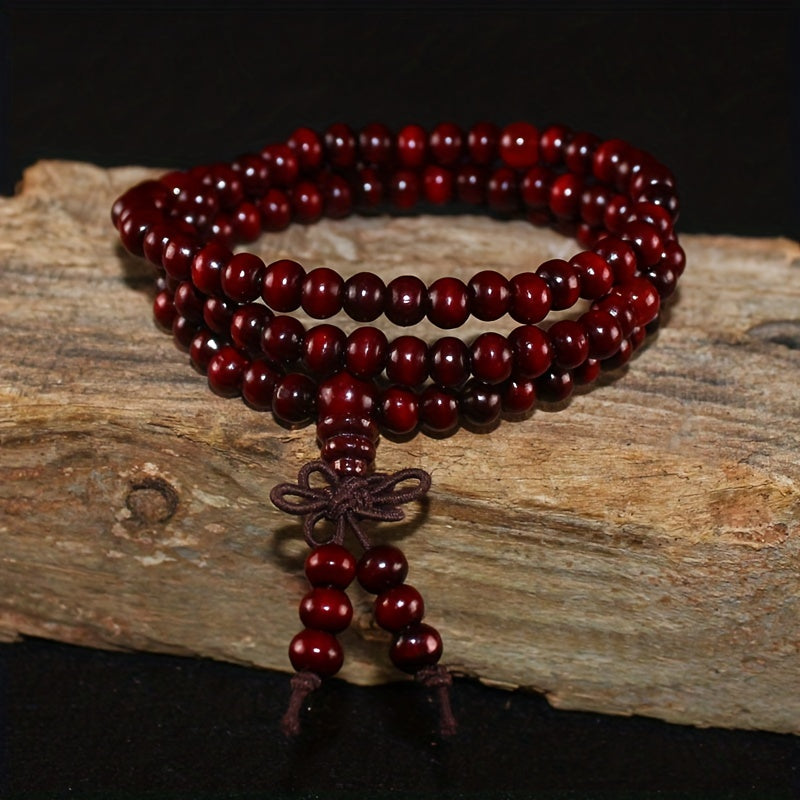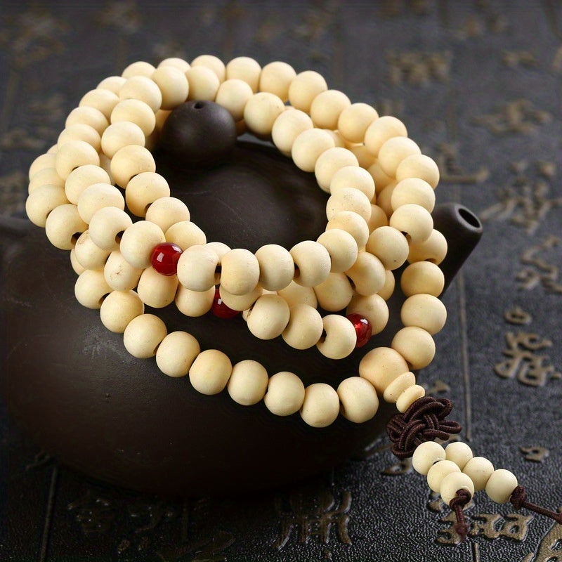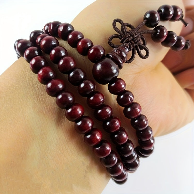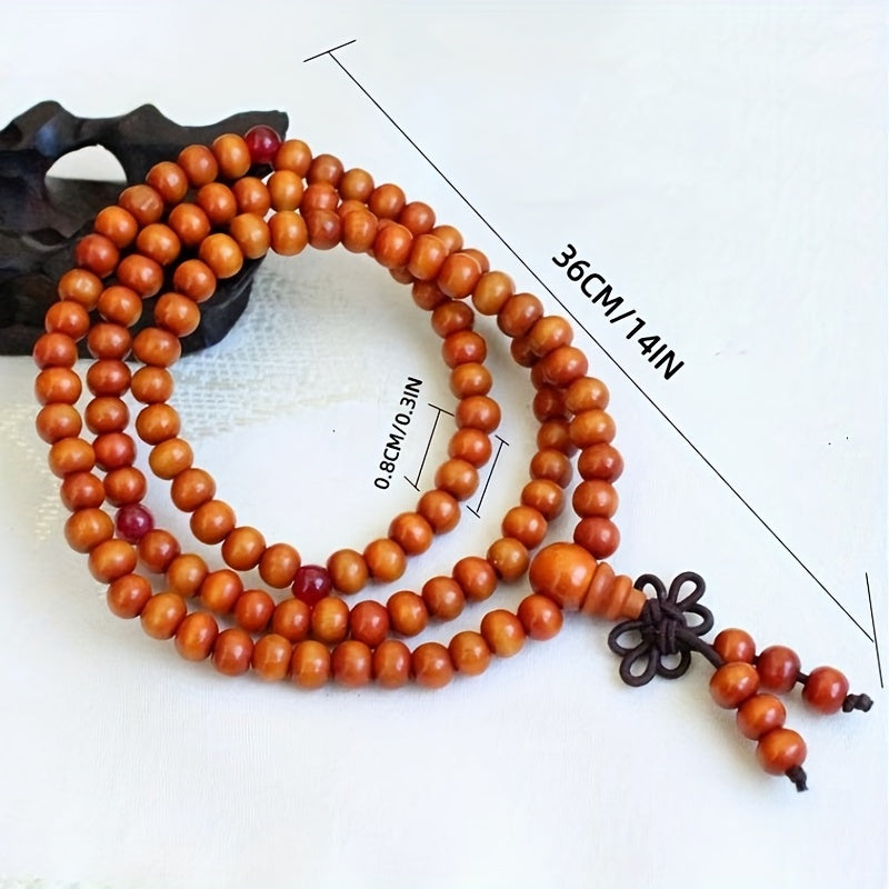 This bracelet features 108 natural sandalwood beads with knot detailing, perfect for meditation or daily wear.