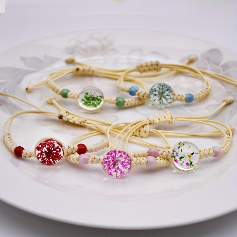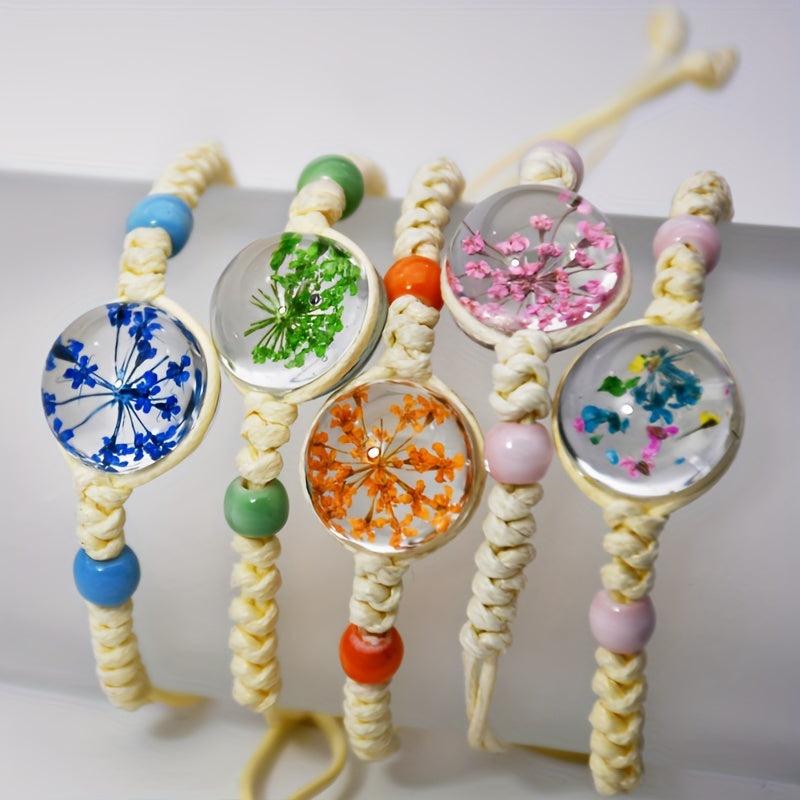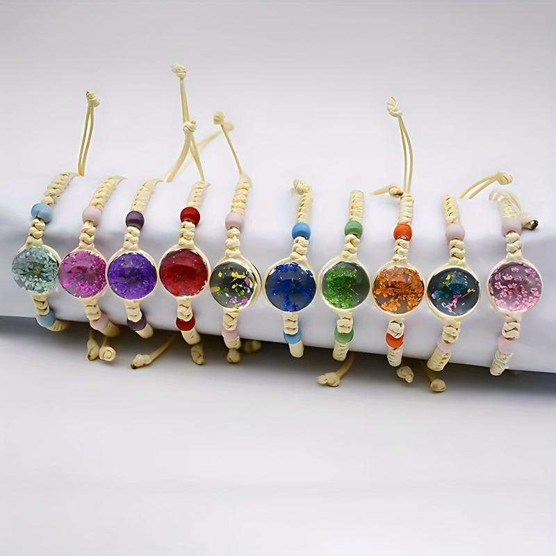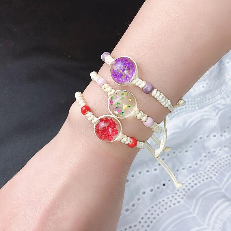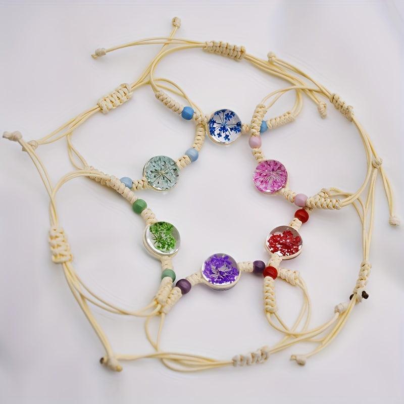 These sweet summer bracelets feature a colorful flower design with bohemian style. Each bracelet is made of resin and is adjustable, making it a perfect gift for a loved one.