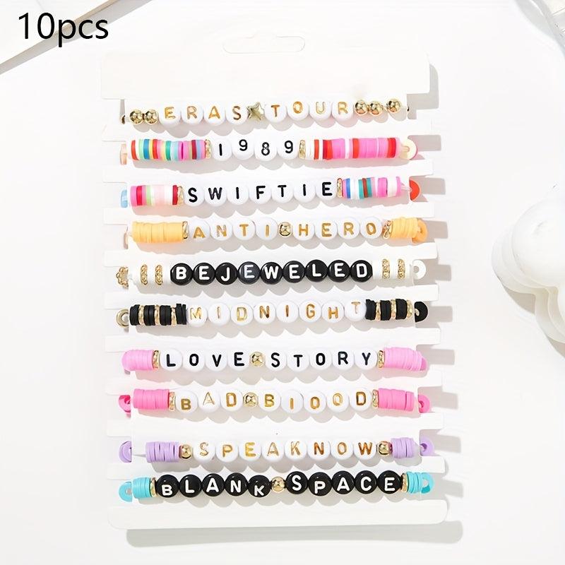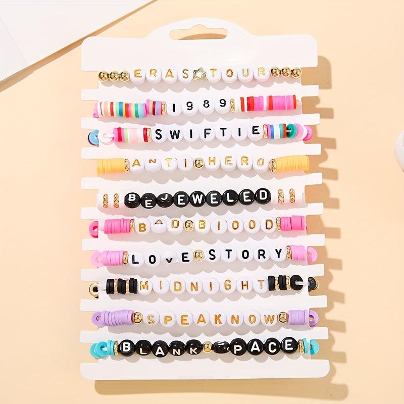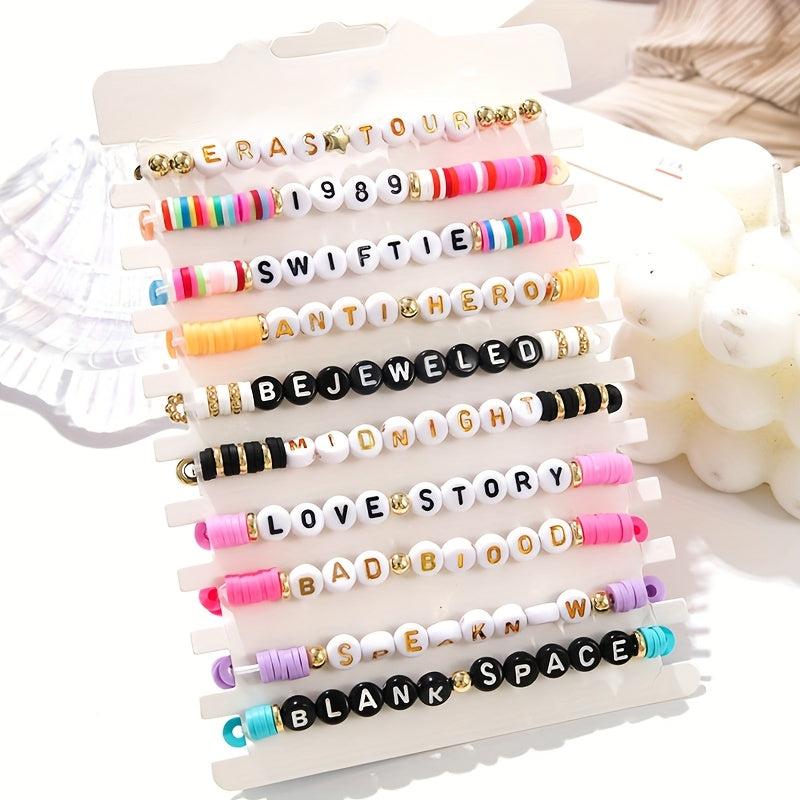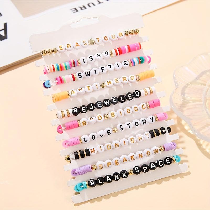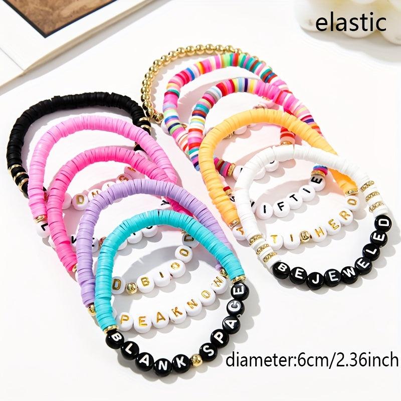 This set of elastic bracelets features soft pottery alphabet beads in a random arrangement for a colorful and musical look. Perfect for stacking and suitable for both men and women.