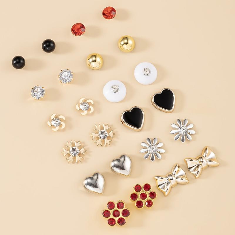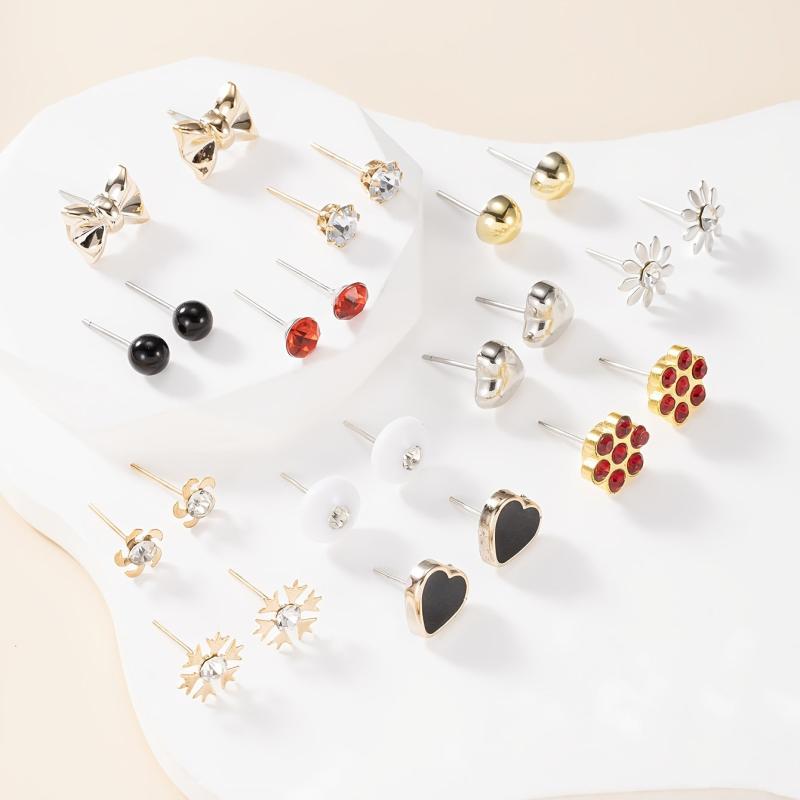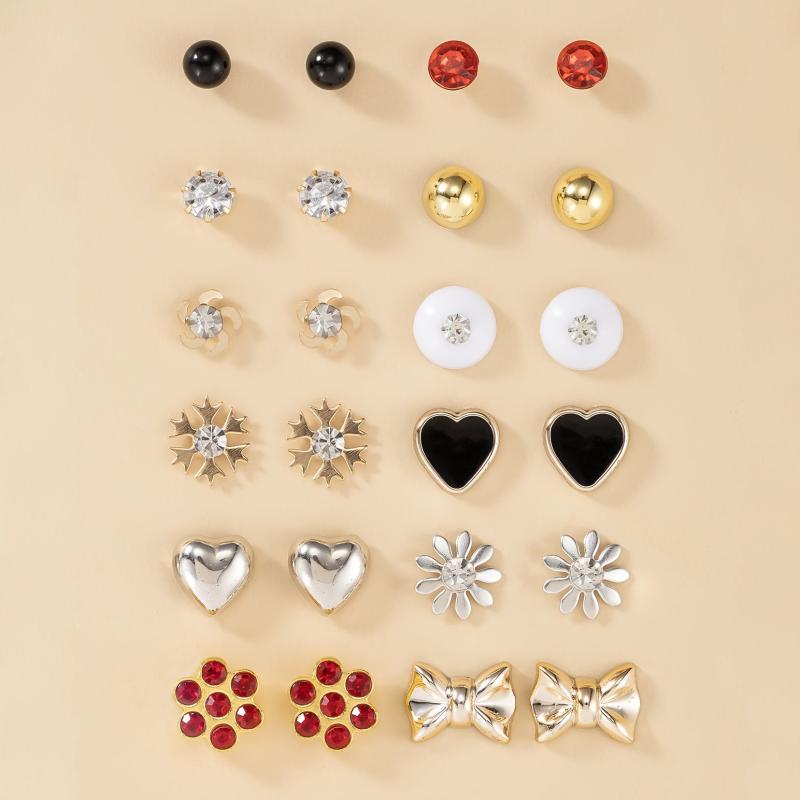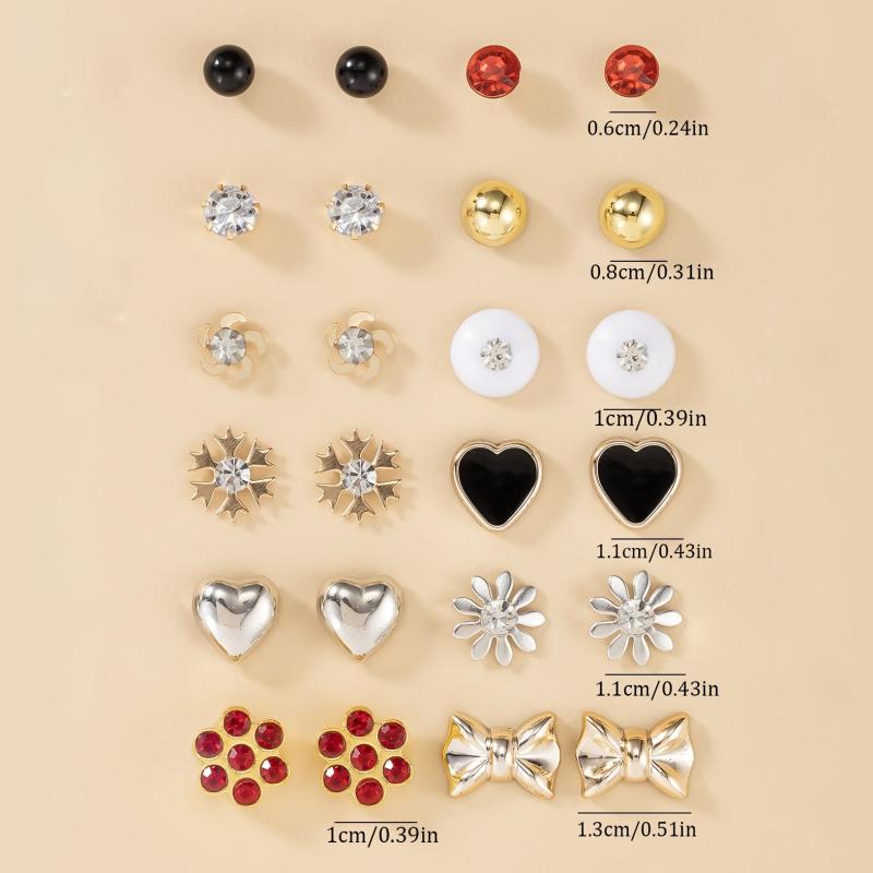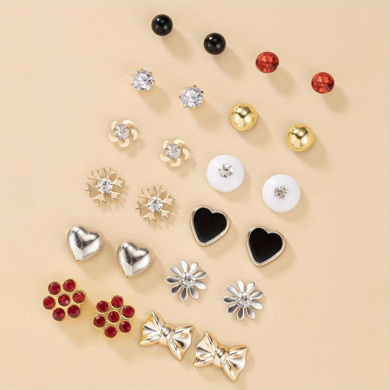 Elevate your style with this set of 12 pairs of earrings featuring heart, bow, snowflake, and flower designs embellished with sparkling rhinestones.