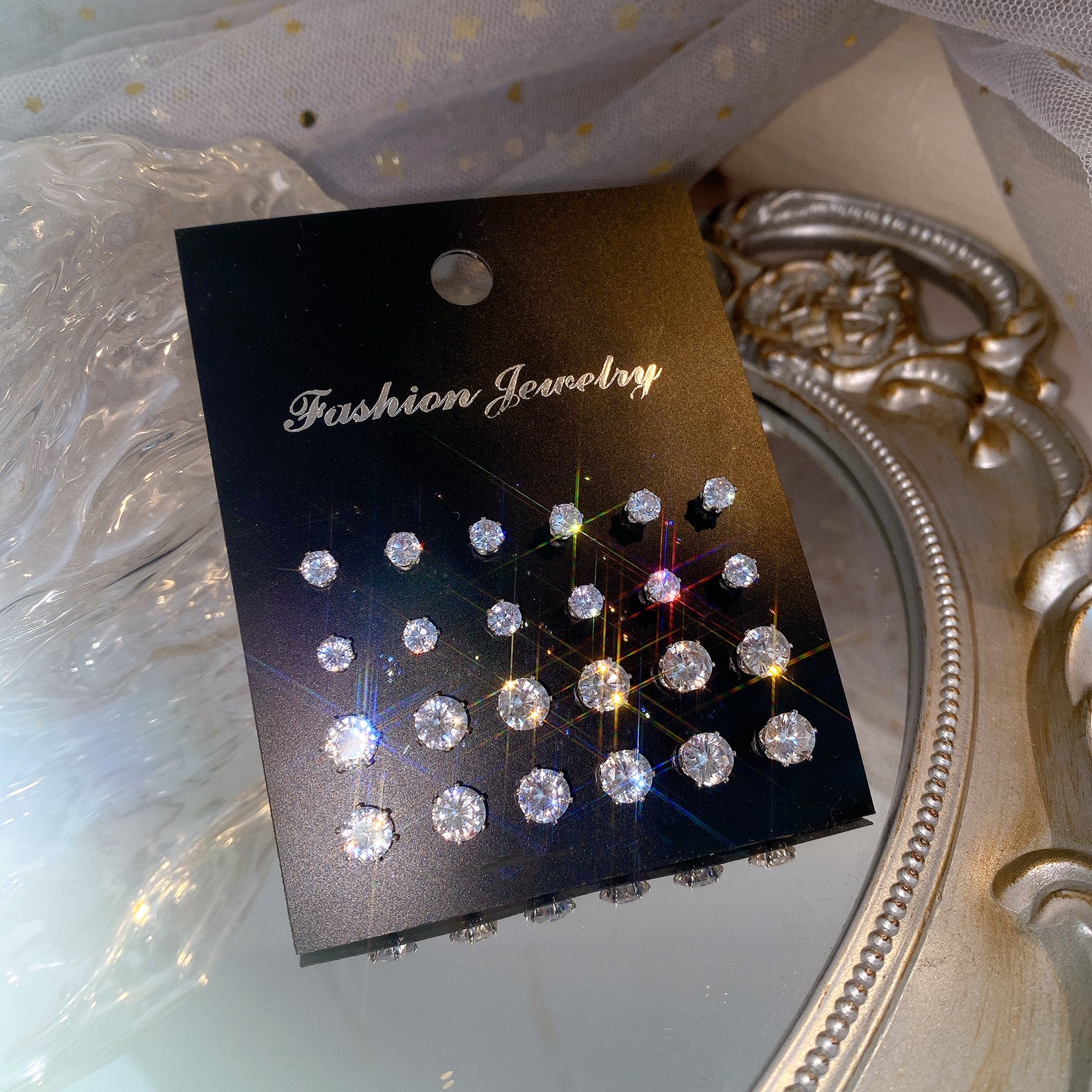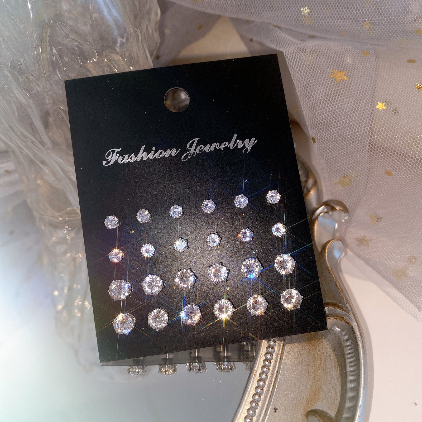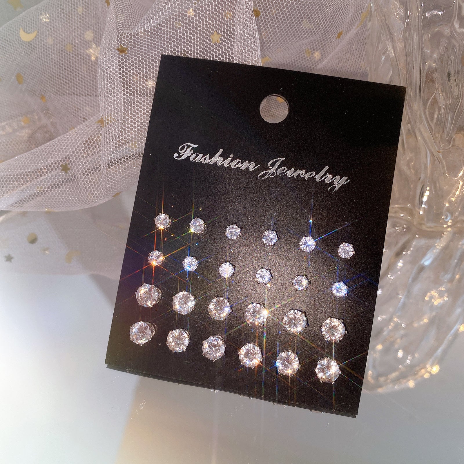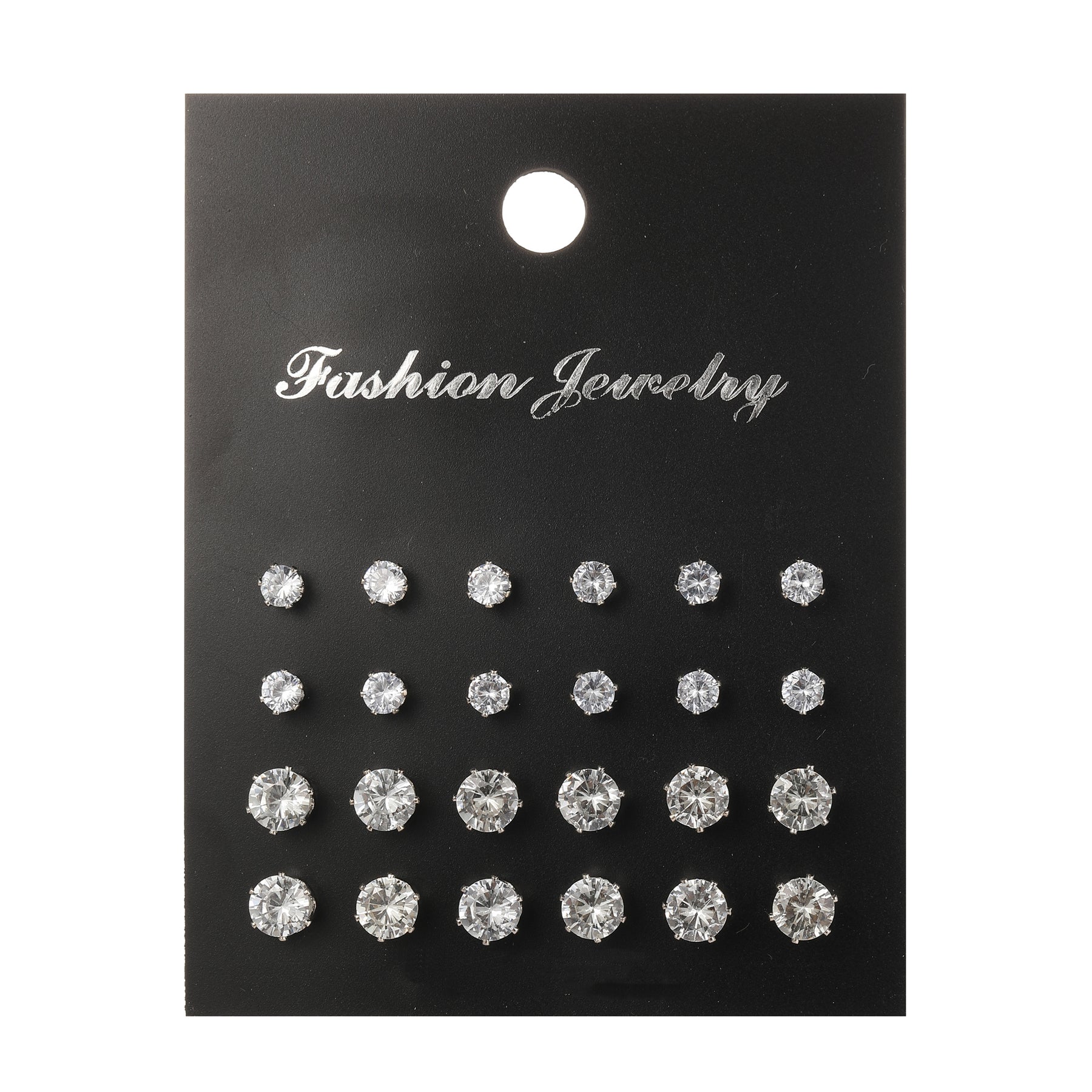 Elevate your earring collection with this set of 12 pairs of six-prong glitter zircon stud earrings. Perfect for adding a touch of glamour to any outfit.