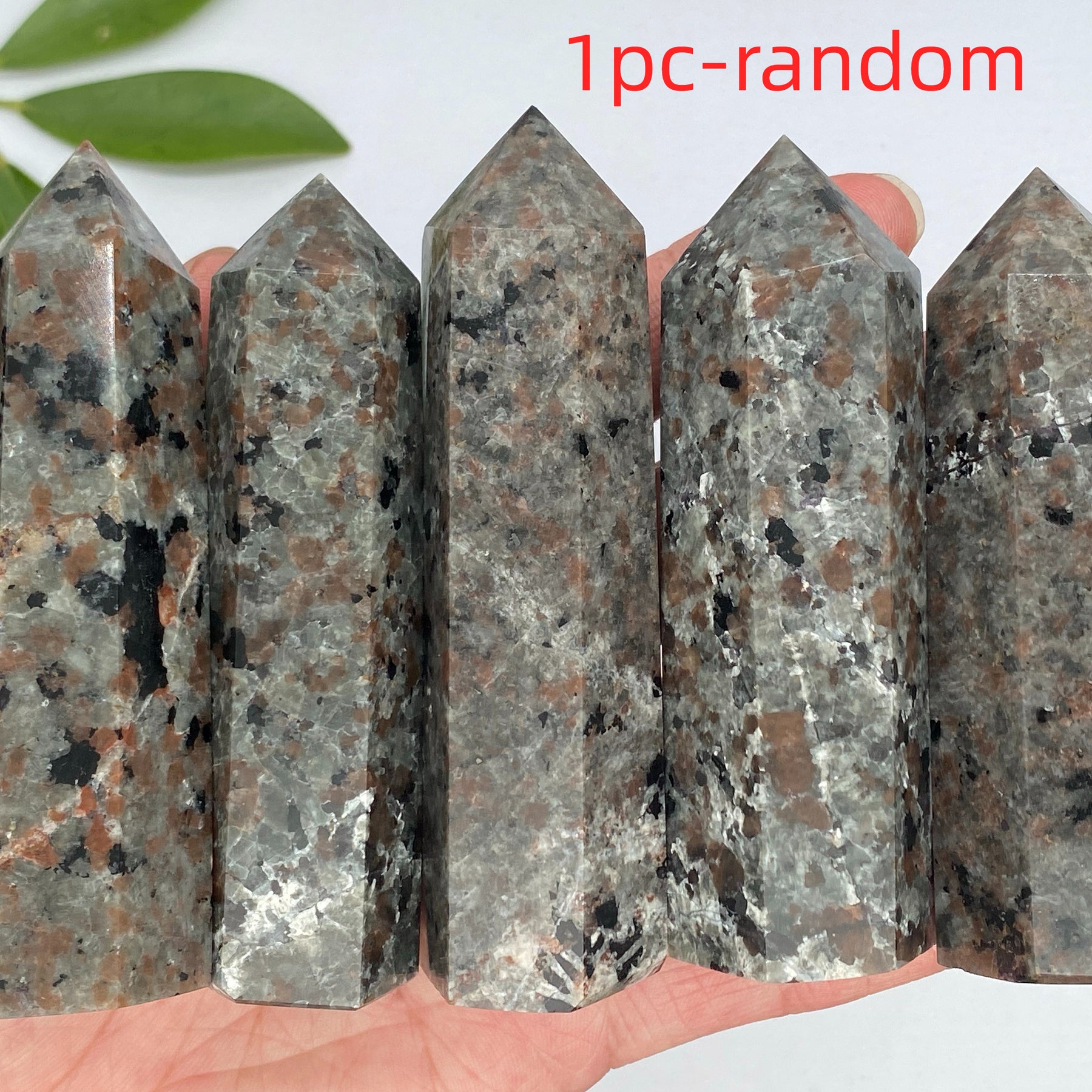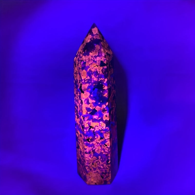 This 1pc Yooperlite Stone Tower Point is a natural UV reactive obelisk gemstone crystal quartz tower. It is a unique and beautiful decor piece that will add a touch of elegance to any space.