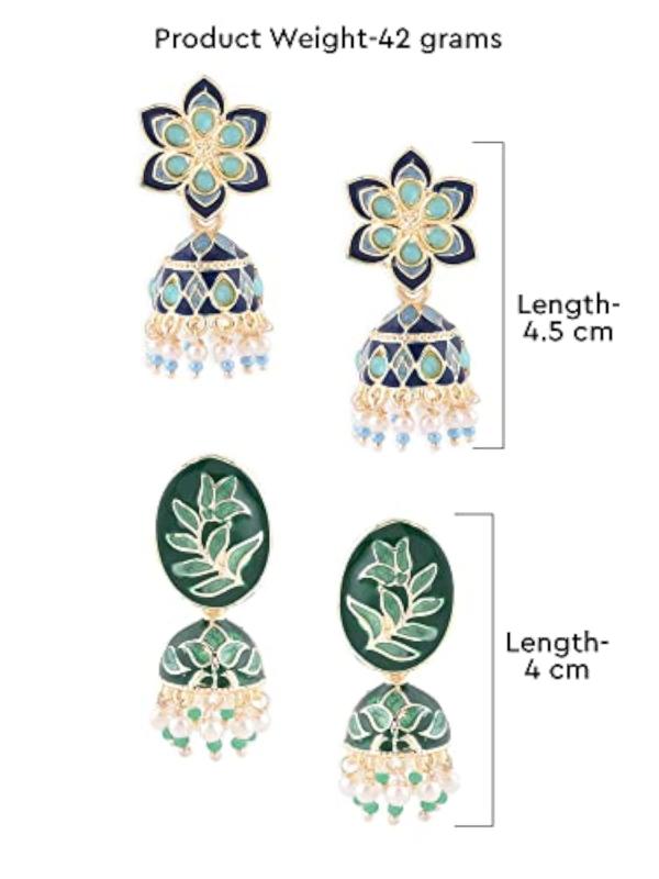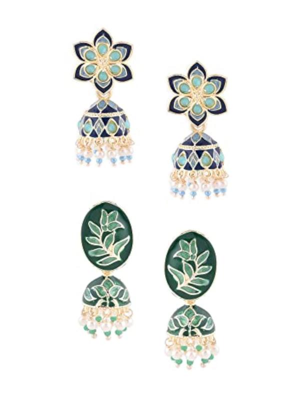 Elegant set of 2 ethnic jhumki earrings in green and meenakari design. Perfect for adding a touch of charm to your outfit.