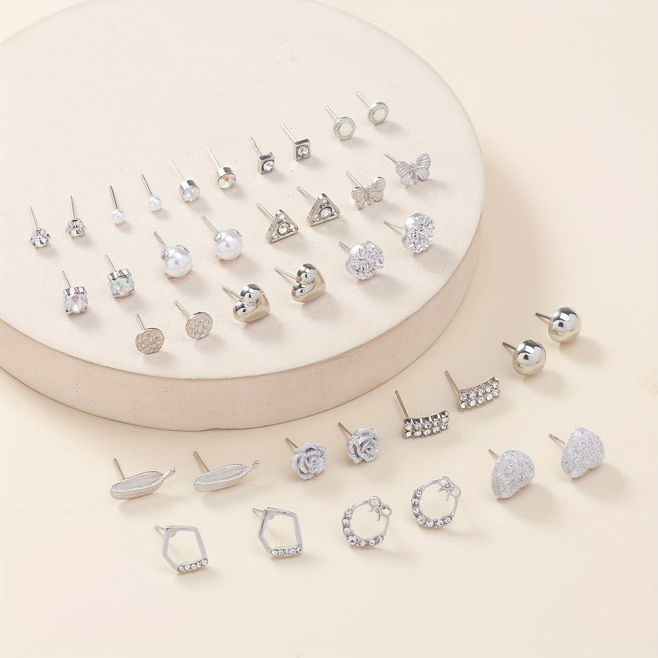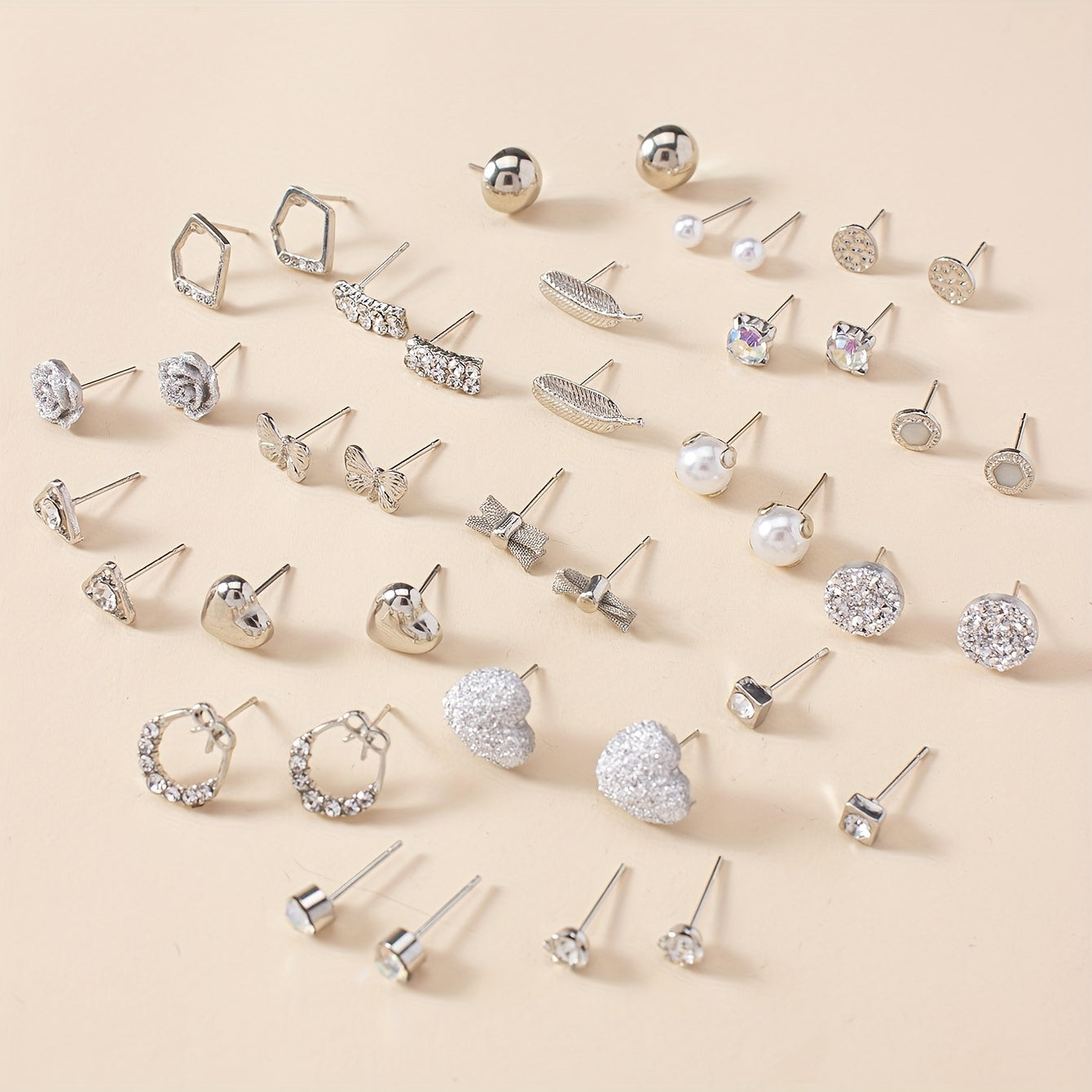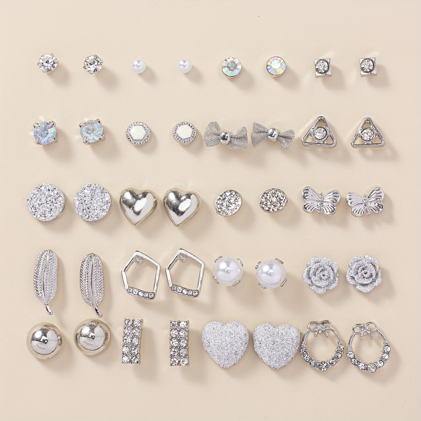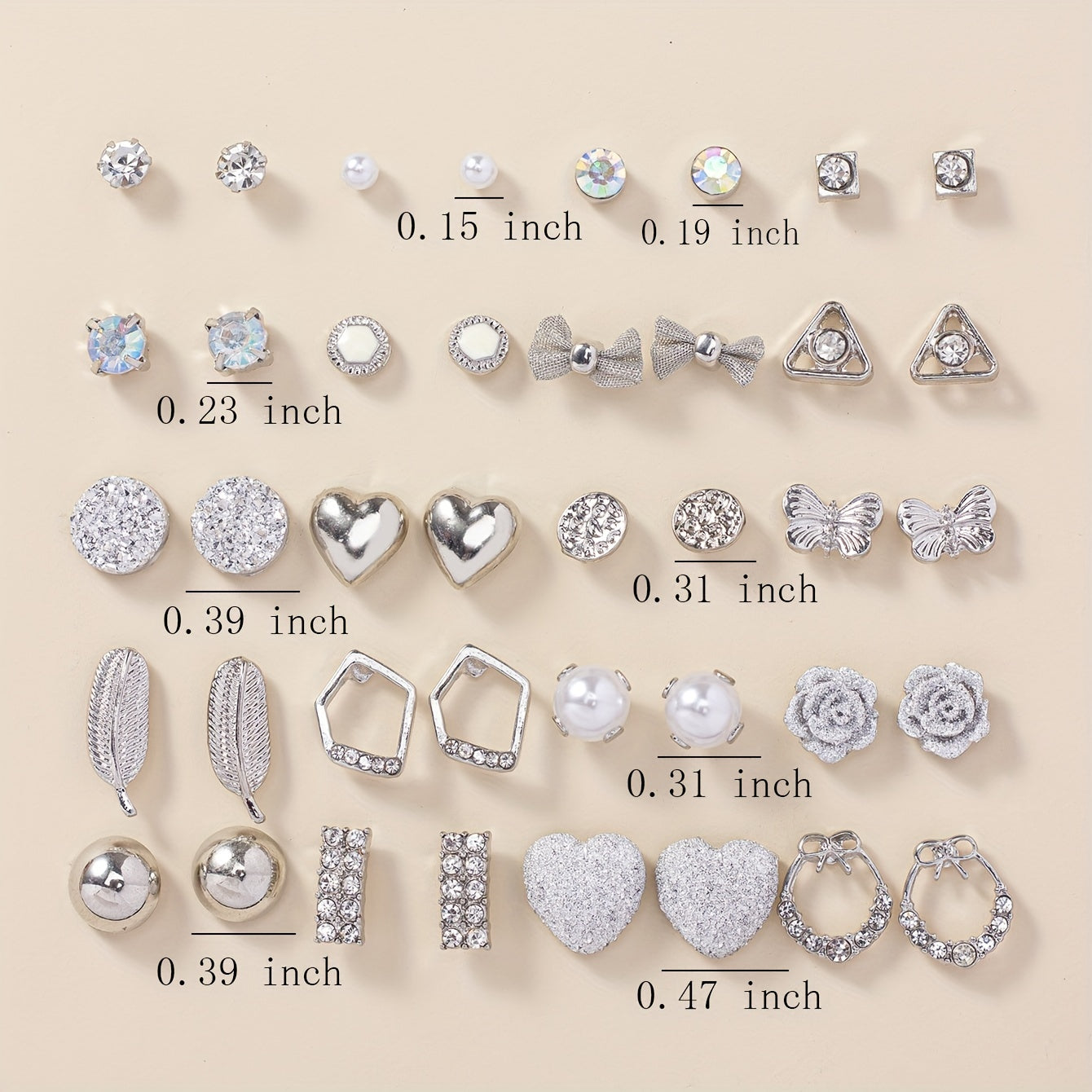 Add a touch of elegance to your daily outfits with this set of 20 pairs of stud earrings featuring silvery heart, leaf, butterfly, flower designs with rhinestones and faux pearls. Perfect for minimalistic style wear.