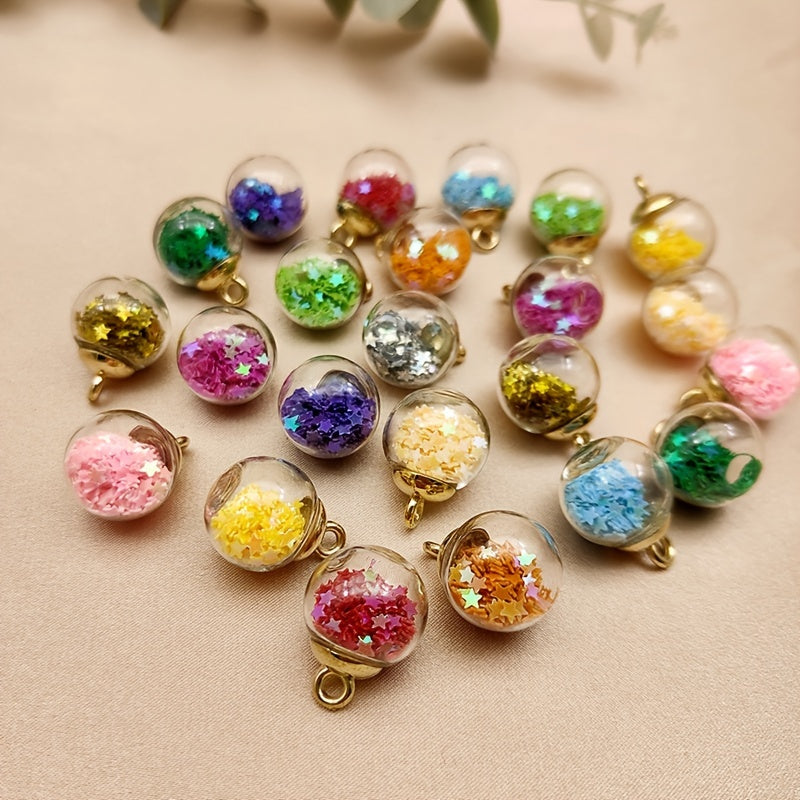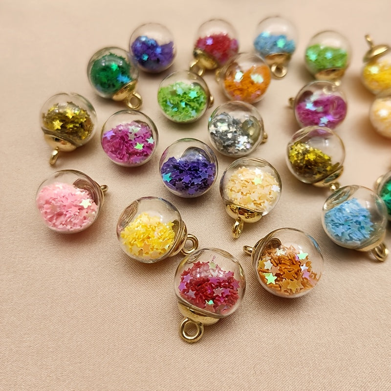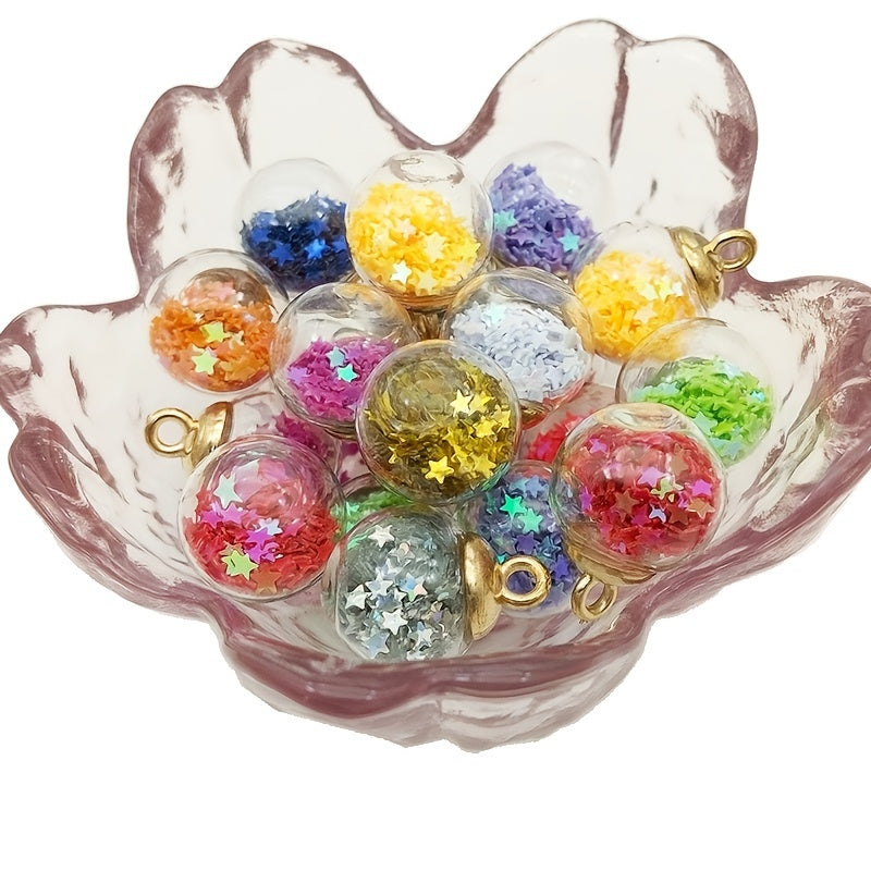 Enhance your DIY jewelry projects with this 20pcs pack of colored transparent glass balls featuring mixed star sequins. Perfect for creating earrings, necklaces, and bracelets.