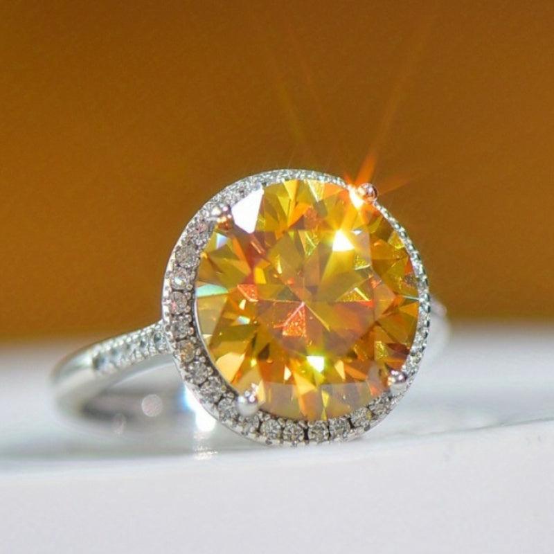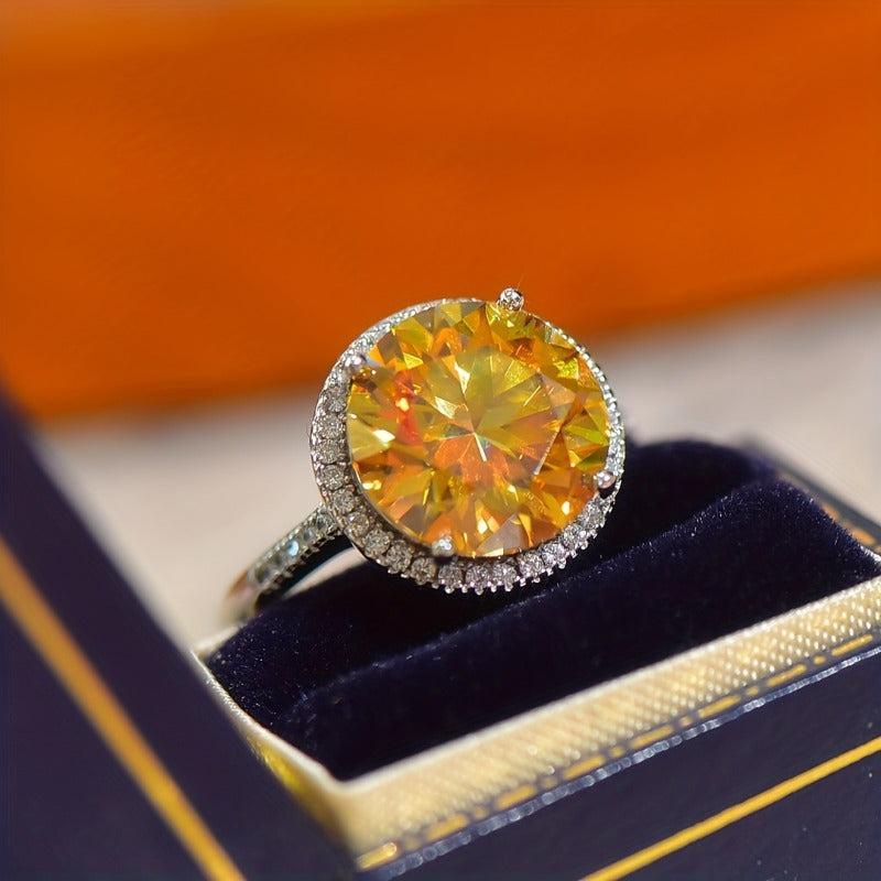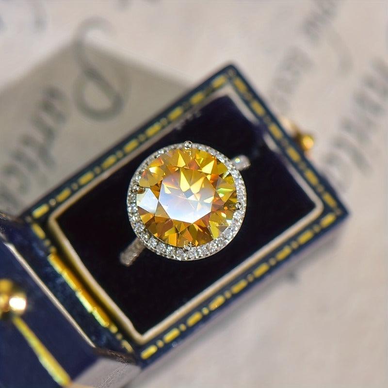 This stunning yellow round moissanite ring is perfect for anniversary or as a romantic promise ring. Crafted in 925 sterling silver, it is an ideal choice for any occasion.