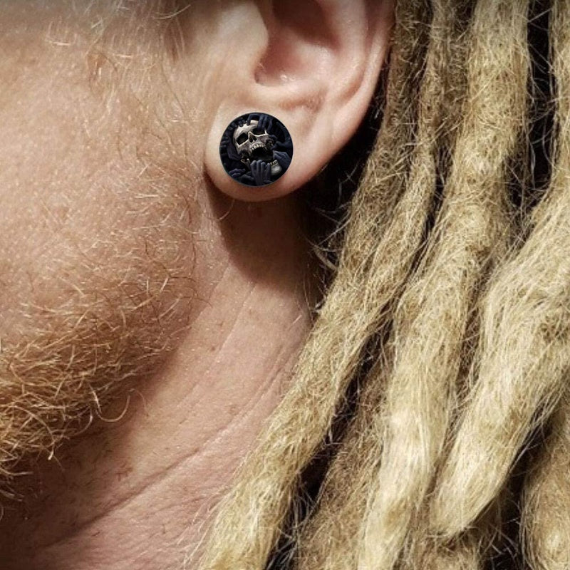 Enhance your style with this pair of acrylic ear expanders featuring a cool skull pattern. Perfect for men who want to add a unique touch to their look.