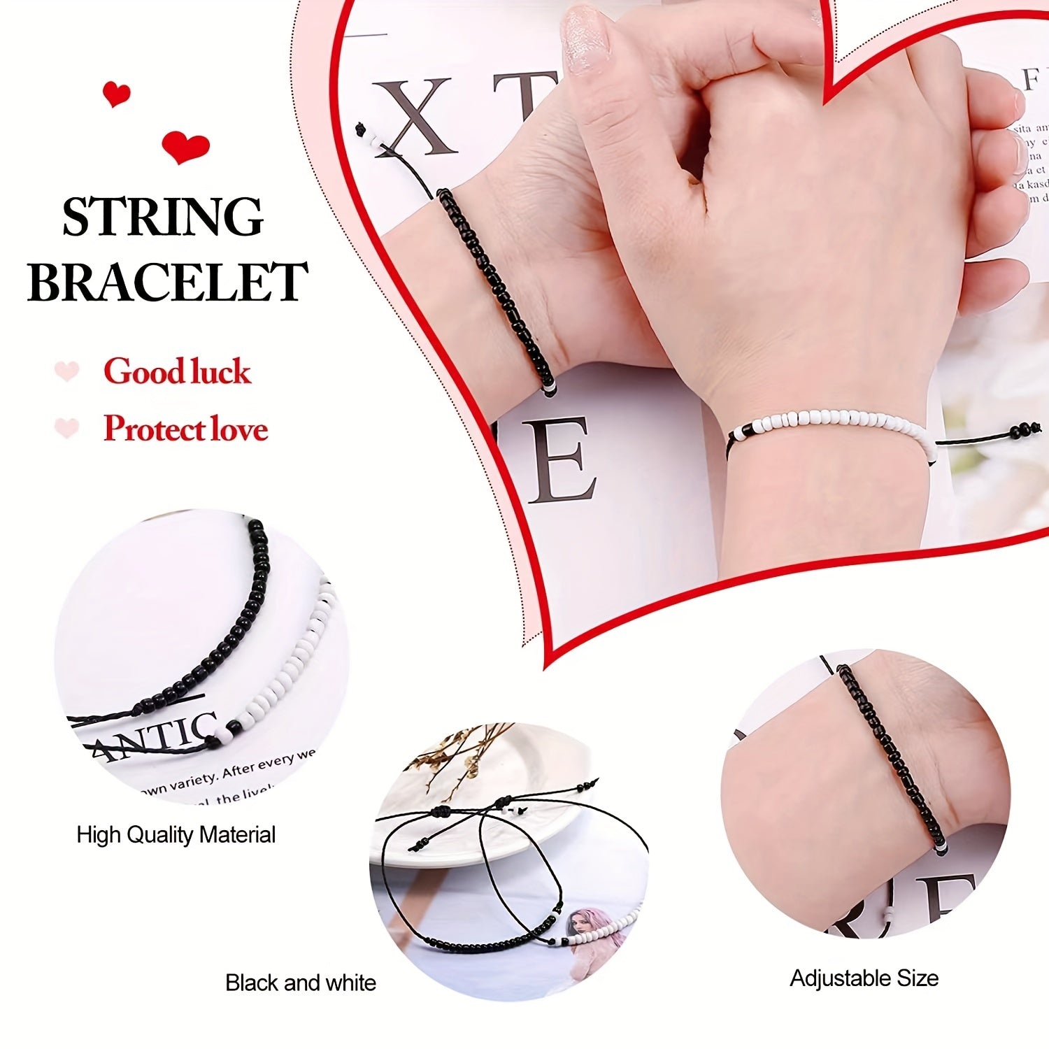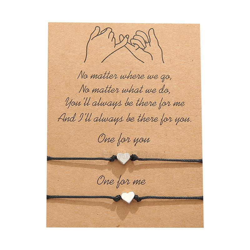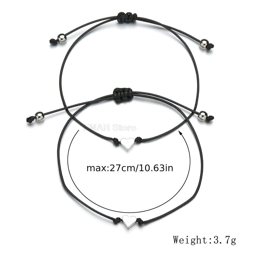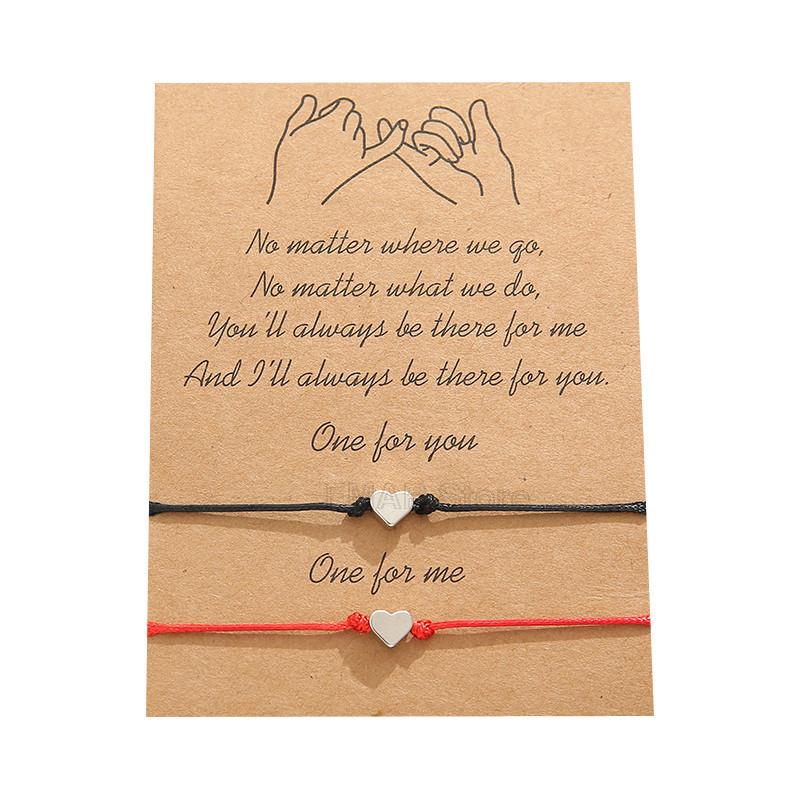 This 2-piece set of tiny heart charm bracelets features braiding rope with a wish card design. Perfect for couples, men, and women. Great as a gift for special occasions.
