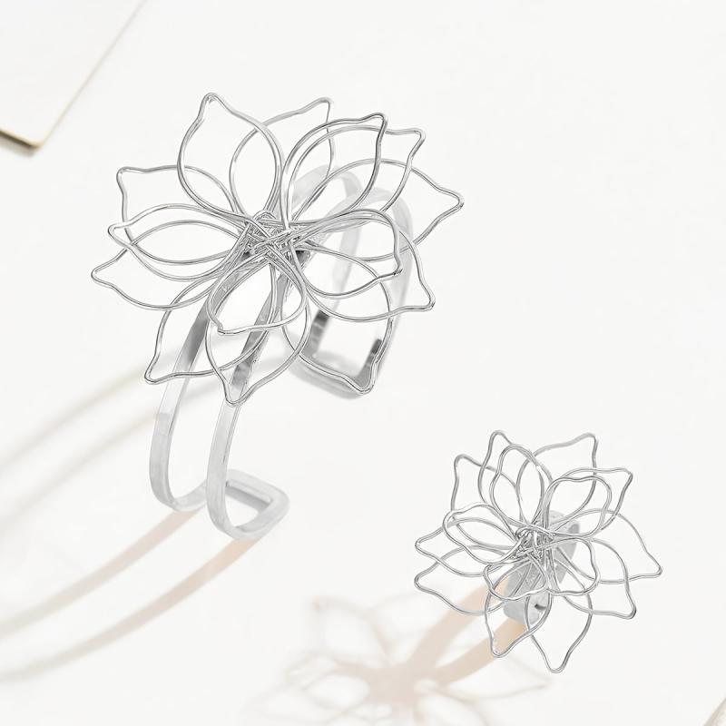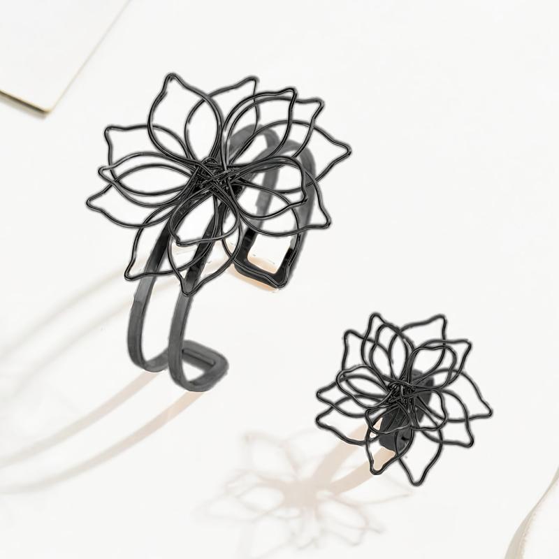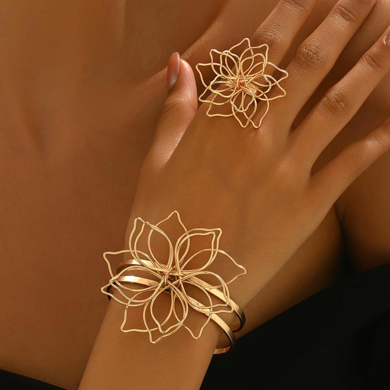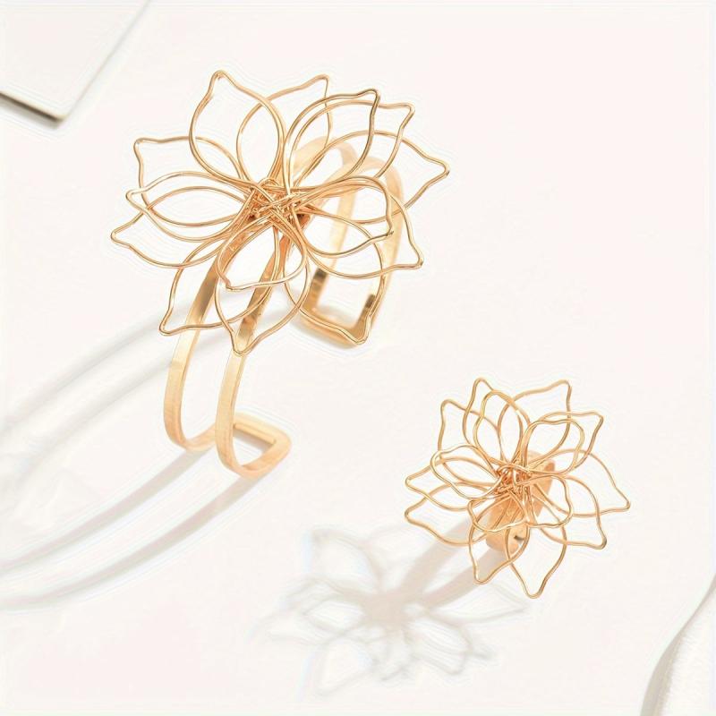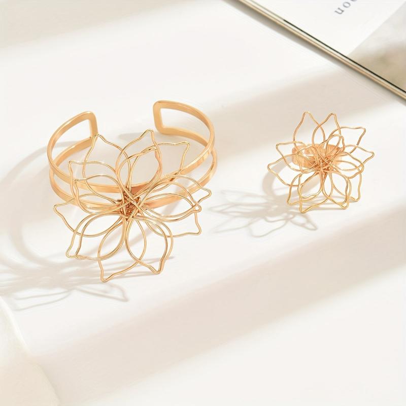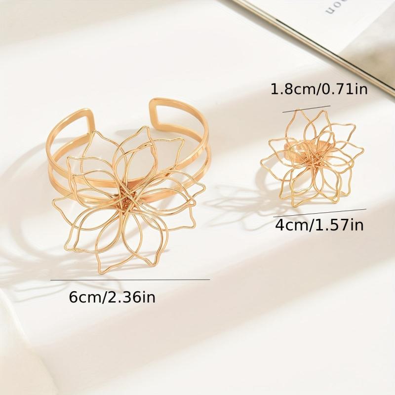 This vintage jewelry set features a hollow flower design, perfect for spring and summer wear. It includes an open bracelet and ring, making it a daily gift ornament for women.