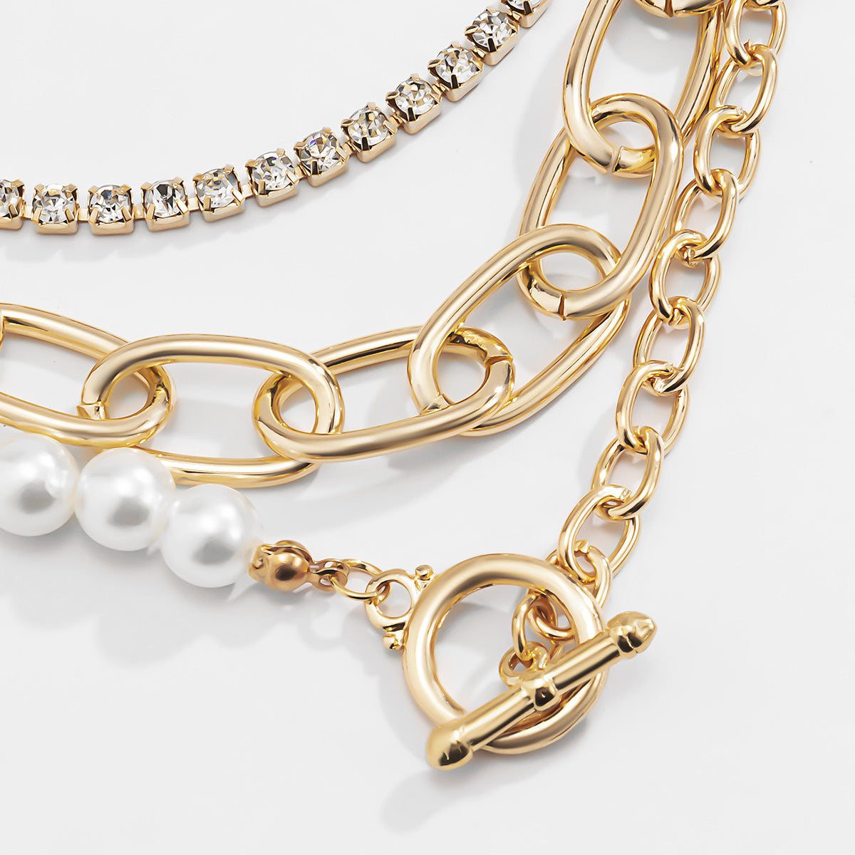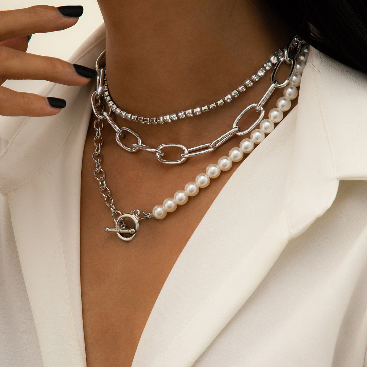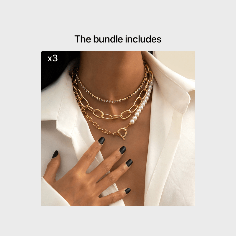 Add a touch of vintage glamour to any outfit with this 3-piece necklace set. Featuring bold chain links, faux diamonds, and pearls, these necklaces exude retro charm.
