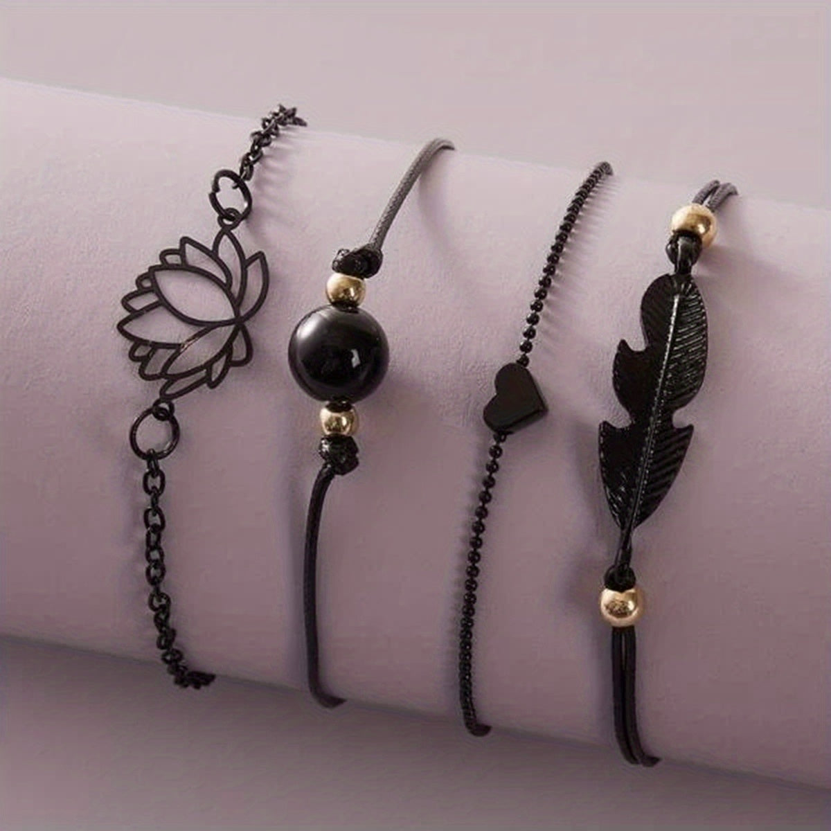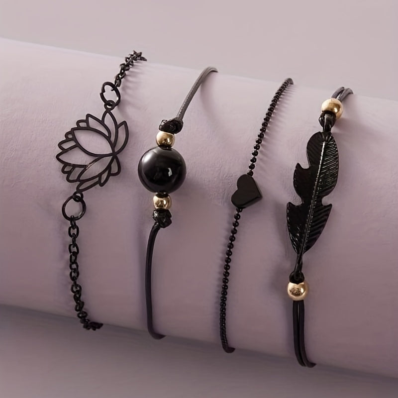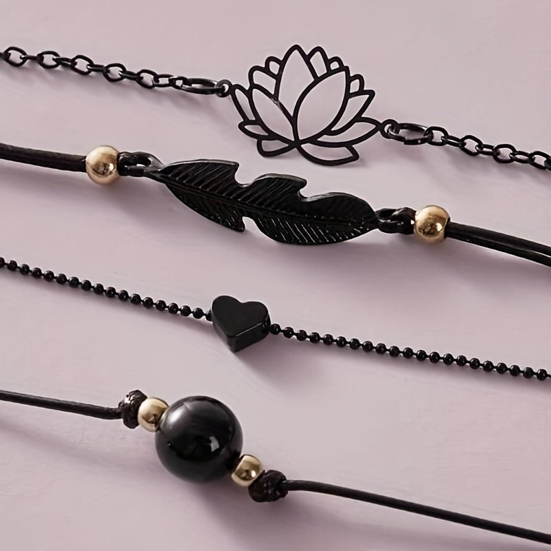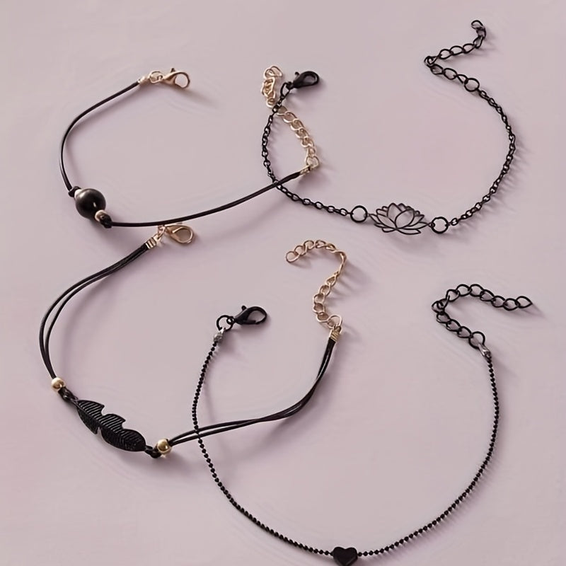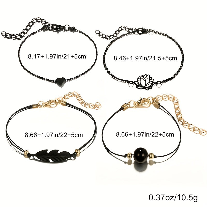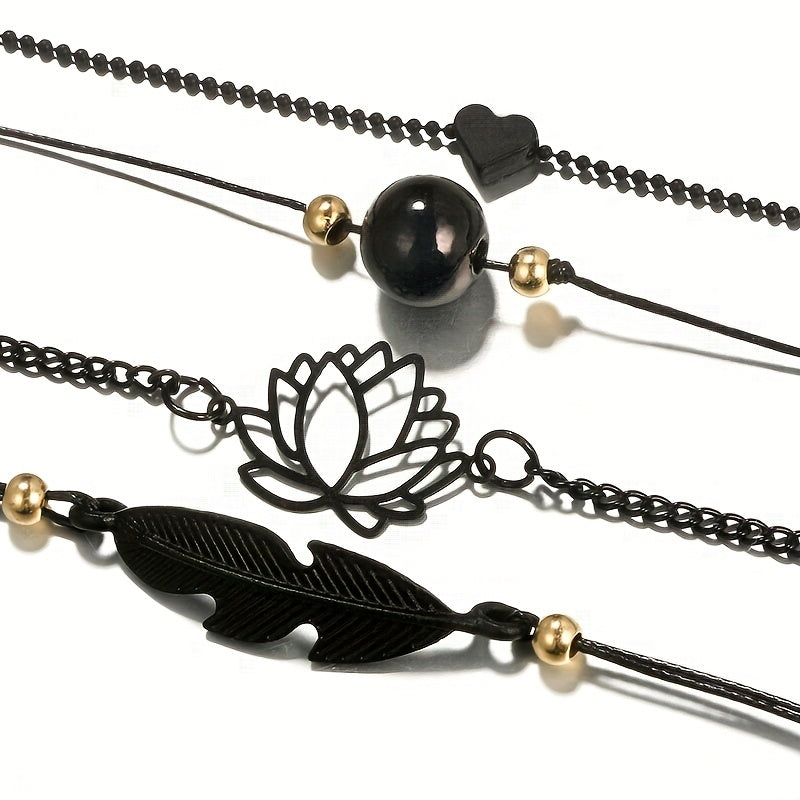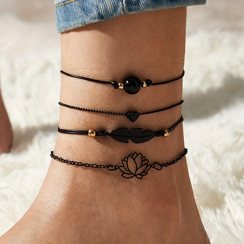 Elevate your style with this 4-piece stackable anklet set featuring delicate lotus chain design. Perfect accessory for any outfit and occasion.