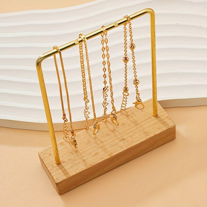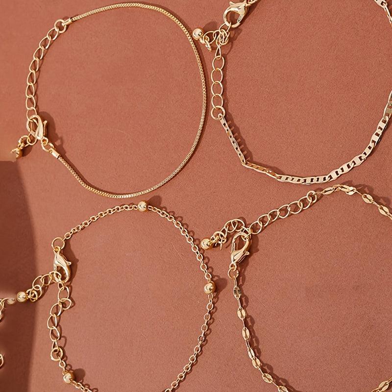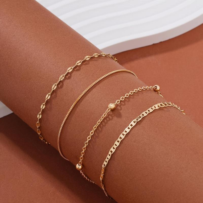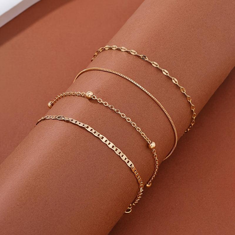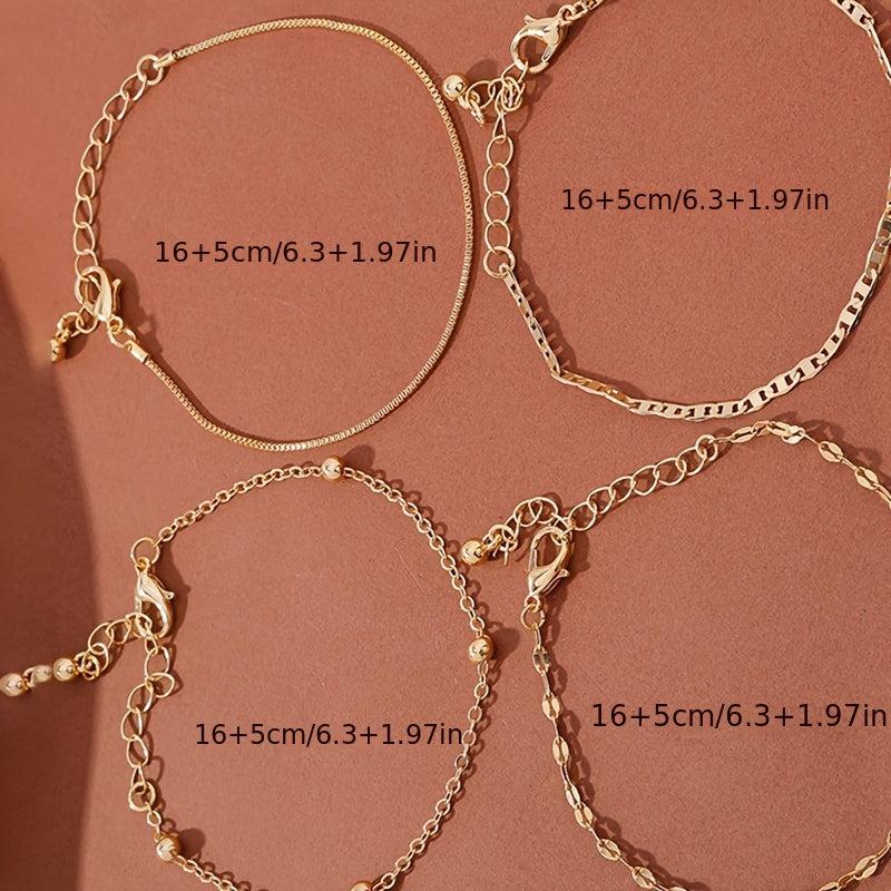 Add a touch of bohemian flair to your outfit with this set of 4 stackable golden chain bracelets. Perfect for leisure and casual wear, these dainty bracelets will complement any look.