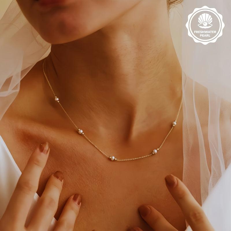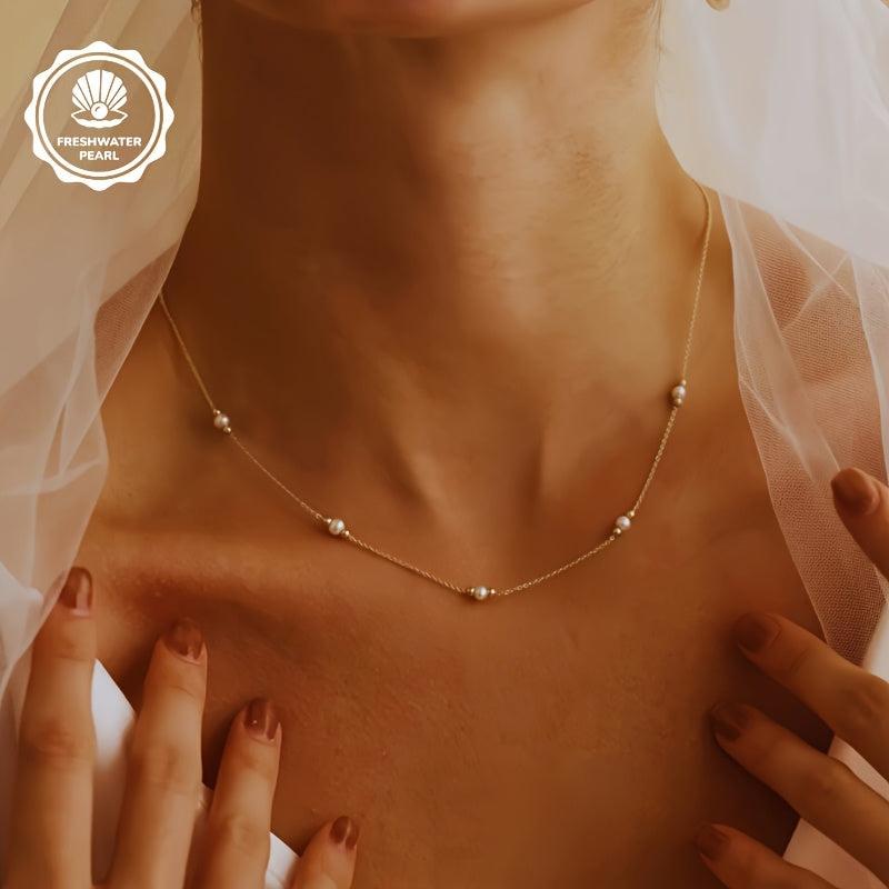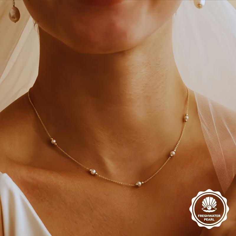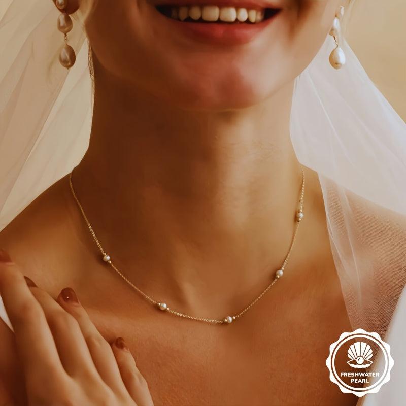 Elegant and high-end wedding jewelry featuring natural freshwater pearls. Perfect for brides on their special day. A beautiful collar necklace that adds a touch of light to your wedding ensemble. Ideal as a luxurious wedding gift.