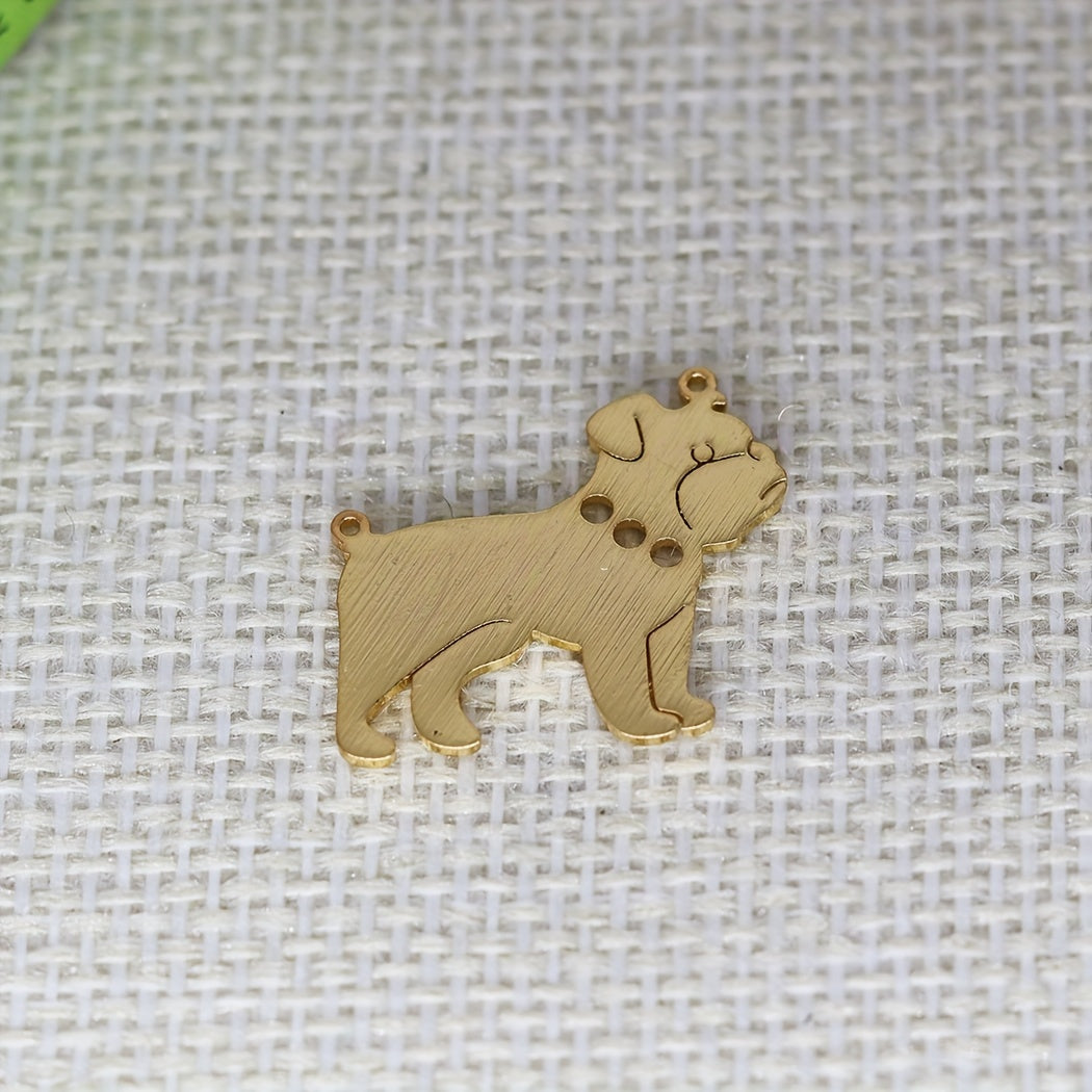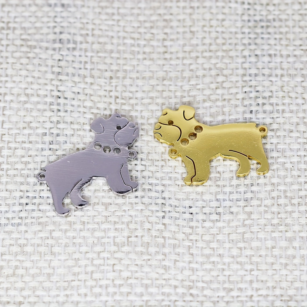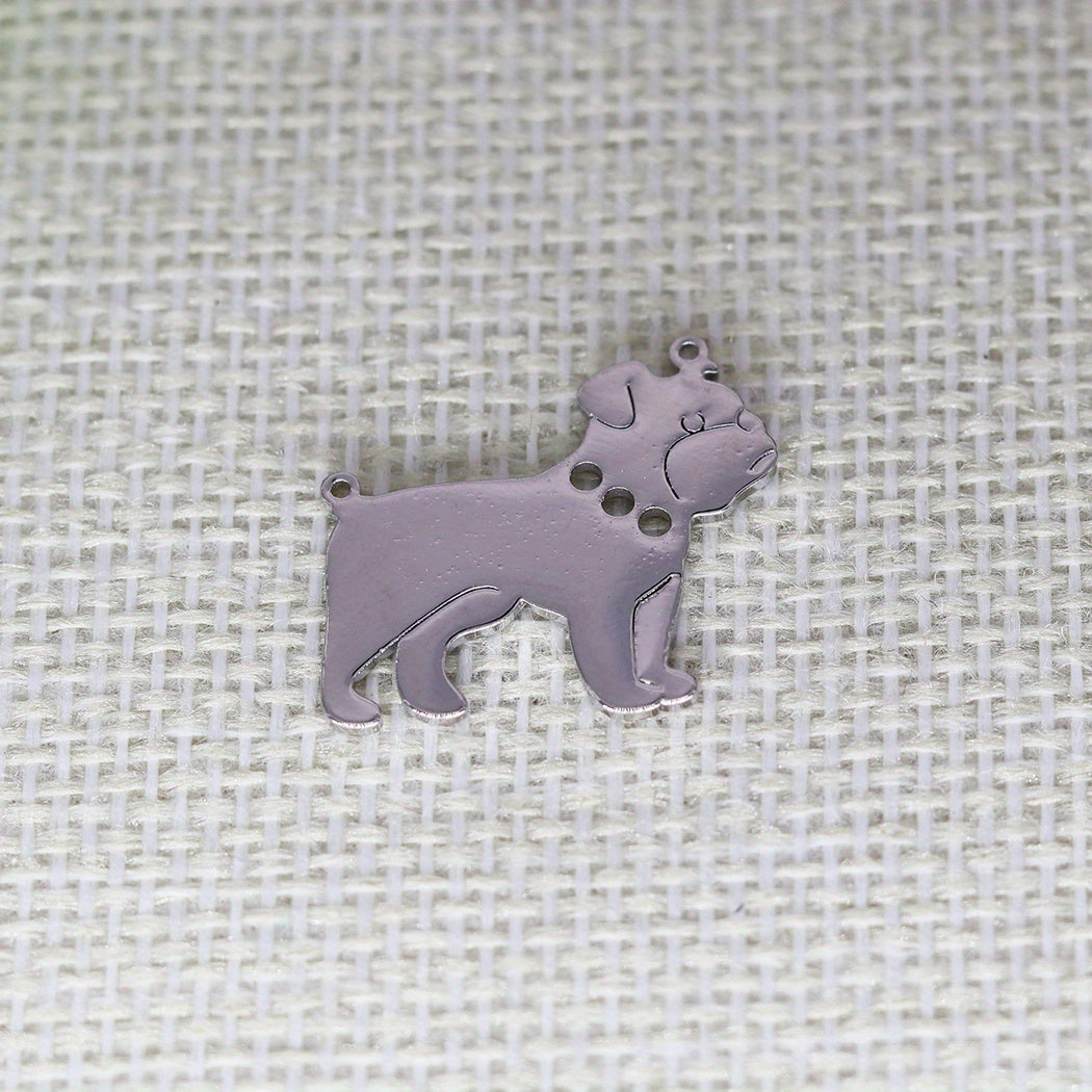 Stainless steel charm featuring an English Bulldog design for use in necklace, bracelet, and craft making projects.