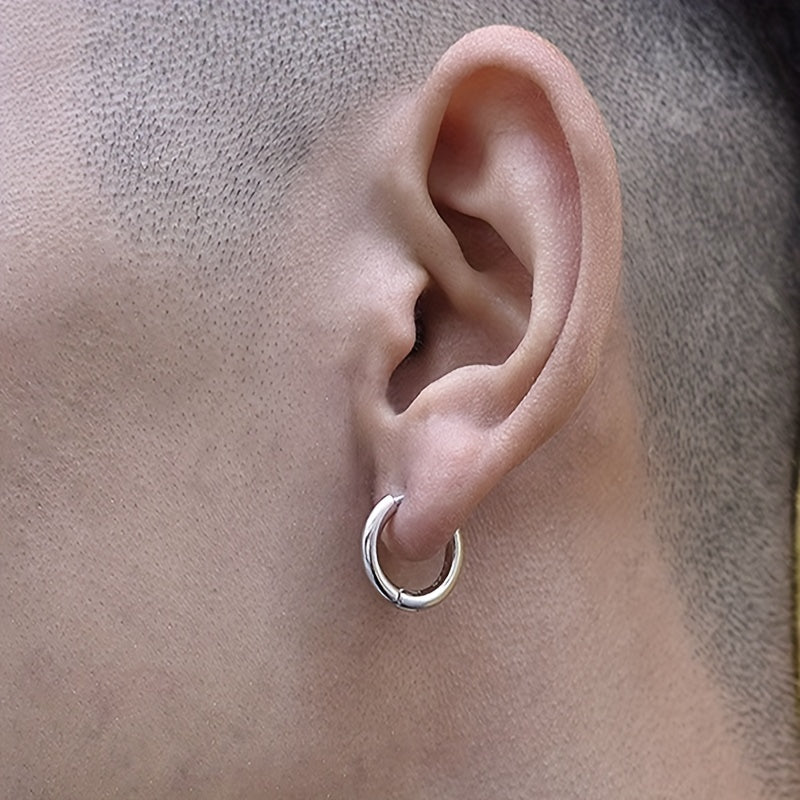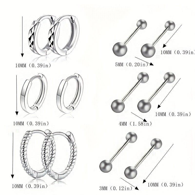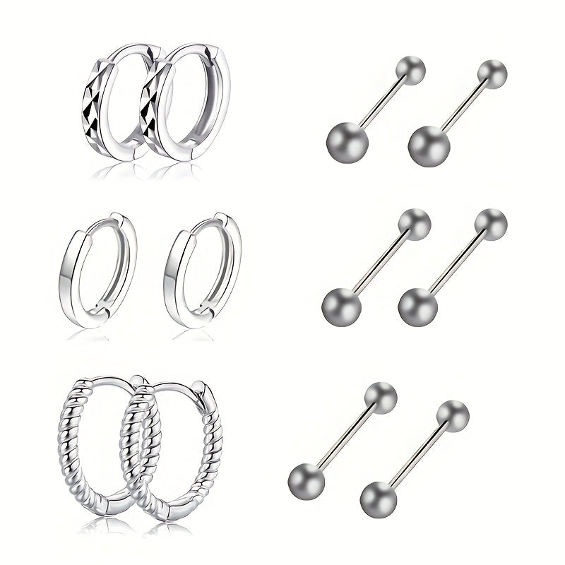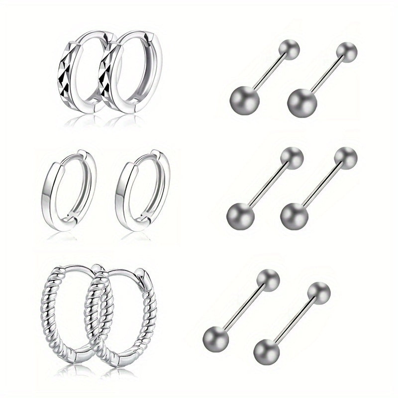 Enhance your style with this set of 6 pairs of punk earrings for men, including stud and hoop earrings.