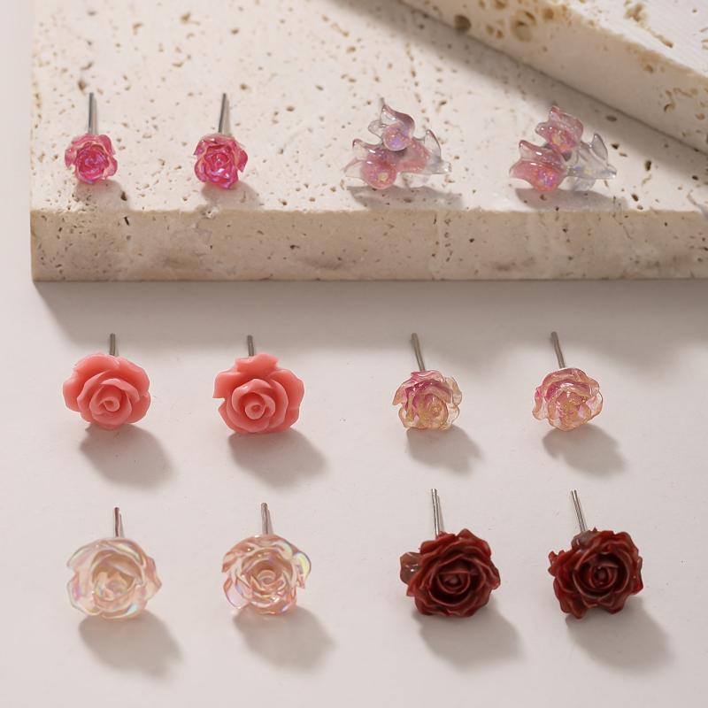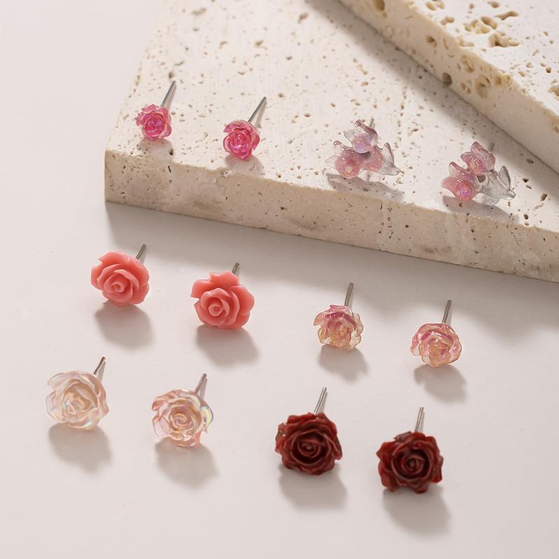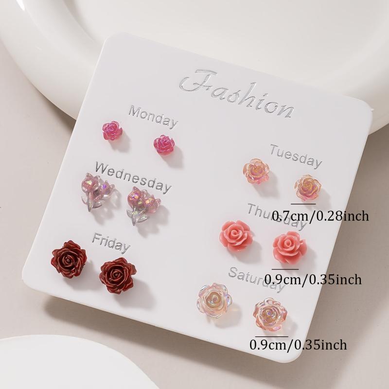 Elevate your style with this set of 6 pairs of fashionable resin flower love rose earrings. Perfect for daily wear and holiday jewelry.
