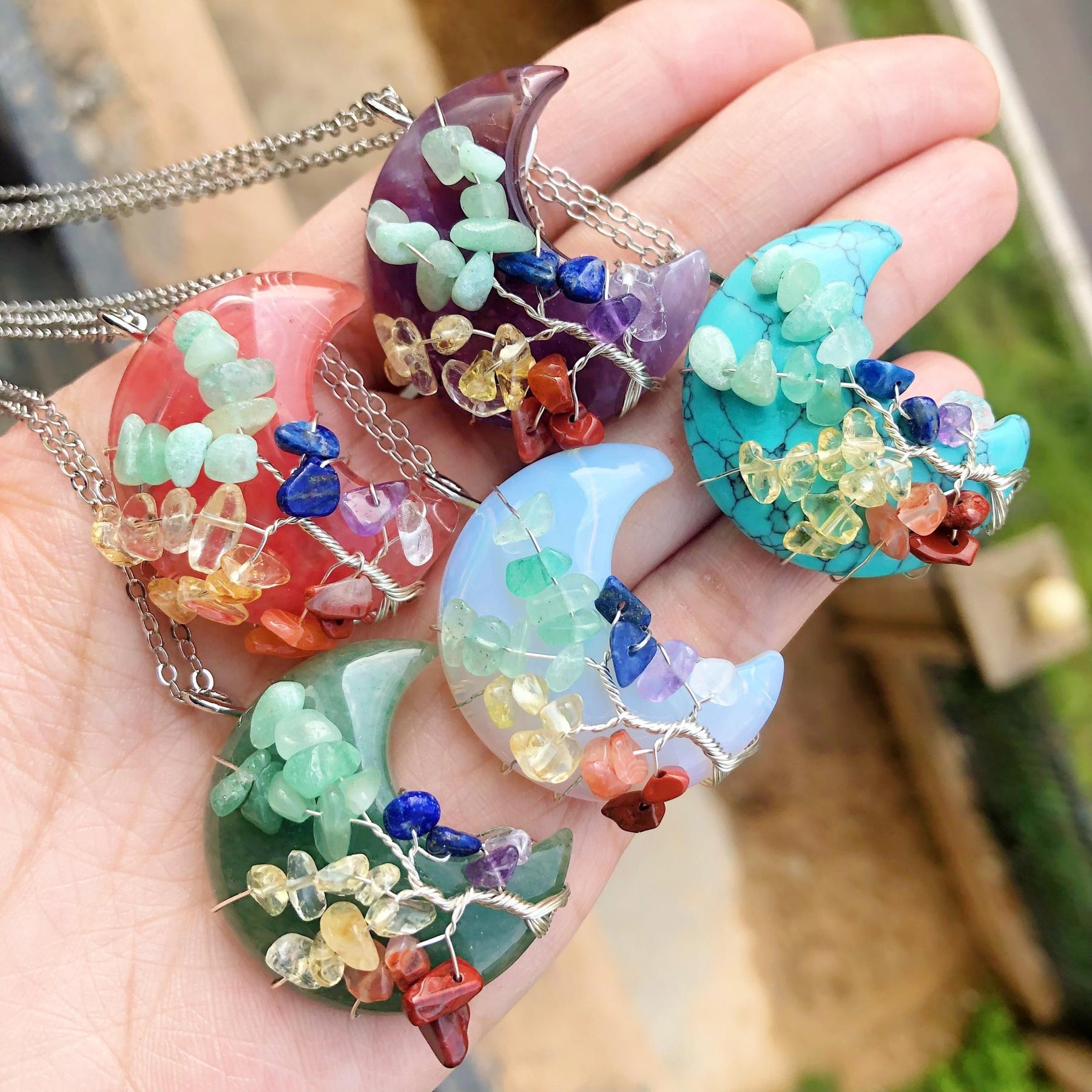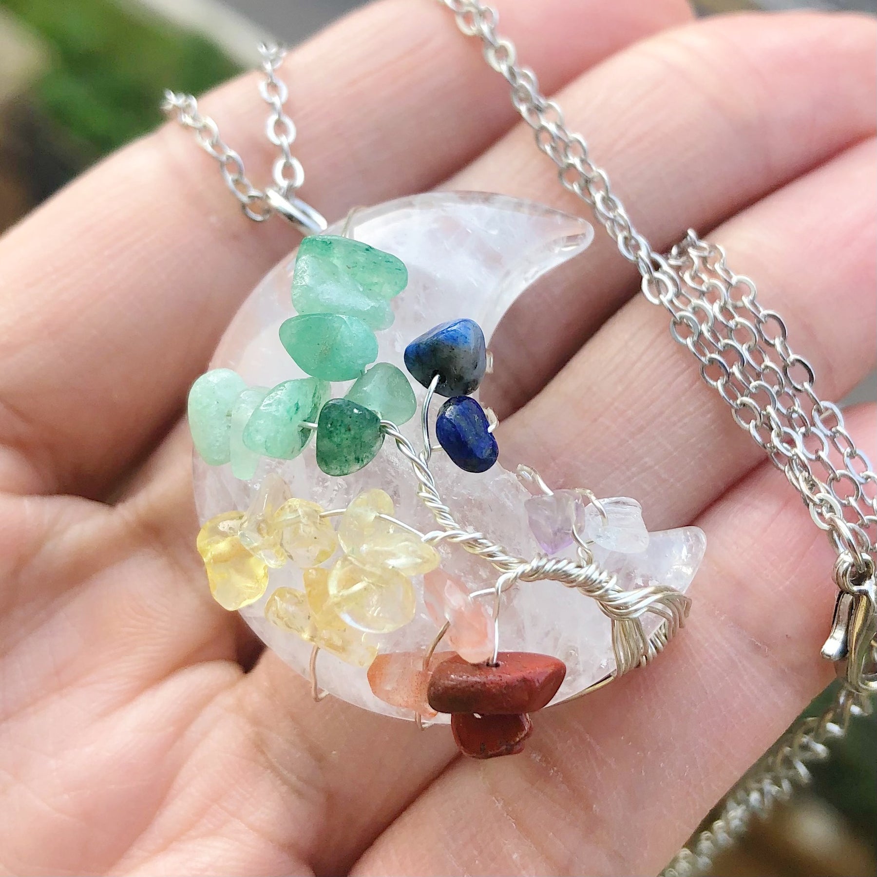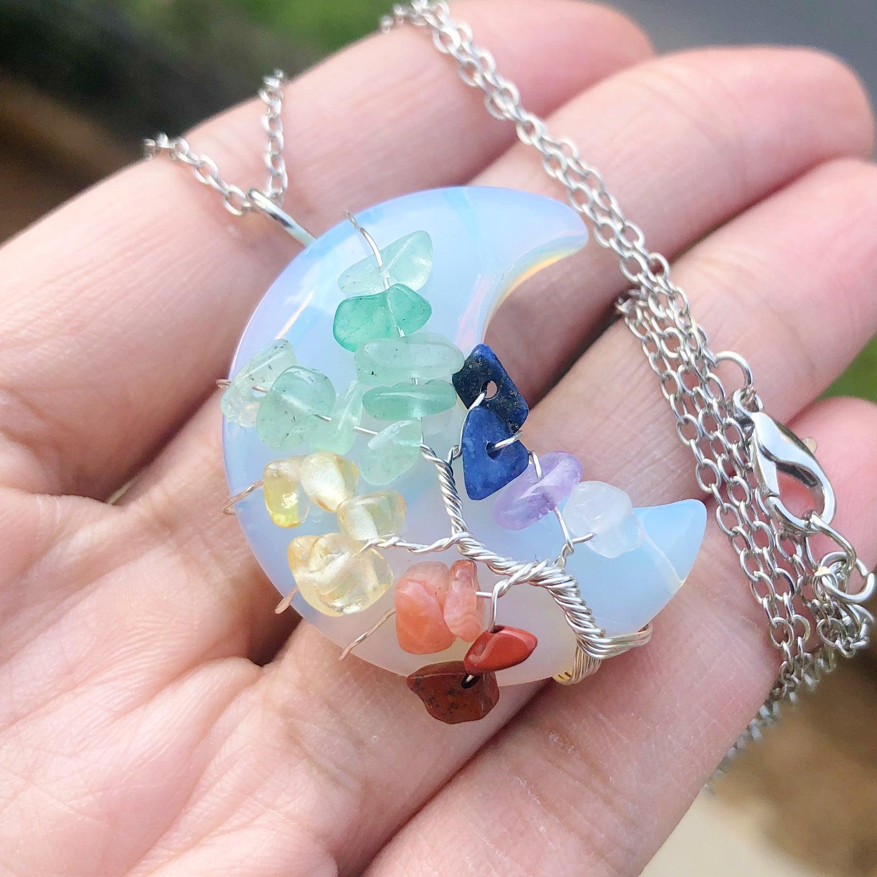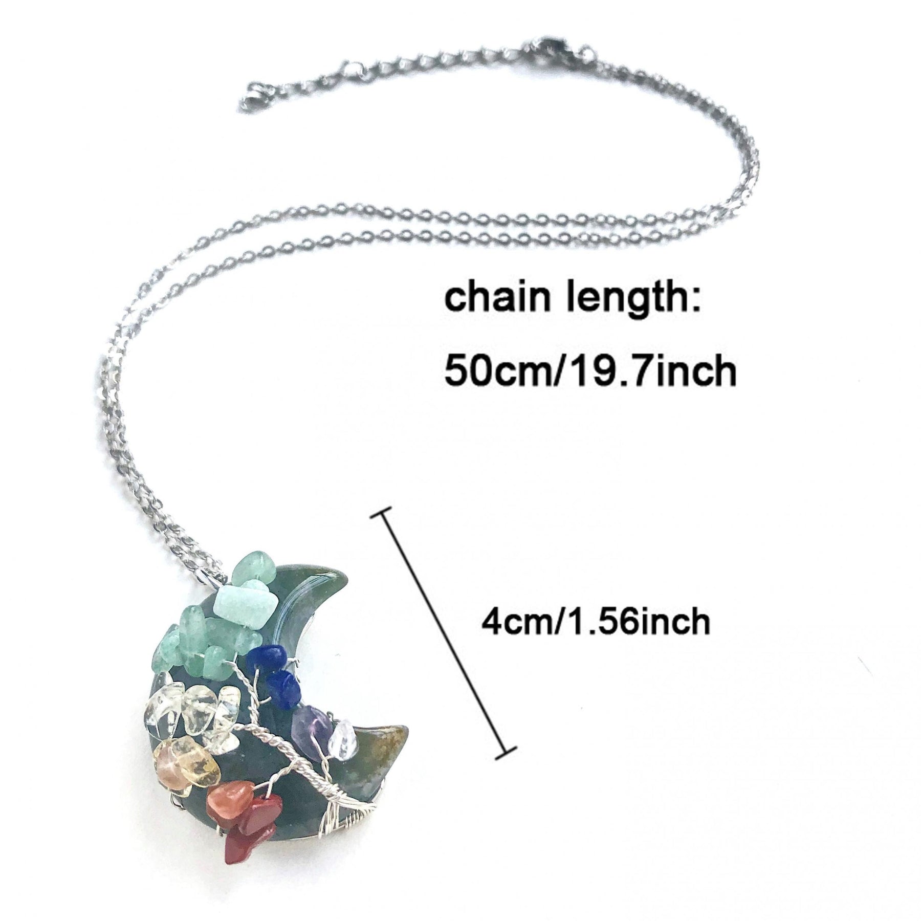 Embrace the healing power of chakras with this stunning agate gemstone tree of life moon pendant necklace. This amulet combines spiritual energy and style into one beautiful piece.