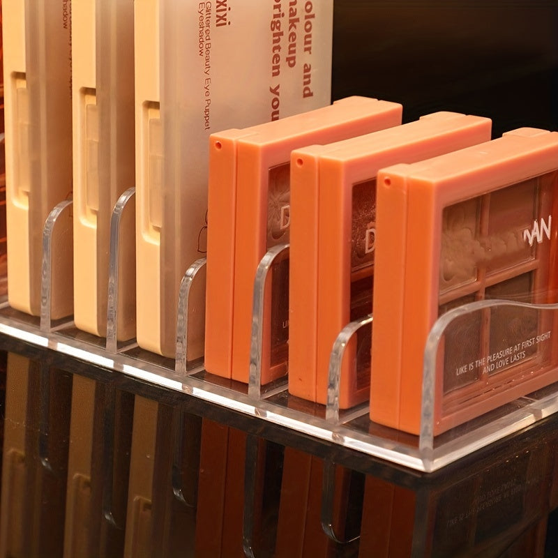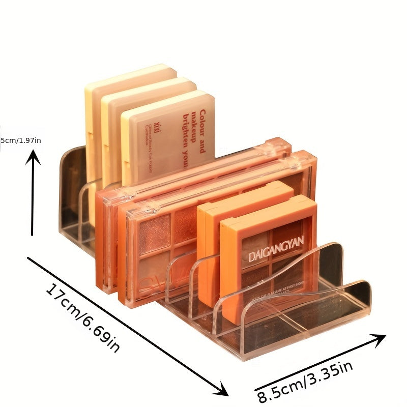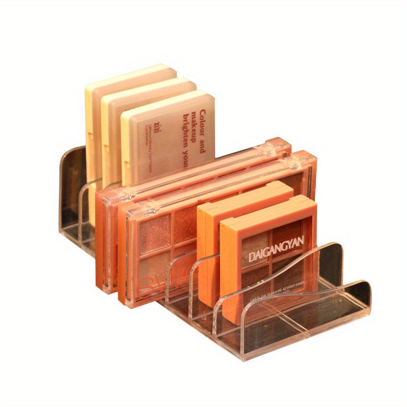Keep your eyeshadow palettes organized with this acrylic makeup holder that features 7 sections. Ideal for bathroom countertop or vanity storage.