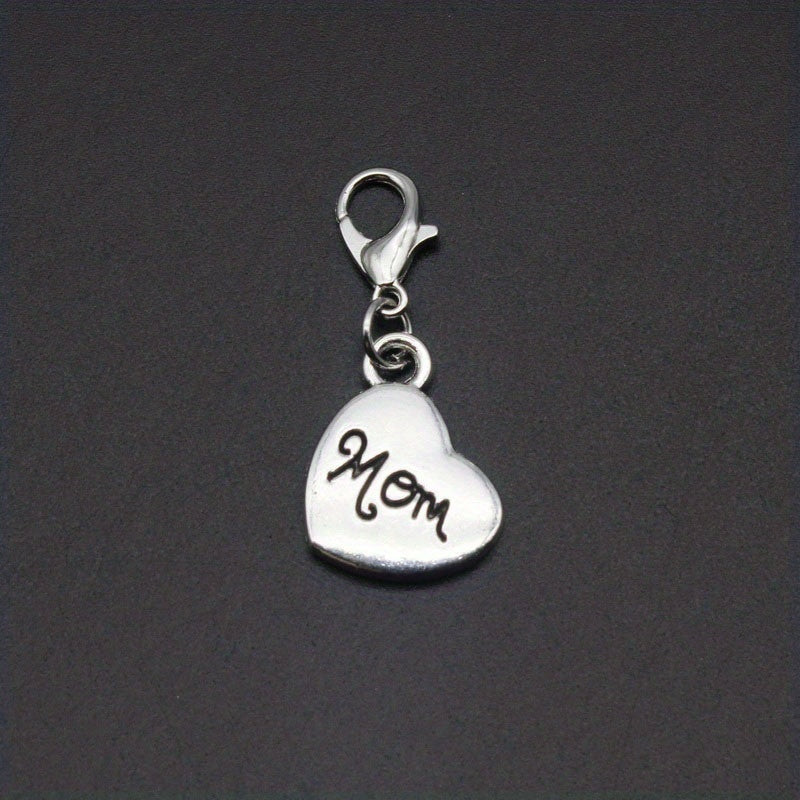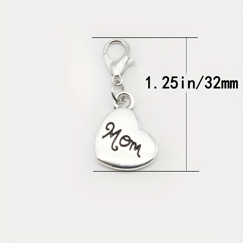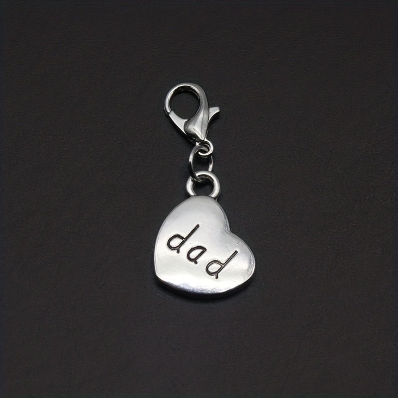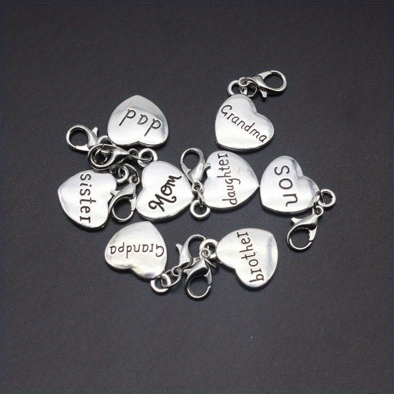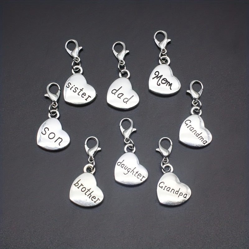 This set includes double-sided silvery alloy pendants for Dad, Mom, Son, Daughter, Grandfather, and Grandmother. The lobster clasp ensures easy attachment.