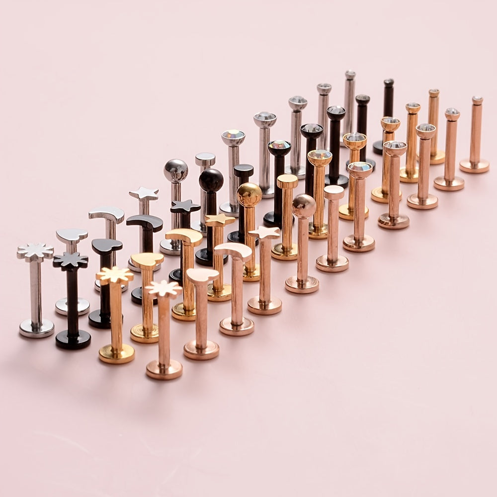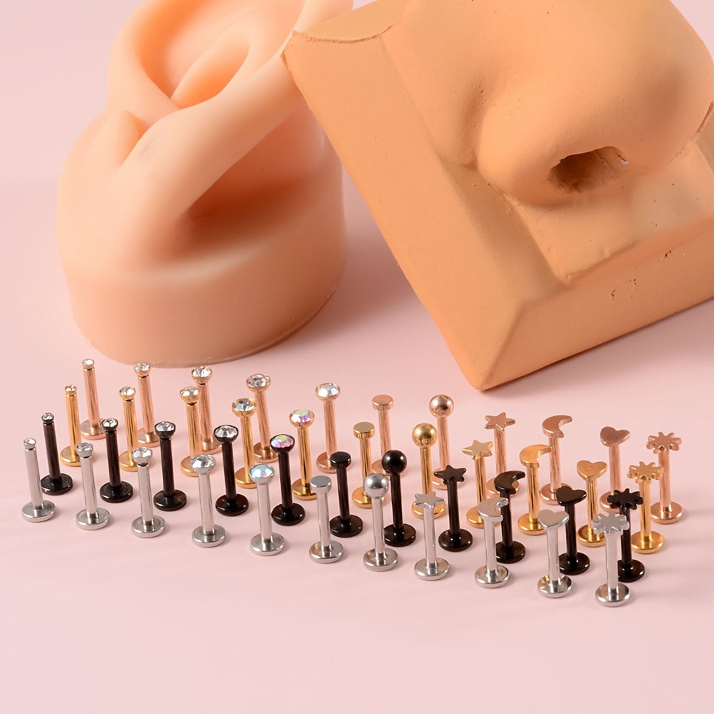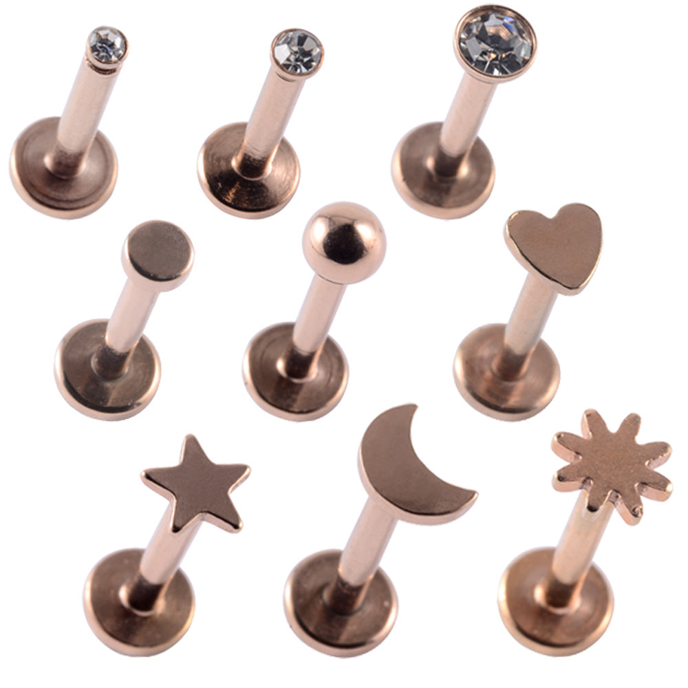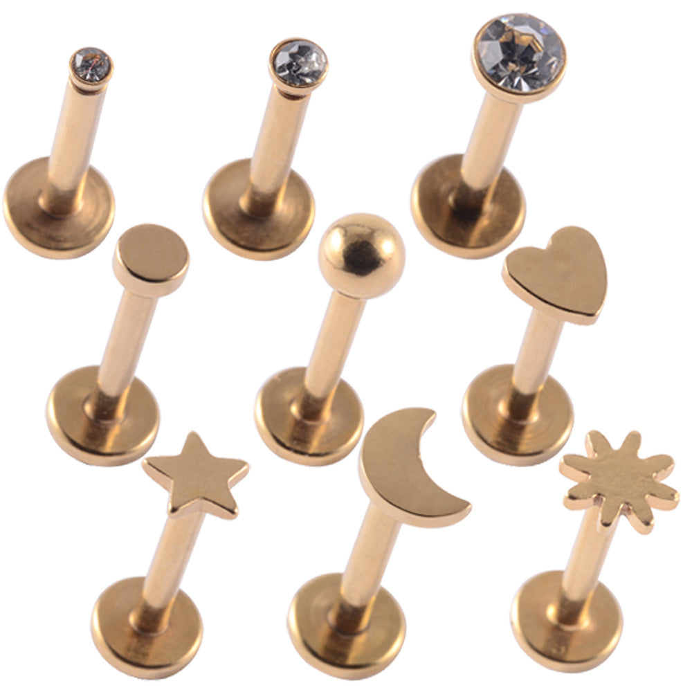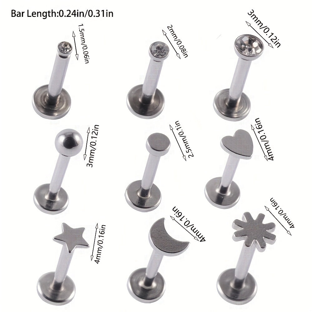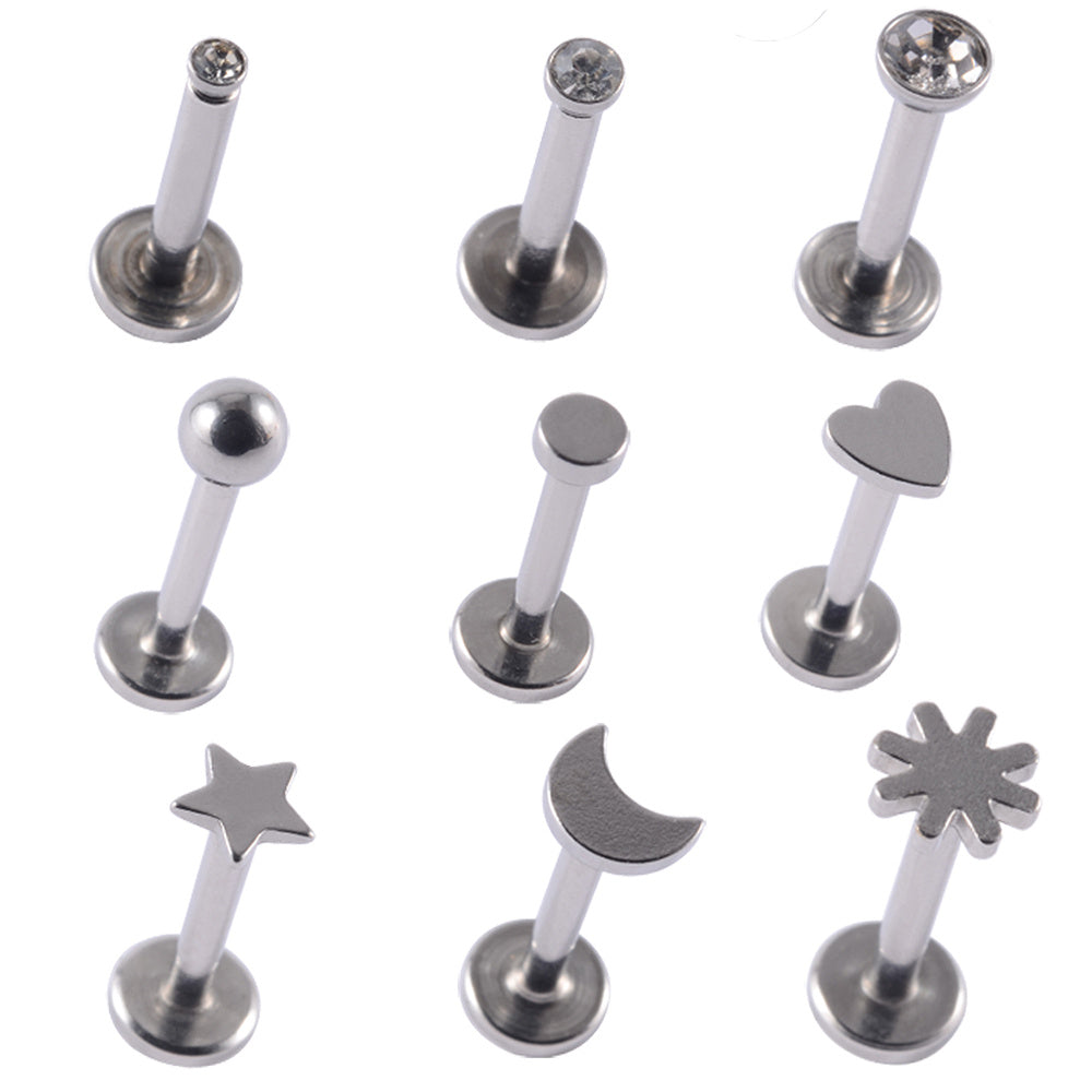 This set includes 9 pieces of body piercing jewelry in heart, moon, and ball designs. Perfect for tragus, cartilage, lip, and lobe piercings.
