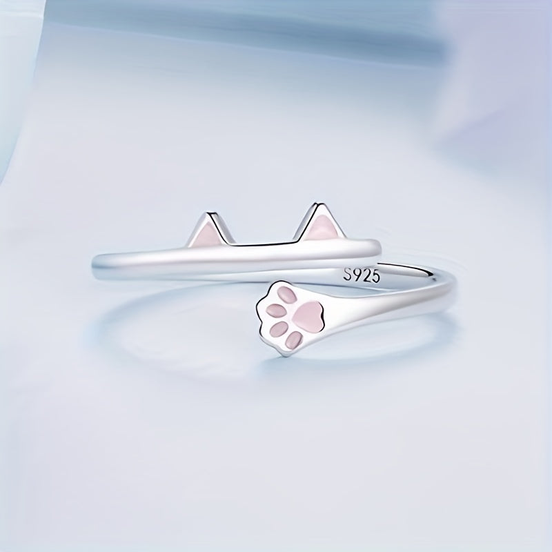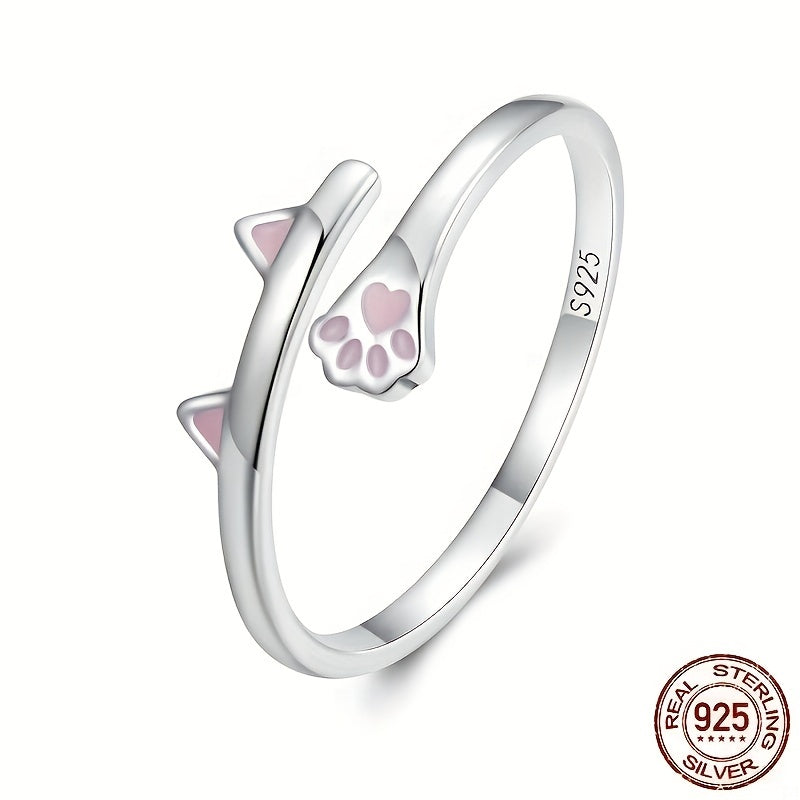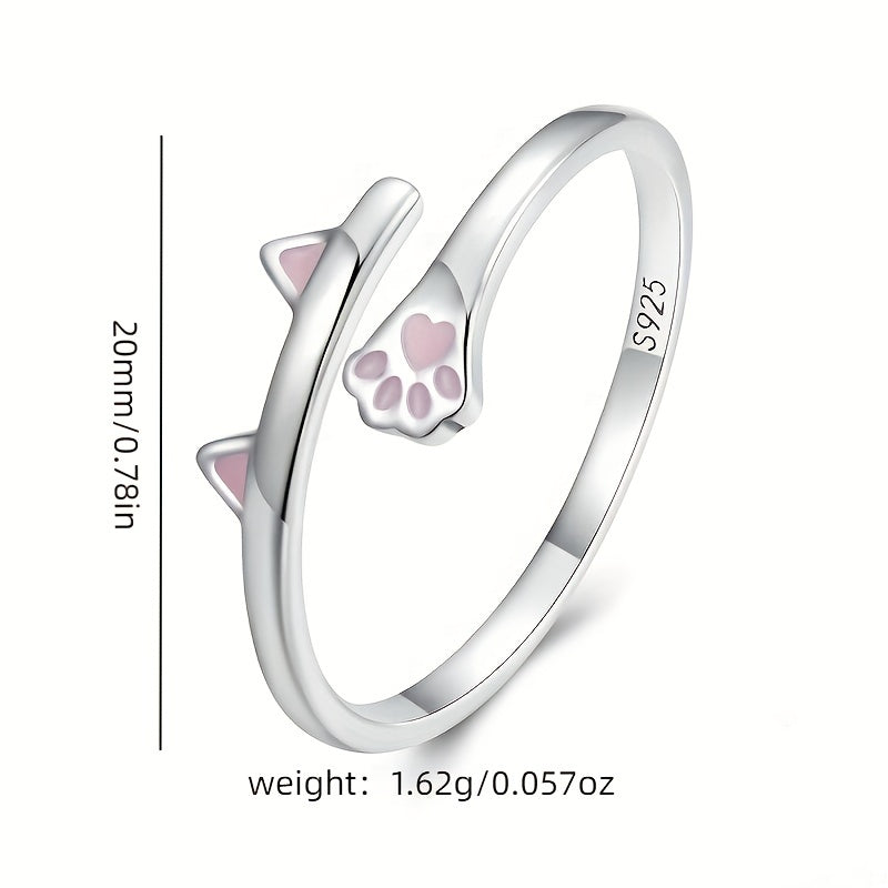 This adjustable cat ring is made of 925 sterling silver and features a cute pink cat paw design. Perfect for cat lovers and animal enthusiasts.