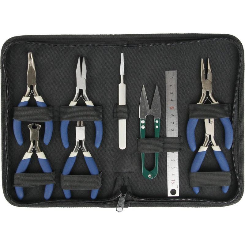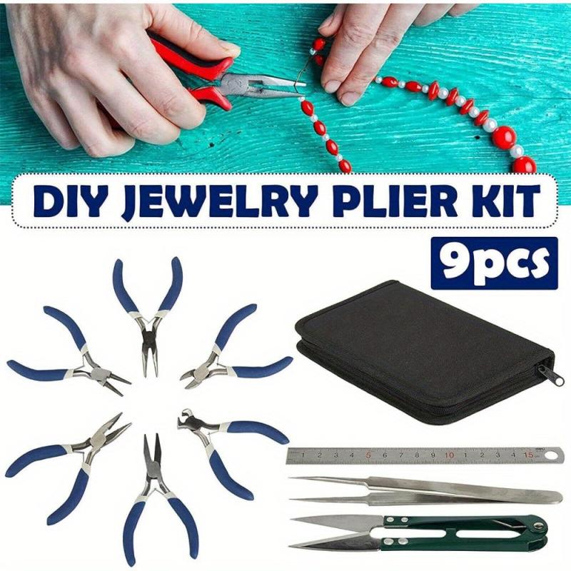 This 9-piece jewellery tool set includes various pliers, scissors, and ruler for jewellery making and repair. It comes in a convenient case for easy storage and organization.