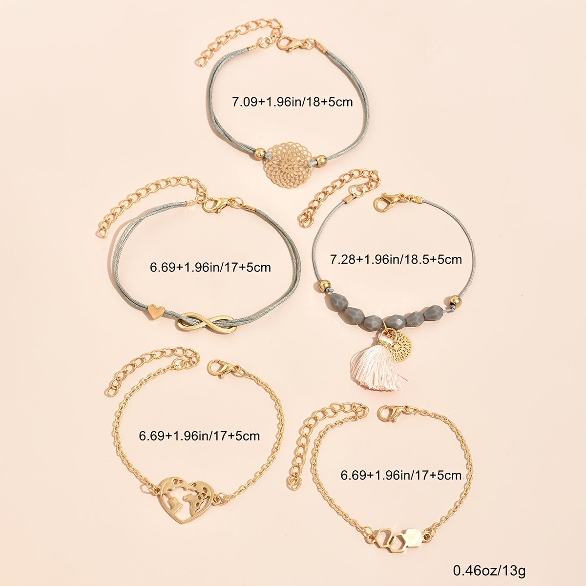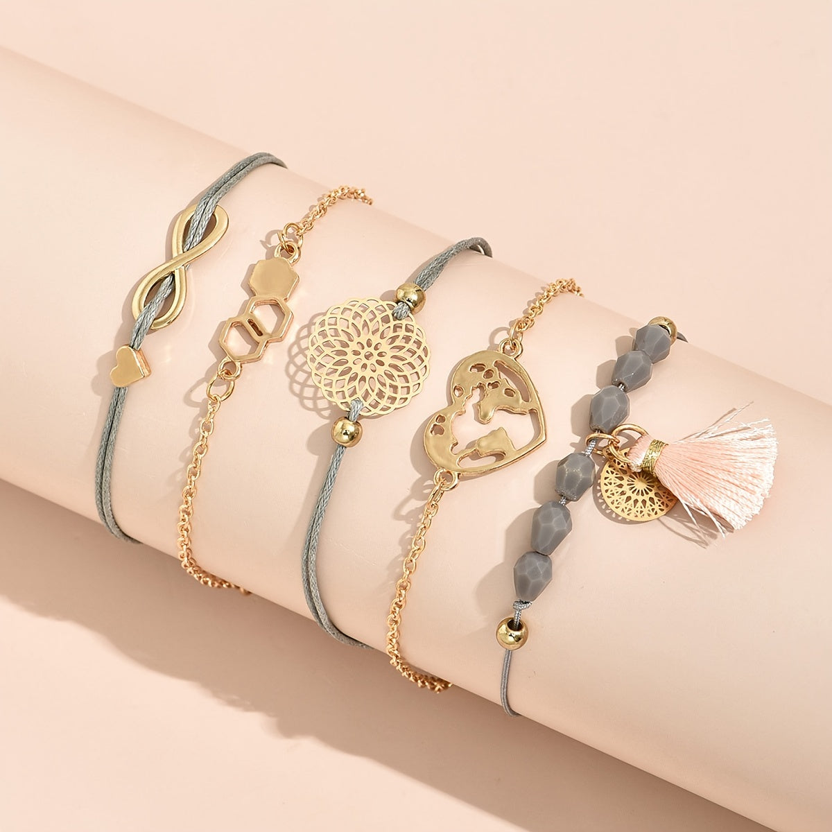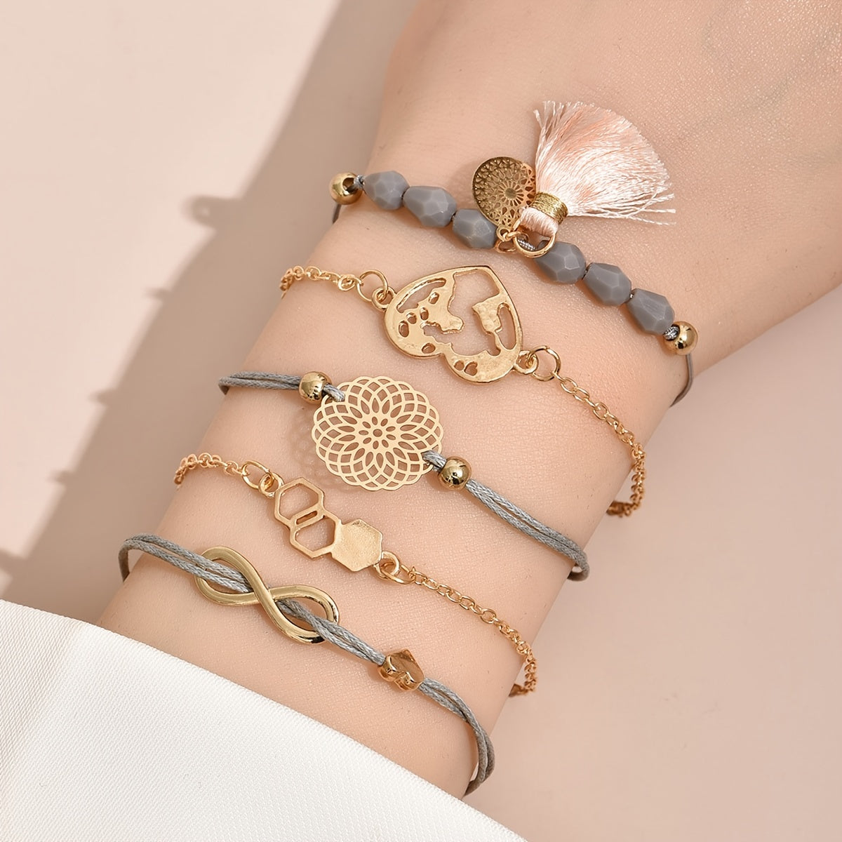Enhance your style with these charming adjustable charm pendent stack bracelets featuring heart and flower-shaped crystals. The perfect accessory for any occasion.