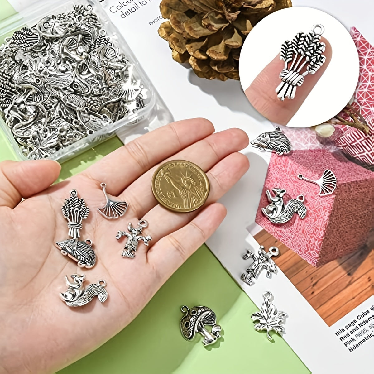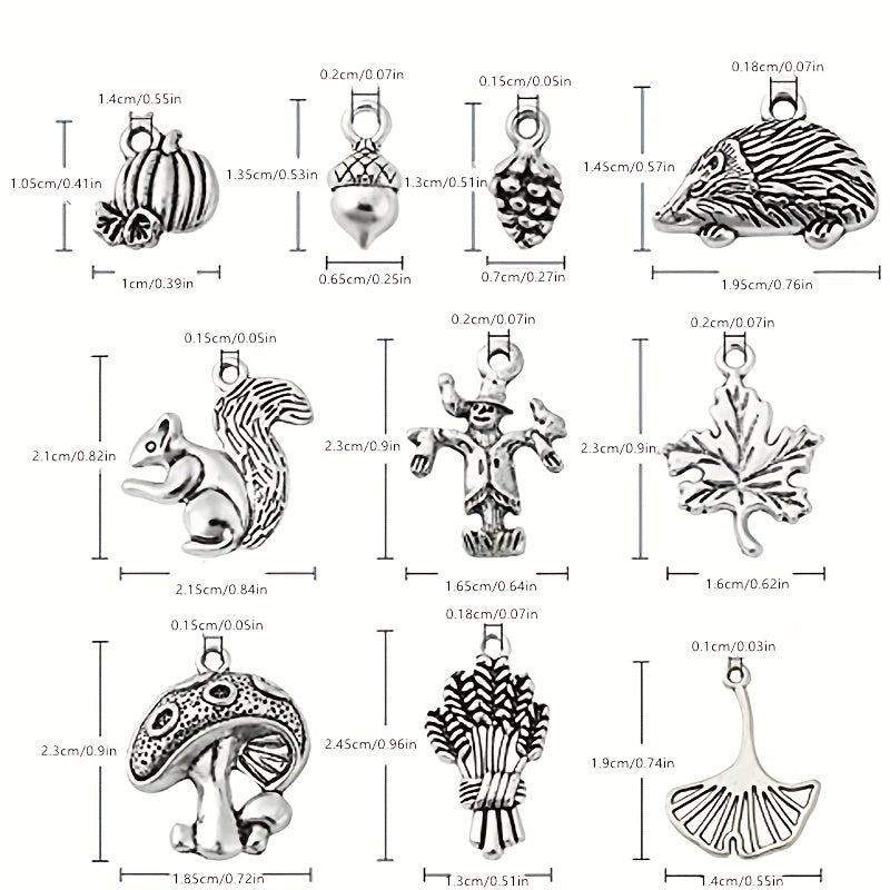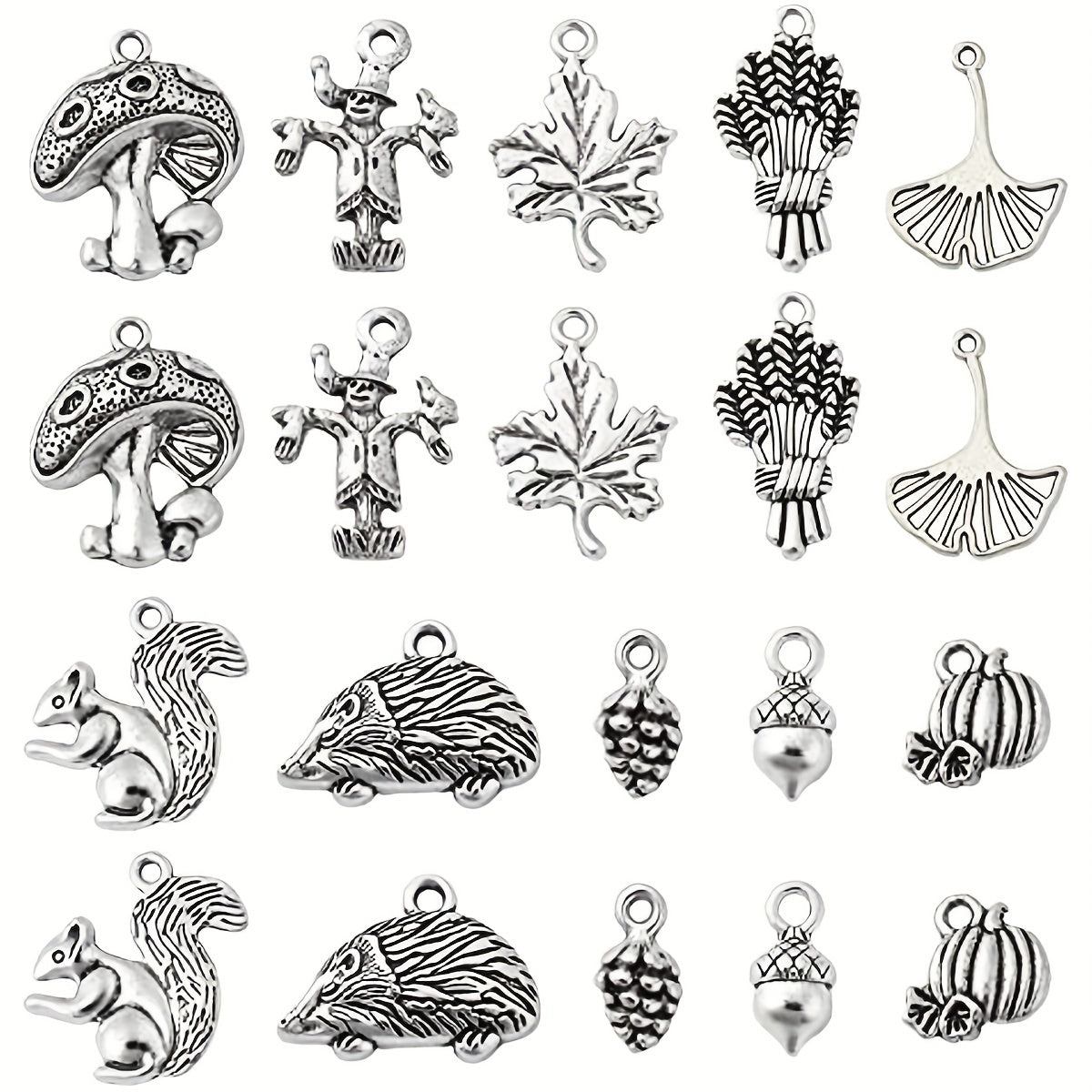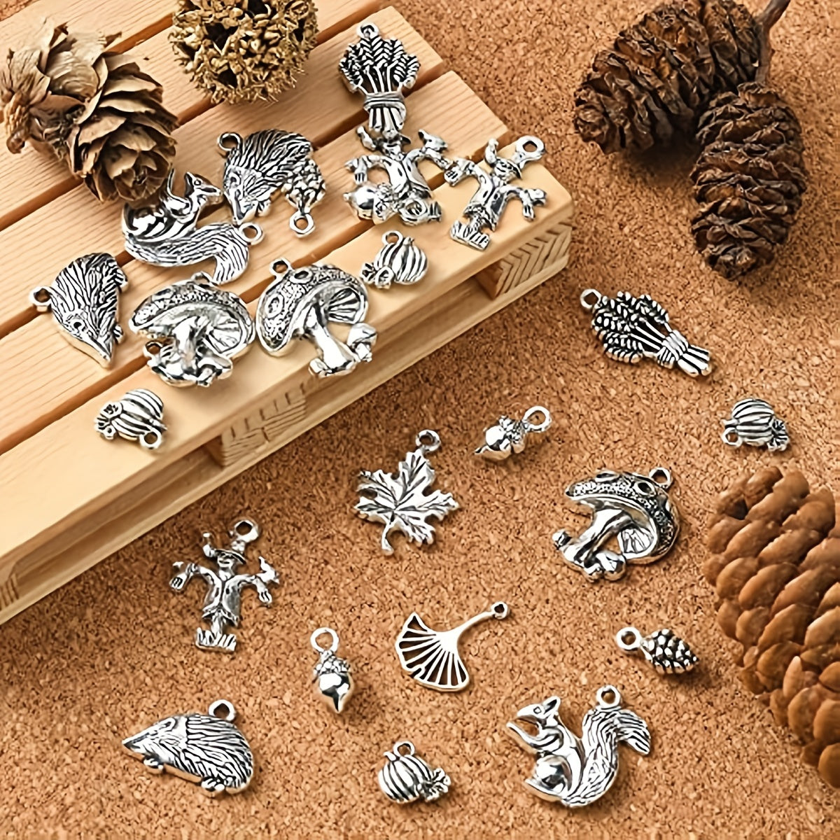 This set of alloy pendants features a mix of charming nature-inspired designs including leaves, wheat ears, squirrels, hedgehogs, and pine nuts. Perfect for crafting unique jewelry pieces.