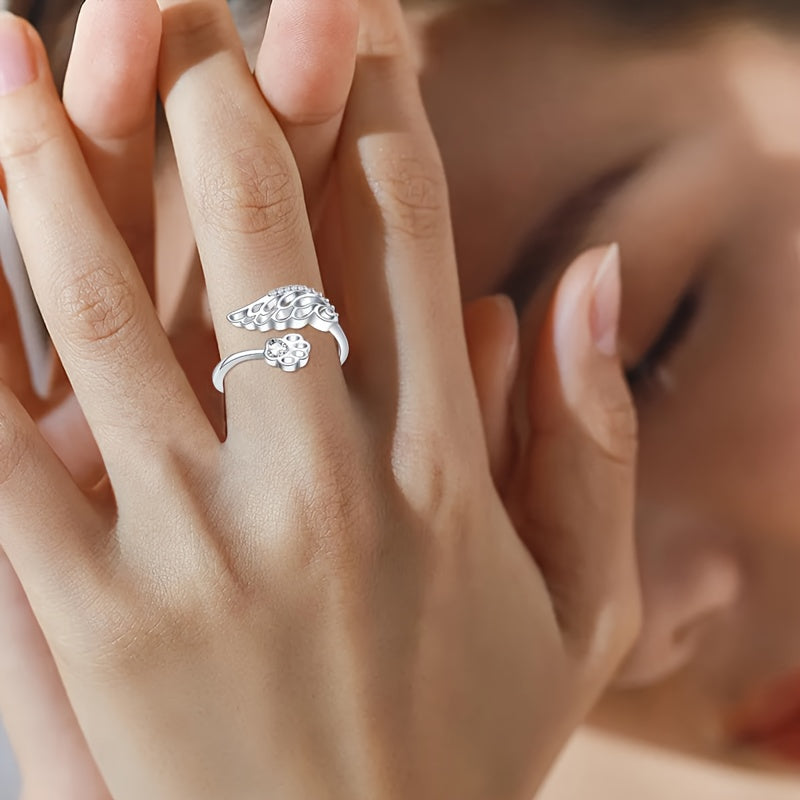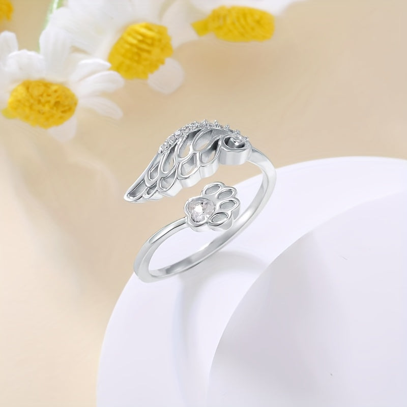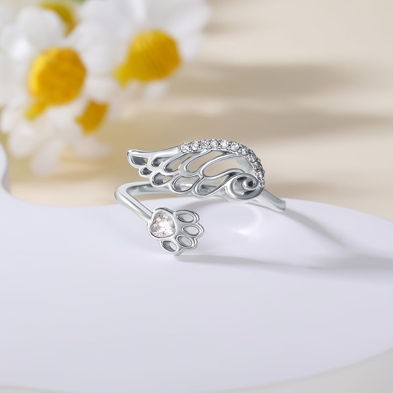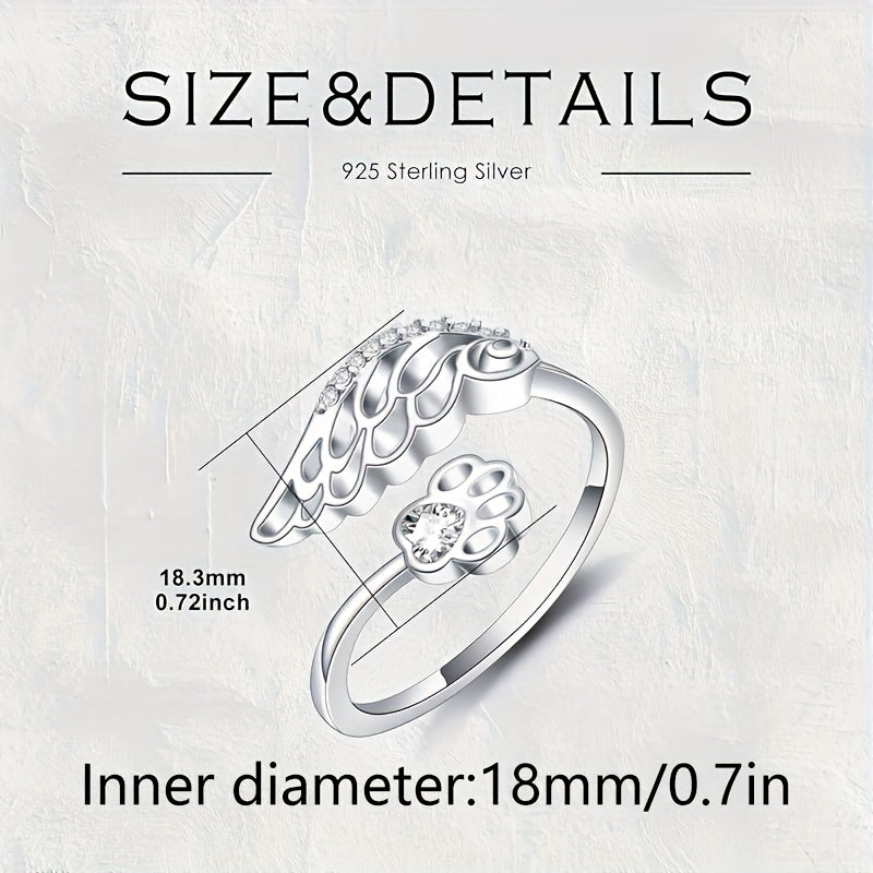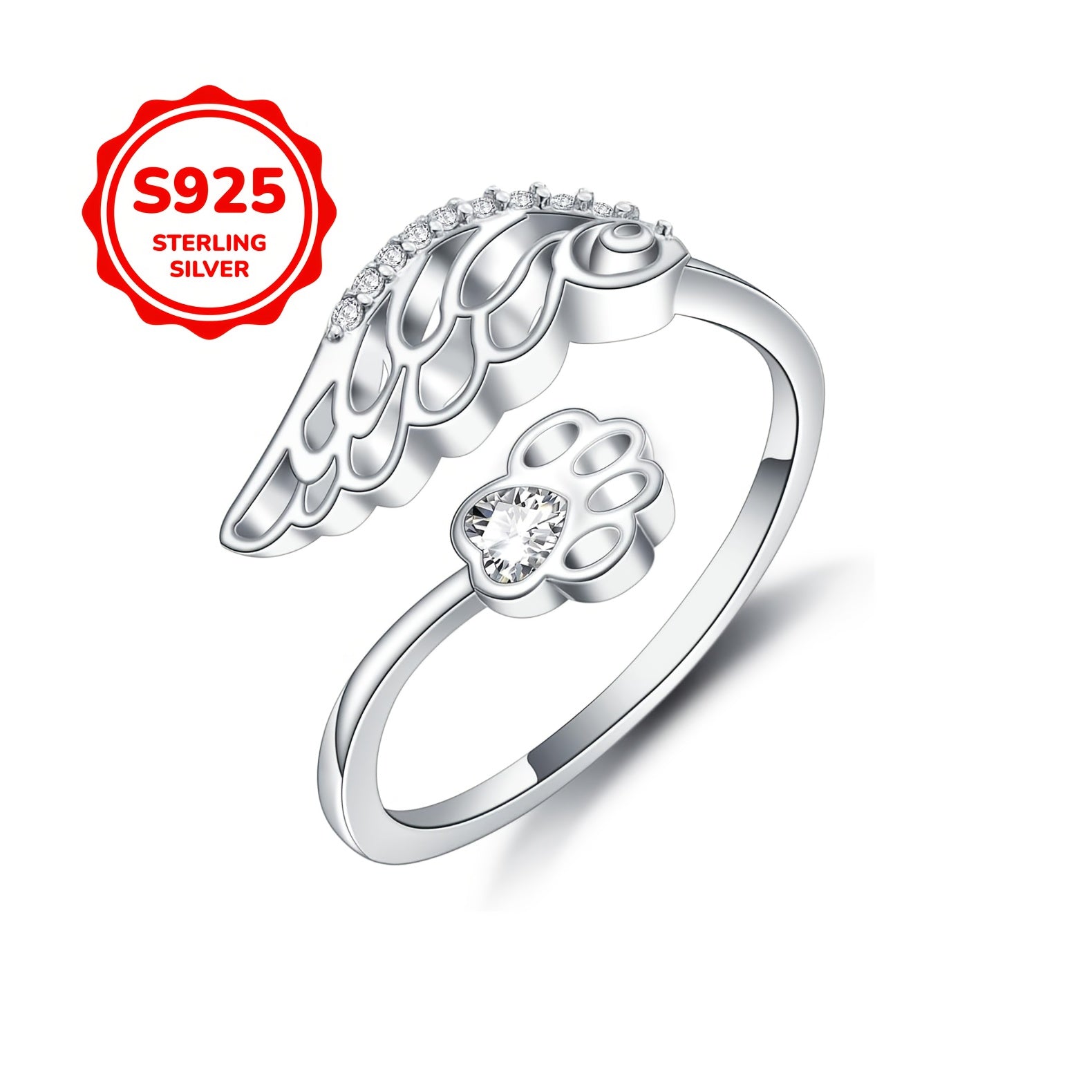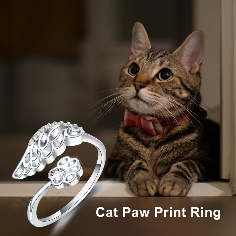 This angel wing ring features a love cat footprint design, made of S925 pure silver. It is a retro-style open adjustable ring that is suitable for daily wear and makes a great jewelry piece for women with hypoallergenic properties.